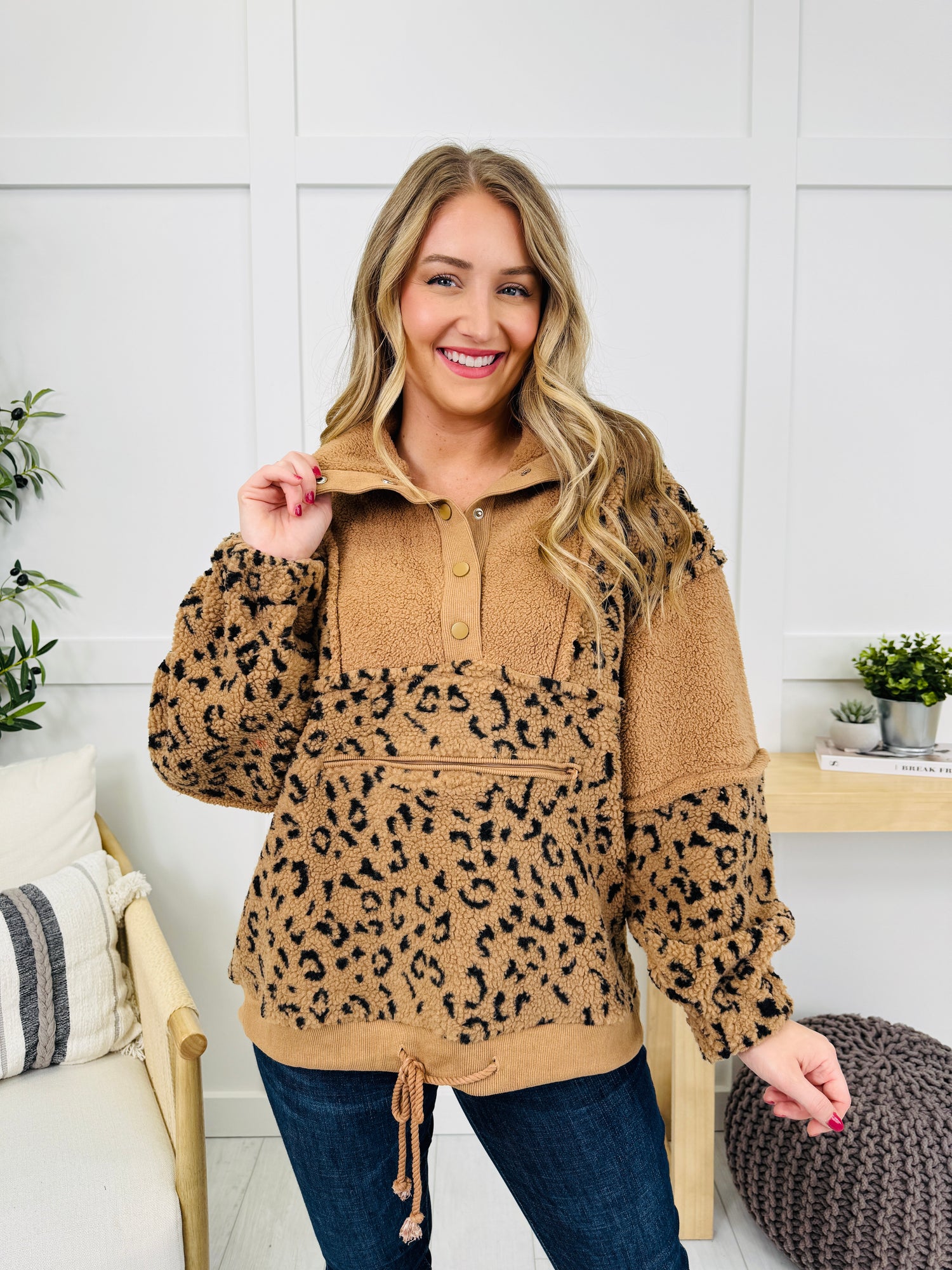 This ultra-soft fleece pullover combines comfort and style with its cozy, sherpa-like fabric and eye-catching leopard print accents. Featuring a half-snap collar and adjustable drawstring hem, it’s perfect for layering during cooler months. Whether you’re lounging or running errands, this trendy piece offers both warmth and flair.
