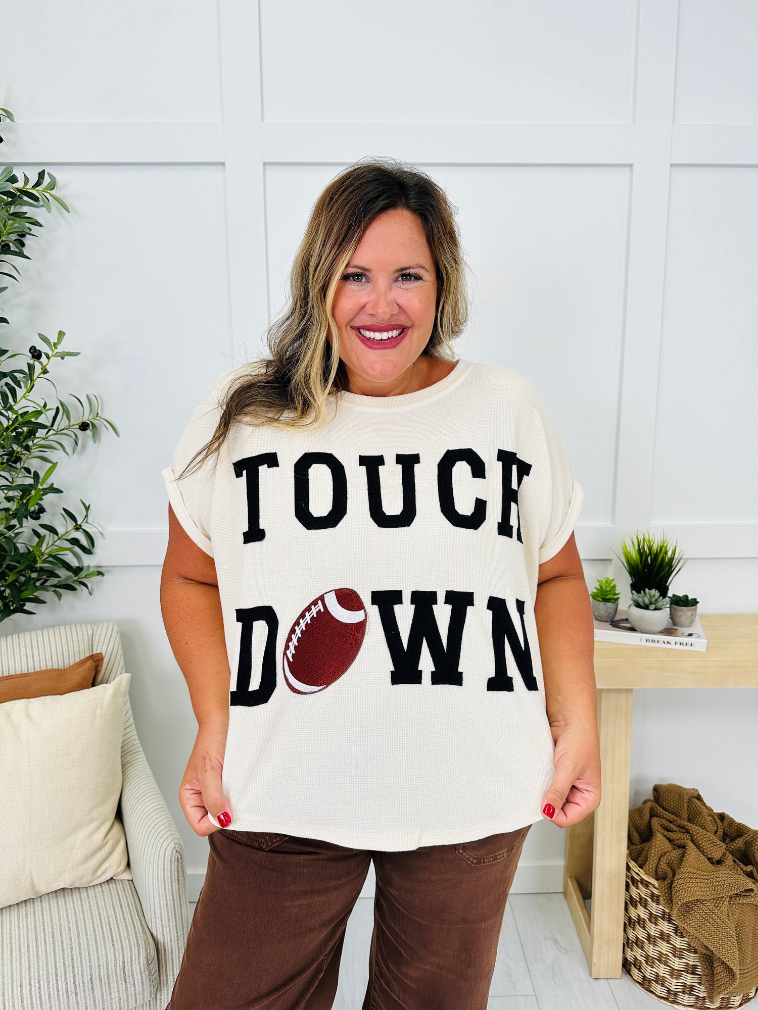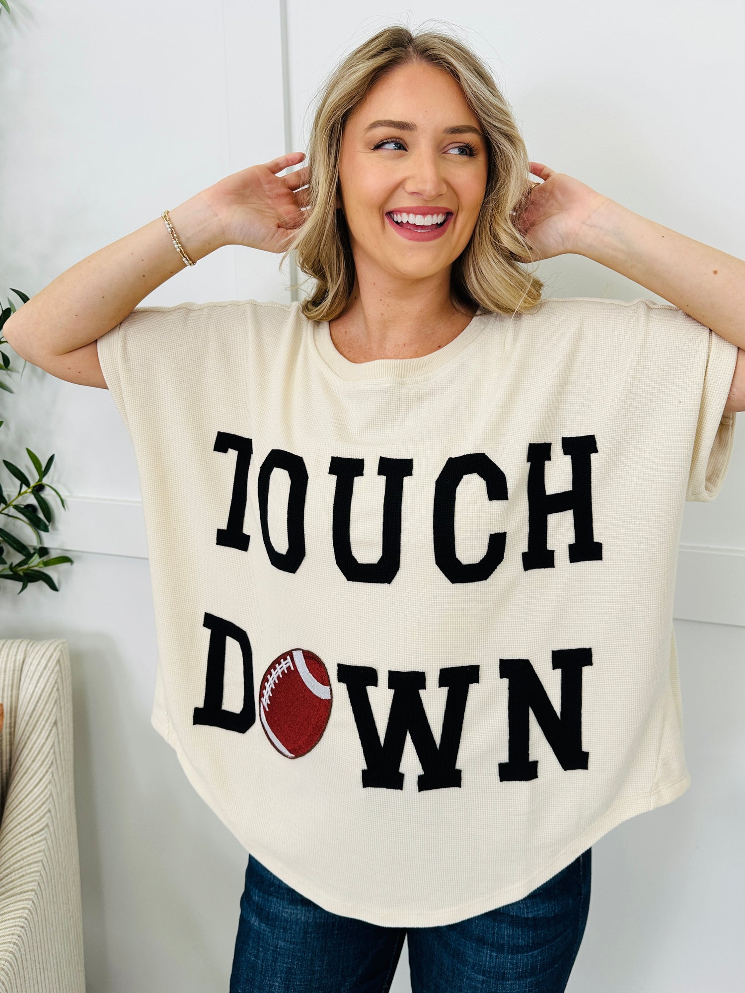 This playful top is all about game day spirit! The bold varsity-style letters make a standout statement, while the football accent adds a fun and sporty twist. Finished in a relaxed, flowy fit, it’s an easy piece to throw on for cheering in style while staying comfy.