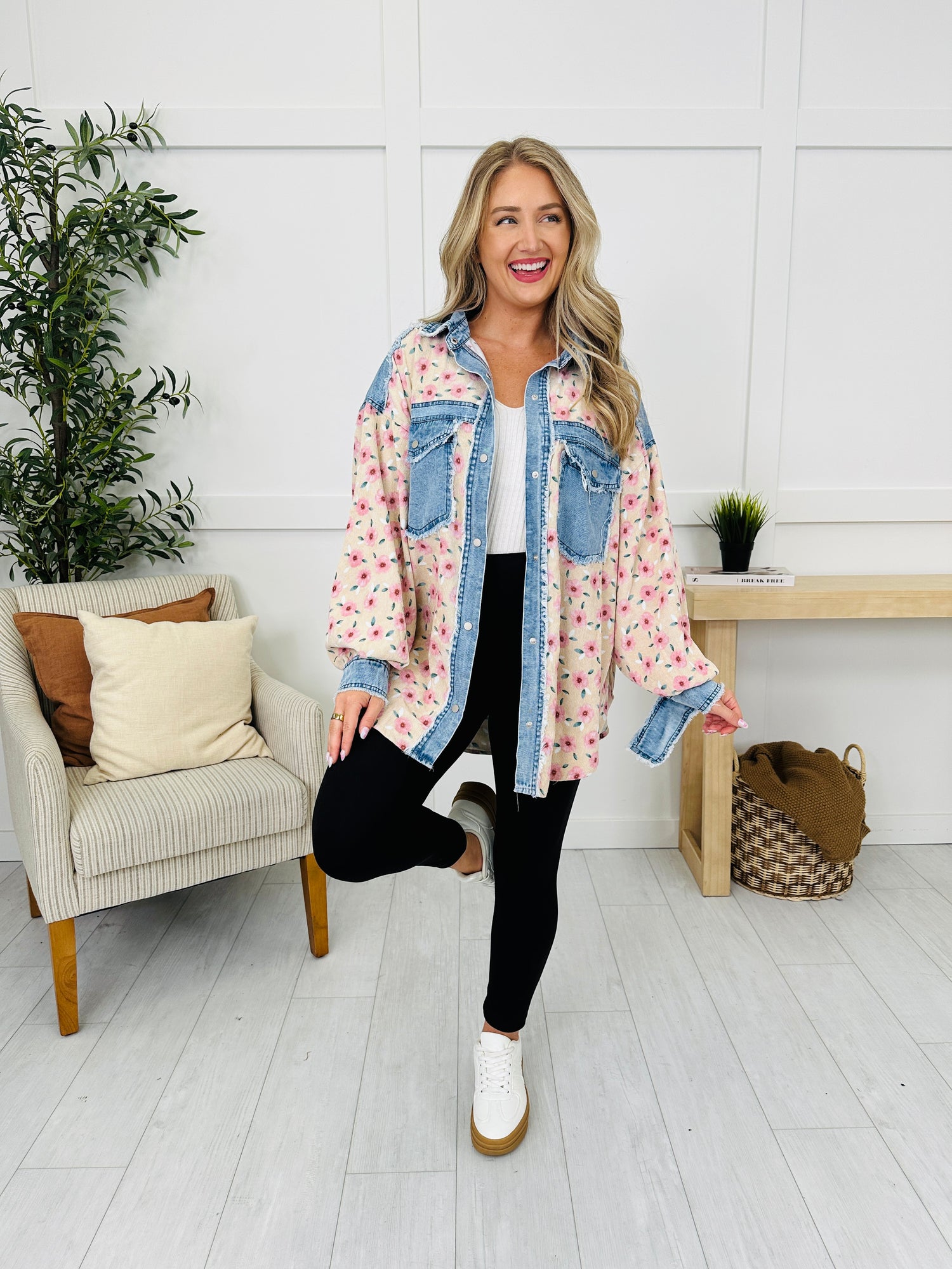 This top effortlessly combines a feminine floral print with denim accents for a stylish, laid-back look. The oversized fit adds a comfy vibe, perfect for layering with your favorite leggings or jeans. A versatile piece to elevate your casual wardrobe with ease!