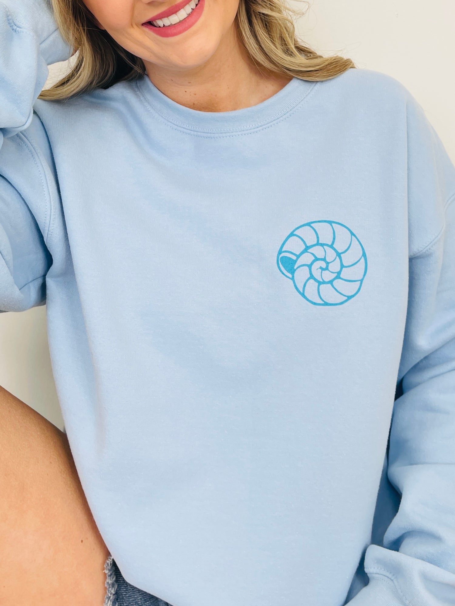 This relaxed sweatshirt is screen printed in-house for long-lasting wear. With its soft light blue tone and comfy, laid-back fit, it’s ideal for beach walks, coastal escapes, or everyday wear. Pair it with jeans, leggings, or shorts for an effortlessly breezy look that celebrates all things ocean-inspired.