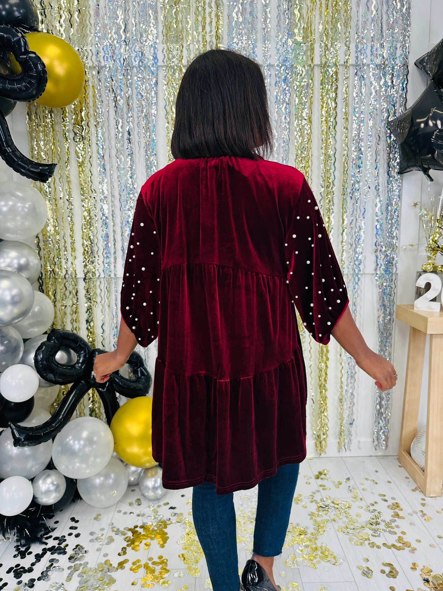 This chic top is made from a soft, velvety fabric that adds a luxurious touch to any look. The pearl embellishments along the sleeves elevate the design, offering a mix of sophistication and charm. Featuring a button-down collar, this top is perfect for both casual and dressed-up occasions, available in several colors for versatile styling.