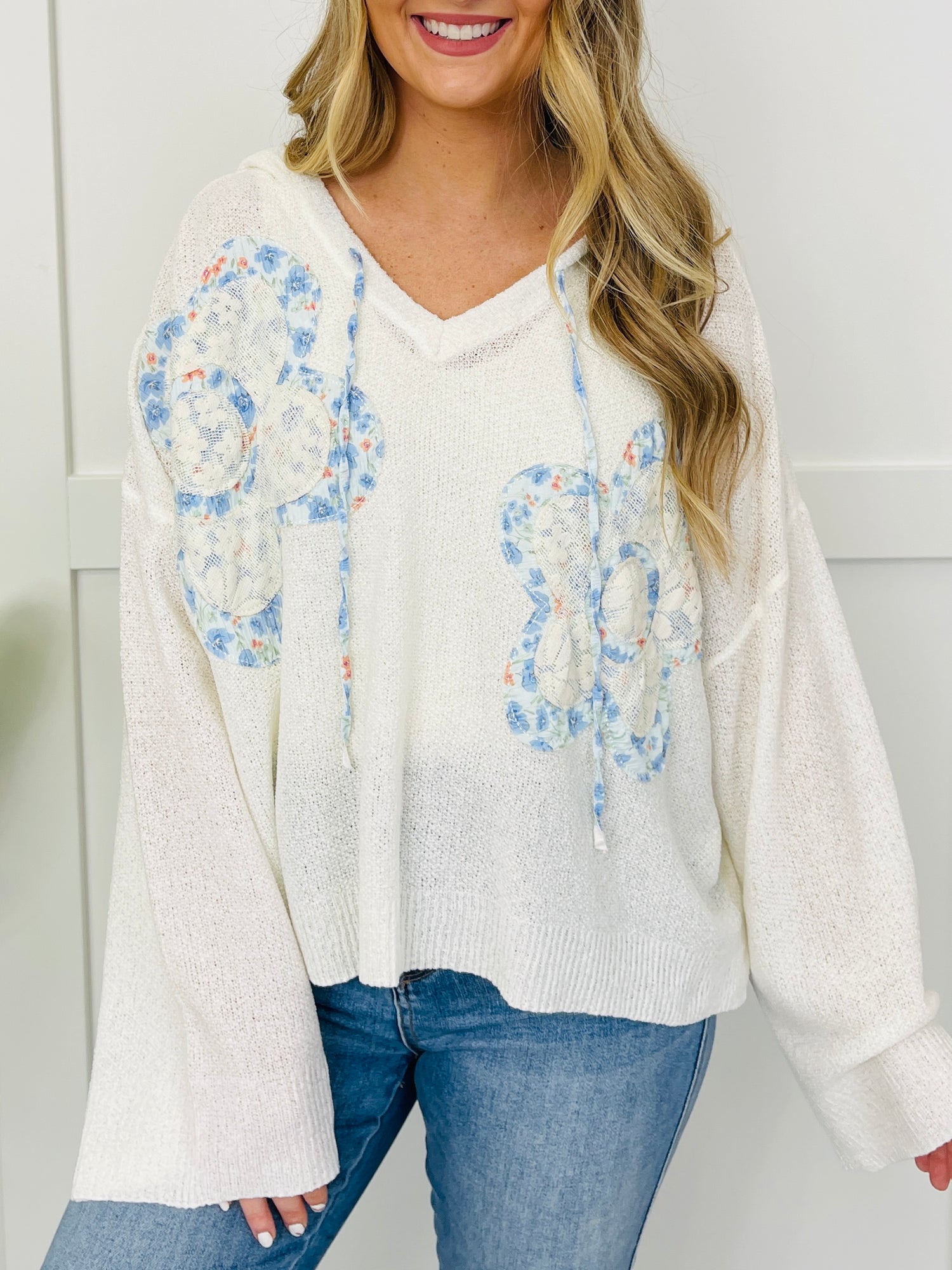 This top is full of sweet detail with floral patterned flower appliqués that instantly stand out, paired with a flattering V-neck hoodie style for an easy, elevated look. The relaxed, flowy shape and drop shoulder give it that effortless feel you’ll reach for when you want something comfy and cute.