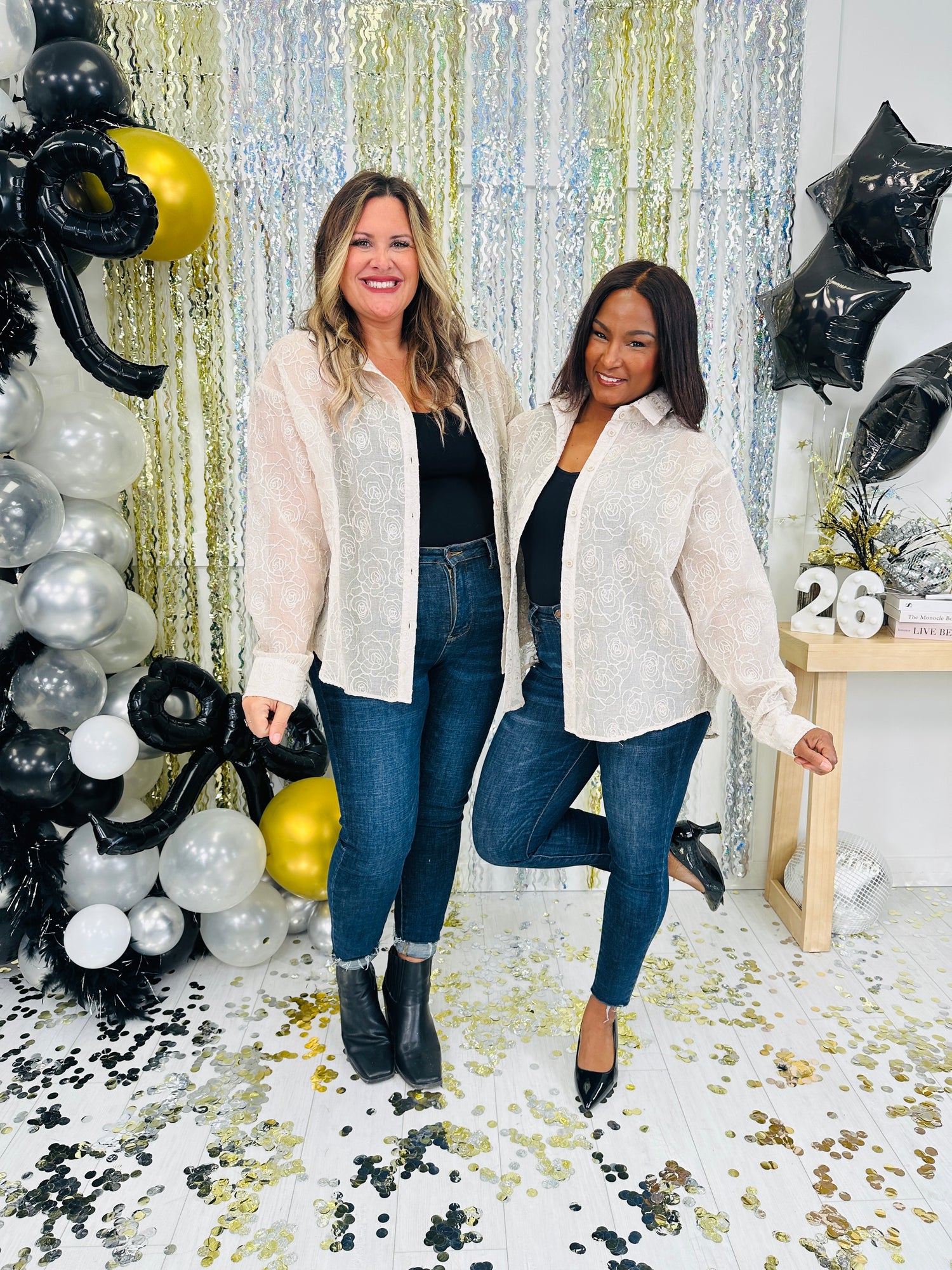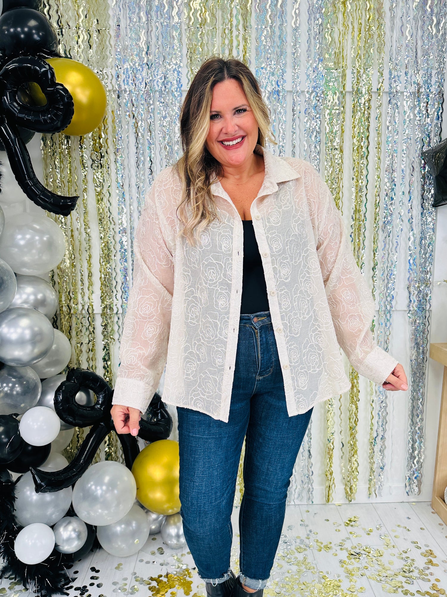 This delicate button-down shirt features intricate floral embroidery that adds texture and elegance to the lightweight, semi-sheer fabric. The classic button-down design offers versatility, perfect for layering over a tank or wearing on its own. The soft, airy feel makes it an ideal piece for warmer days or as a stylish layering option for cooler months.