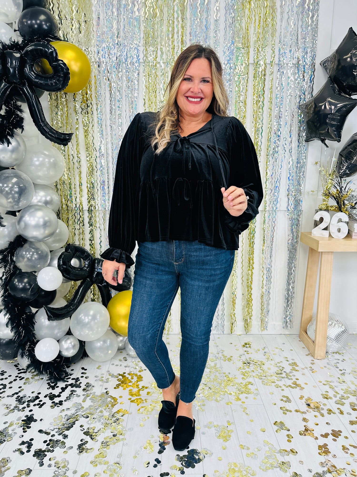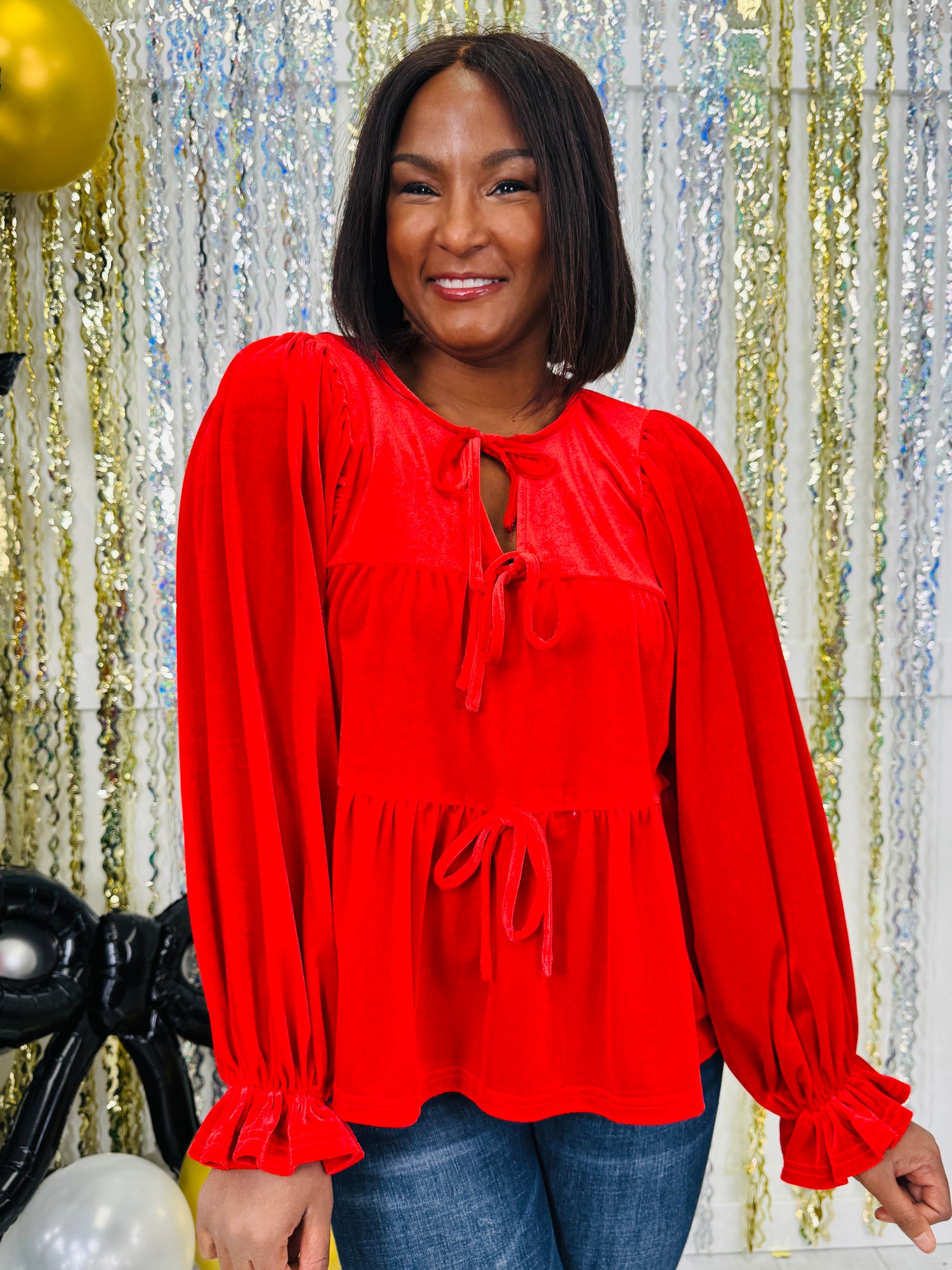 This charming top features a soft, velvety texture that feels as luxurious as it looks. The tie-front details add a playful, adjustable element, while the billowy sleeves with ruffled cuffs enhance the feminine, flowy silhouette. Perfect for a cozy yet stylish look, this top pairs beautifully with jeans or trousers for effortless, on-trend styling.