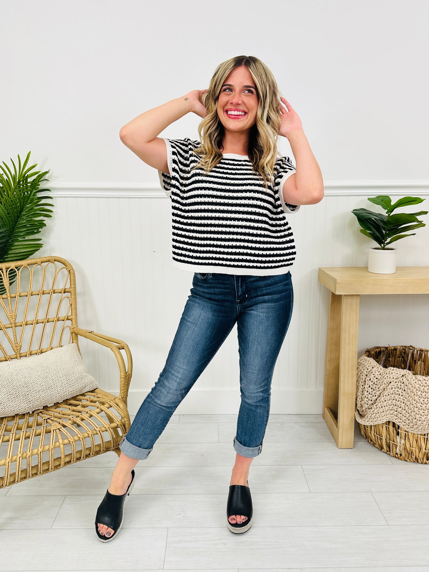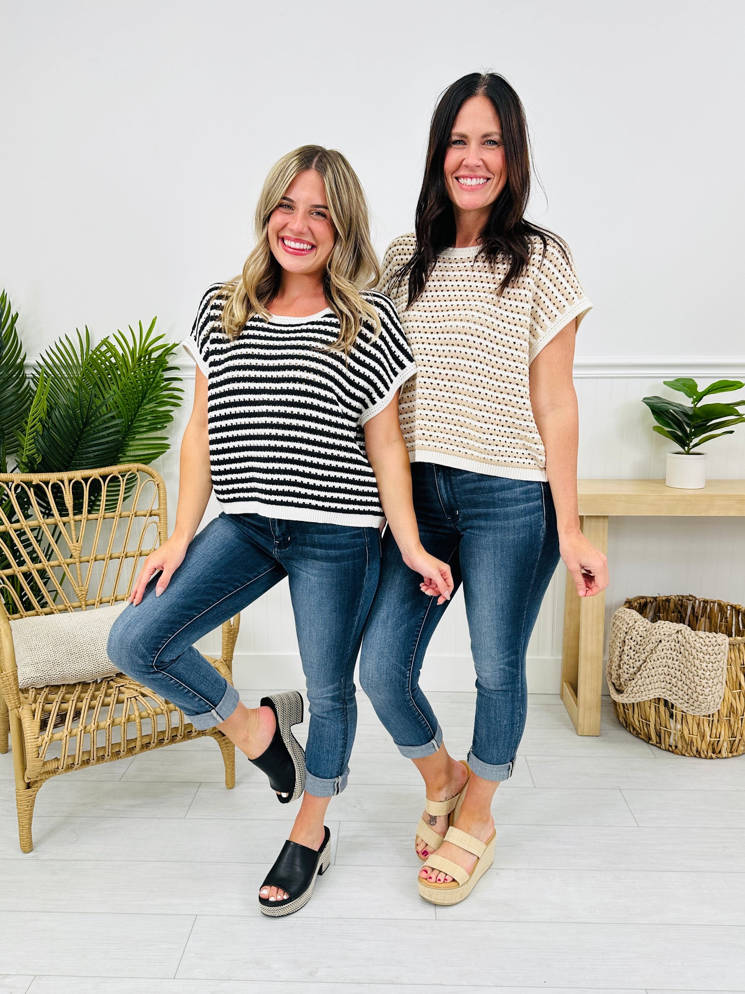 Show your stripes by adding this new arrival to your cart! This new knit top is a favorite among our models! It is a must have and is perfect for transitioning into fall! This light knit top is breathable, soft, and so comfortable. You can dress it up and wear it from work to weekend. It is oversized, flowy, and flattering and you should probably grab both colors!