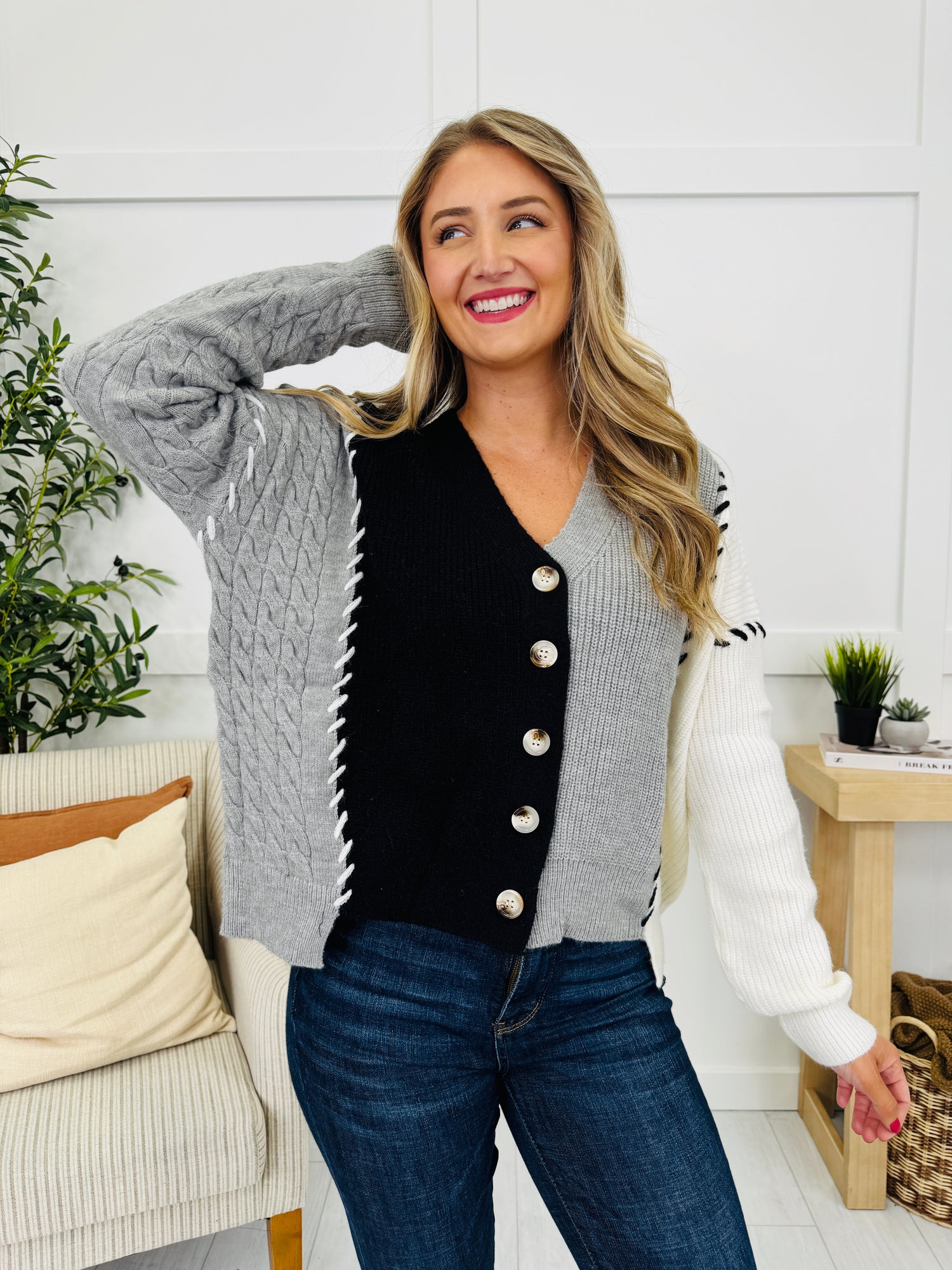 This cardigan stands out with its bold color block layout and eye-catching mix of patterns and textures. The contrast stitching and statement buttons add a touch of playful detail, while the soft knit makes it an instant cozy favorite. It’s the perfect blend of trendy and timeless for all your layering needs.