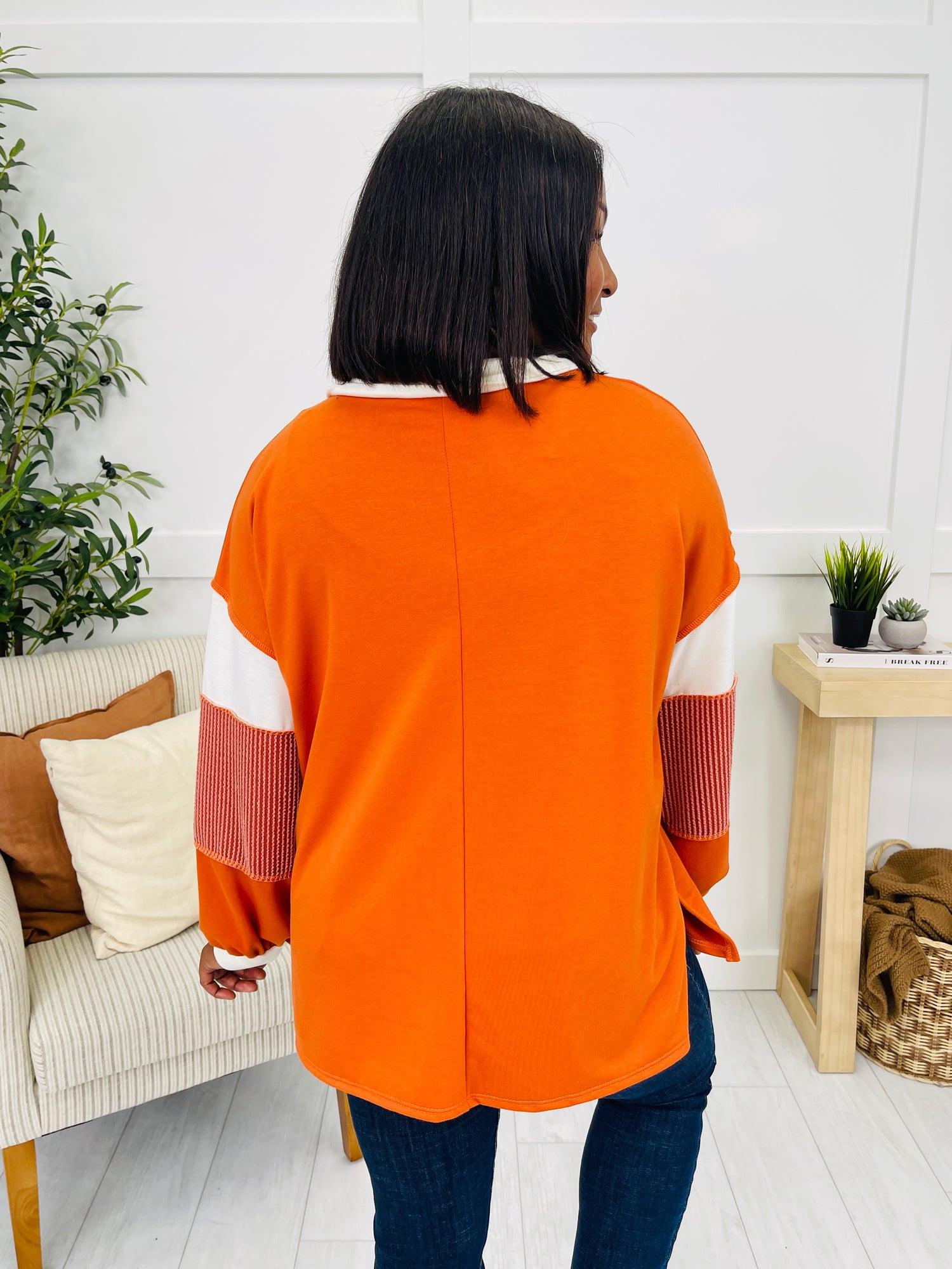 This top brings a fun and sporty twist to casual style with its bold orange hue and playful colorblock sleeve detail. The contrast collar trim and neckline add a polished touch, making it perfect for everyday wear. With its relaxed pullover fit and split hem, it’s a stylish go-to for effortless comfort and charm.