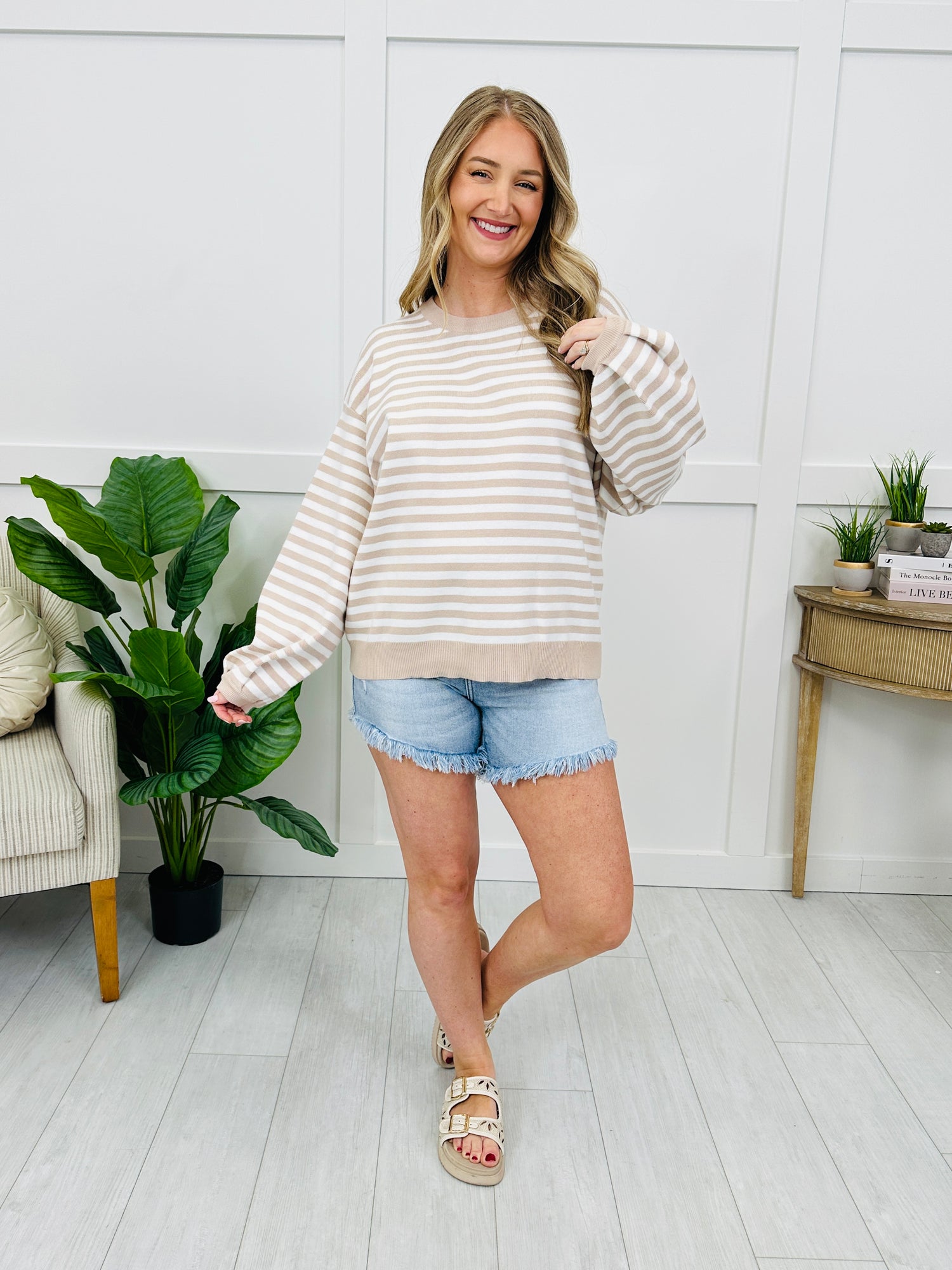 This timeless striped top is the perfect mix of cozy and effortless style. The classic striped pattern keeps the look clean and versatile, while the crew neckline adds that everyday, easy-to-wear feel. Designed with relaxed drop shoulders for a laid-back fit, it drapes comfortably without feeling oversized. Finished with banded hem and cuffs for a polished touch, it pairs perfectly with denim for an easy outfit you’ll reach for again and again.