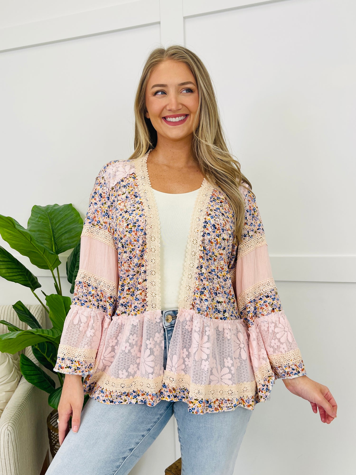 This romantic open-front piece features a soft blend of floral prints and subtle texture, making it an eye-catching layering option. Delicate crochet lace throughout adds a feminine finish, while the lightweight feel keeps it comfortable for everyday wear. Dress it up with dyed denim or drape it over a basic tank for an effortlessly pretty look.