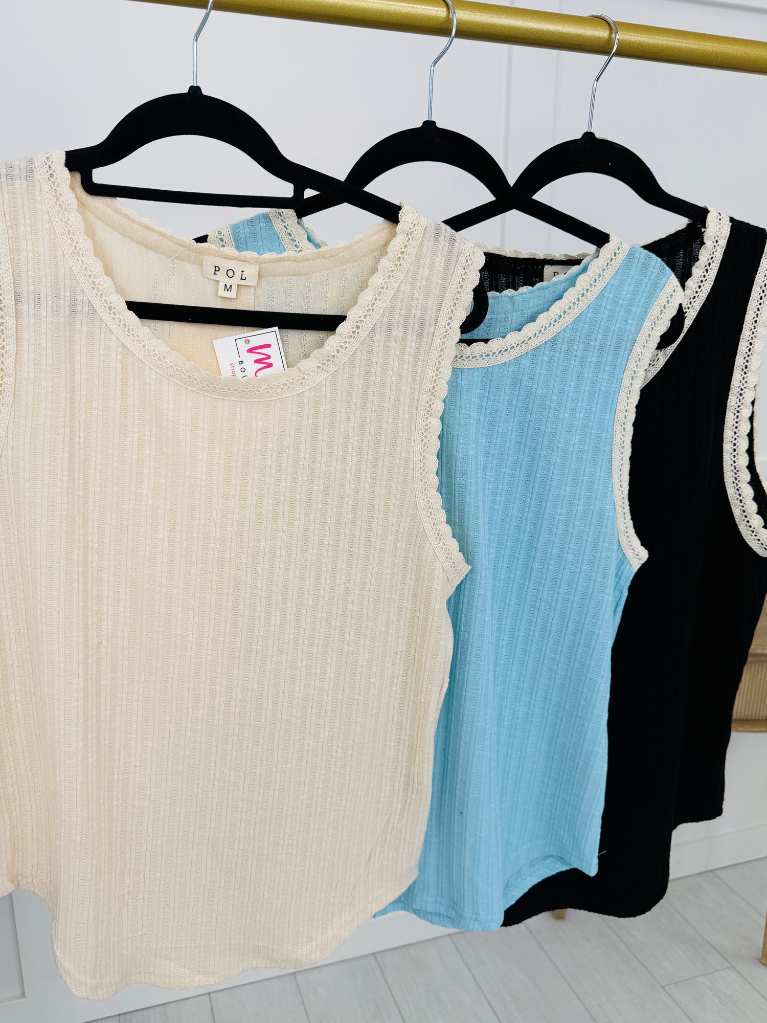 This tank is the perfect mix of sweet and simple. The textured knit fabric gives it soft dimension, while the scalloped lace trim around the neckline and arms adds a feminine touch without feeling overdone. Designed with a chic scoop neckline and a fitted, stretchy feel, it’s easy to wear on its own or layered under your favorite cardigan or jacket. Since it comes in several colors, it’s one of those everyday staples you’ll want in more than one.