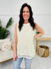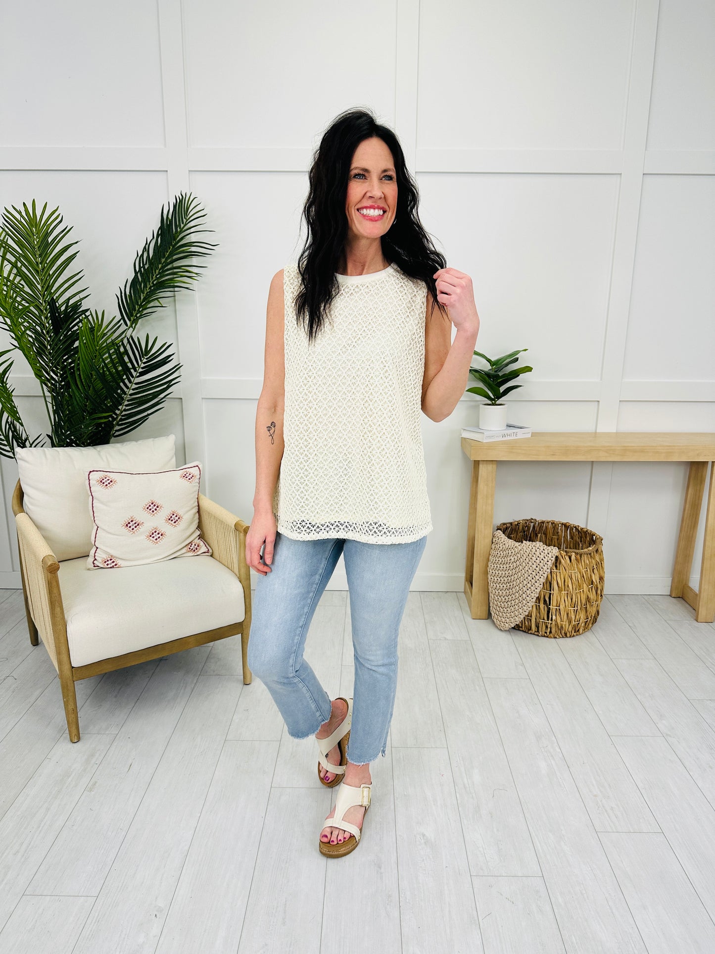 This sleeveless top brings all the charm with its delicate daisy-like crochet overlay and scalloped hemline. Lightweight and airy, it’s a sweet and timeless piece that adds a soft, feminine touch to any outfit.