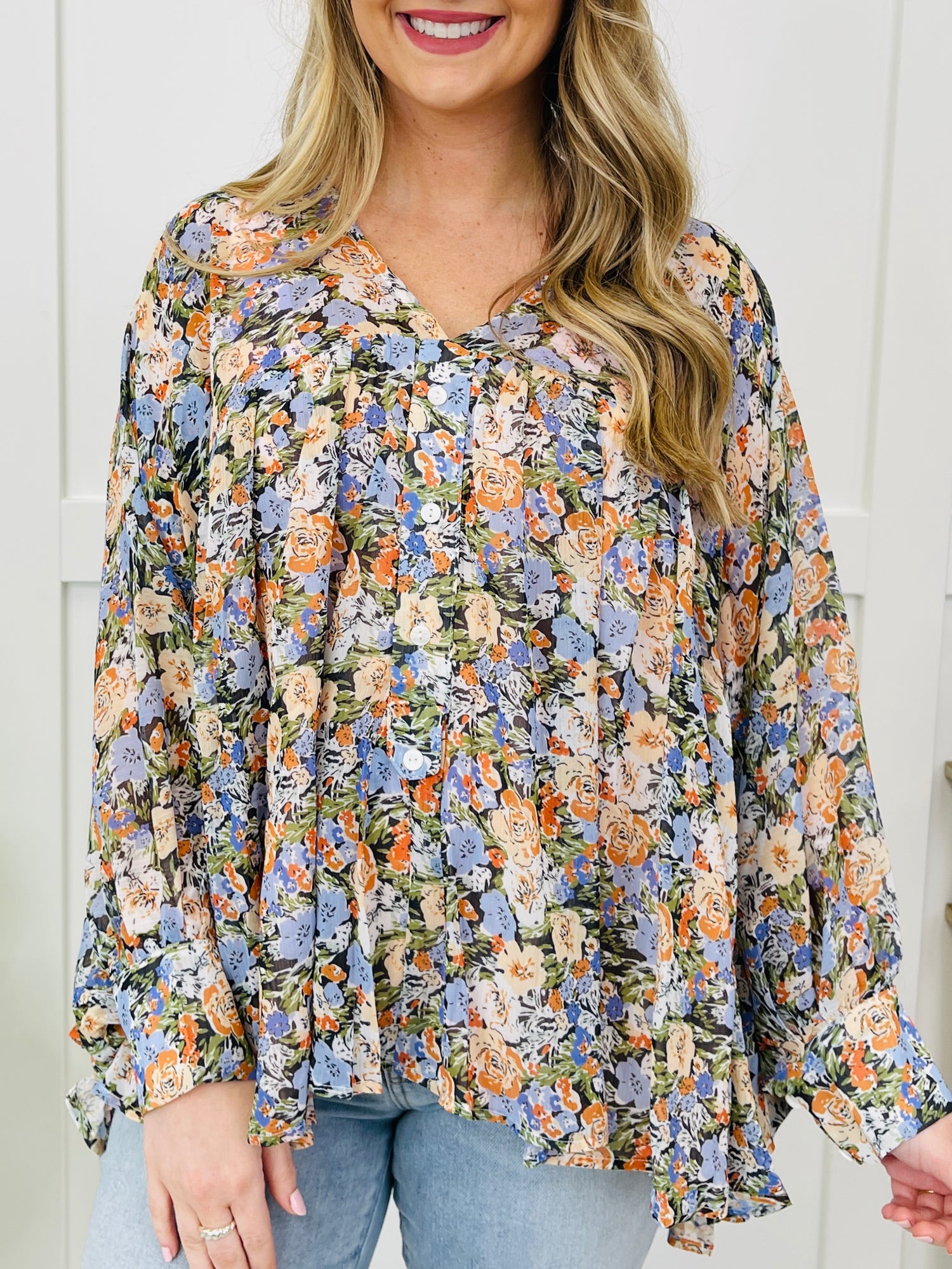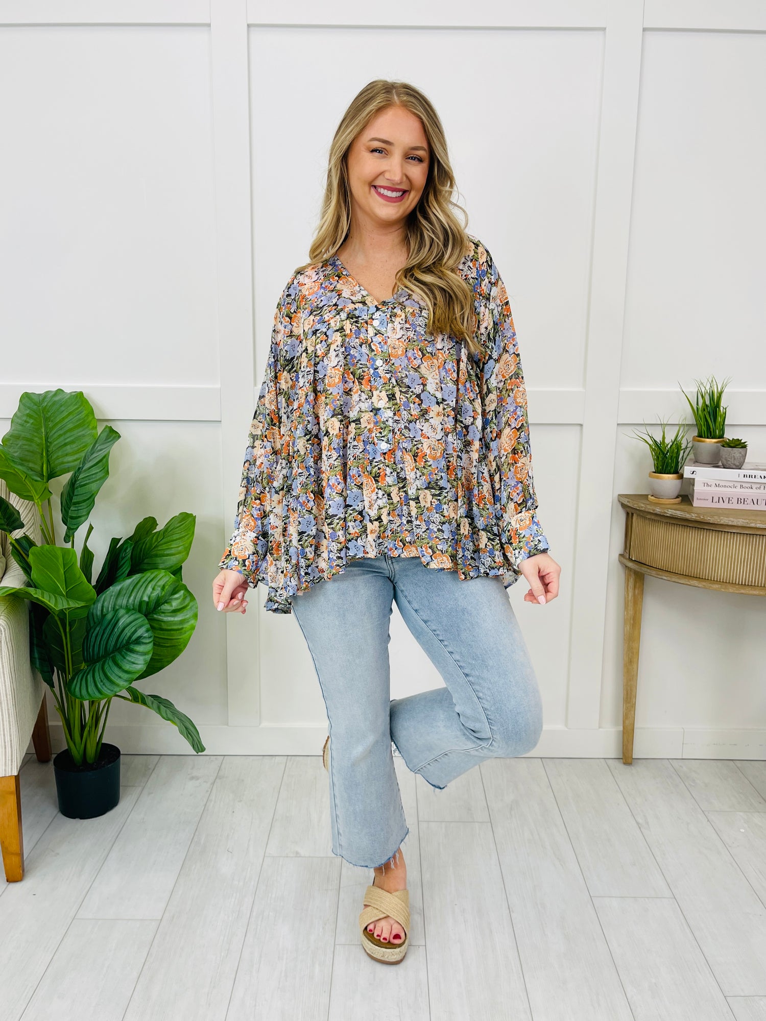 This top is the kind of effortless piece that instantly makes an outfit feel put together. The soft floral print adds a fresh, feminine touch, while the flowy pleated bodice creates beautiful movement and a flattering shape. A delicate button front detail gives it just the right hint of charm, and the relaxed, drapey fit keeps it comfortable and easy to wear all day. Pair it with your favorite denim for an easy everyday look that feels both polished and relaxed.
