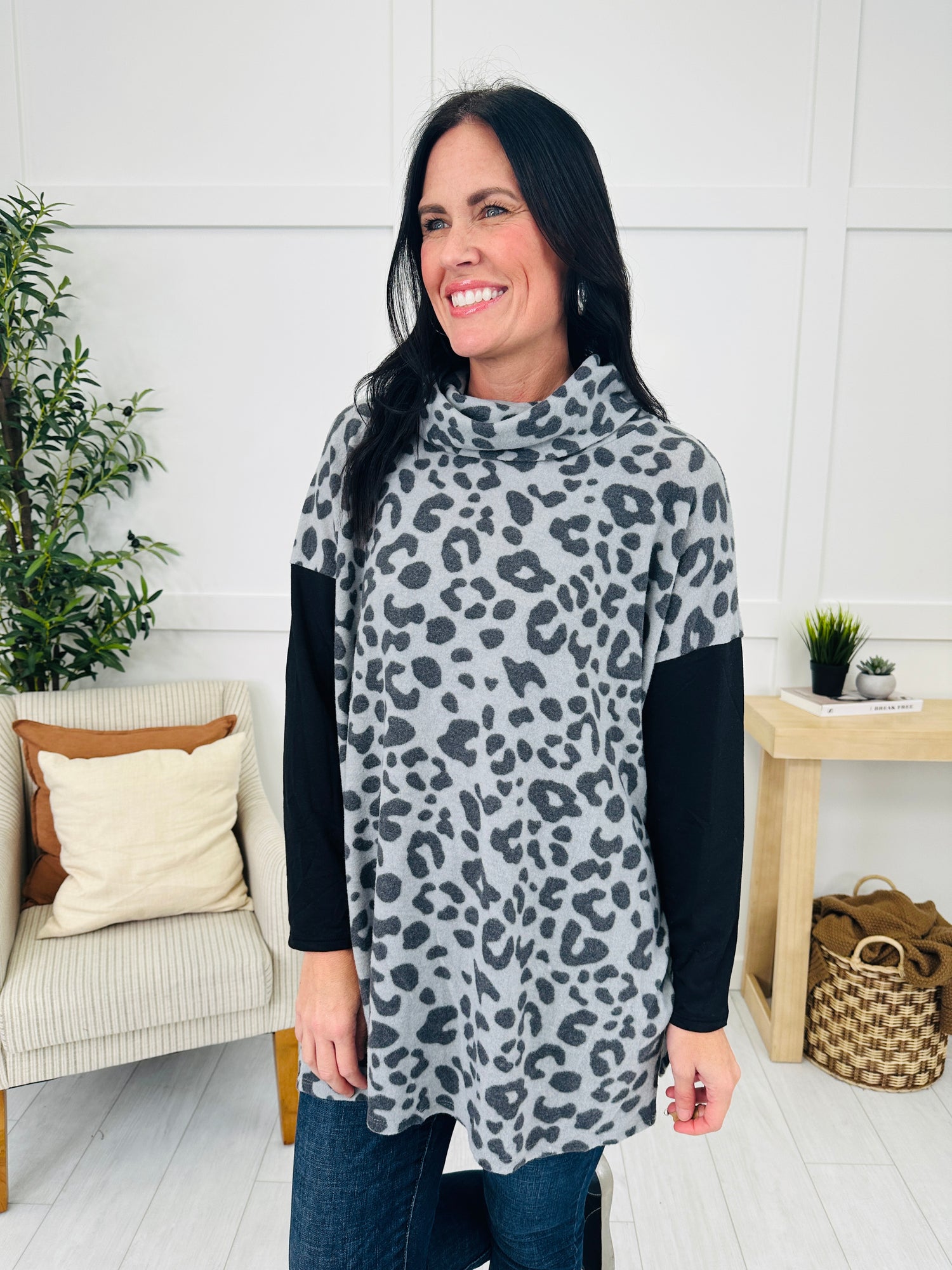 This cozy top features a bold, black and gray leopard print, perfect for adding a little flair to your wardrobe. The cowl neckline adds a touch of sophistication while the relaxed fit ensures comfort all day long. Pair it with your favorite jeans or leggings for a stylish yet laid-back look.
