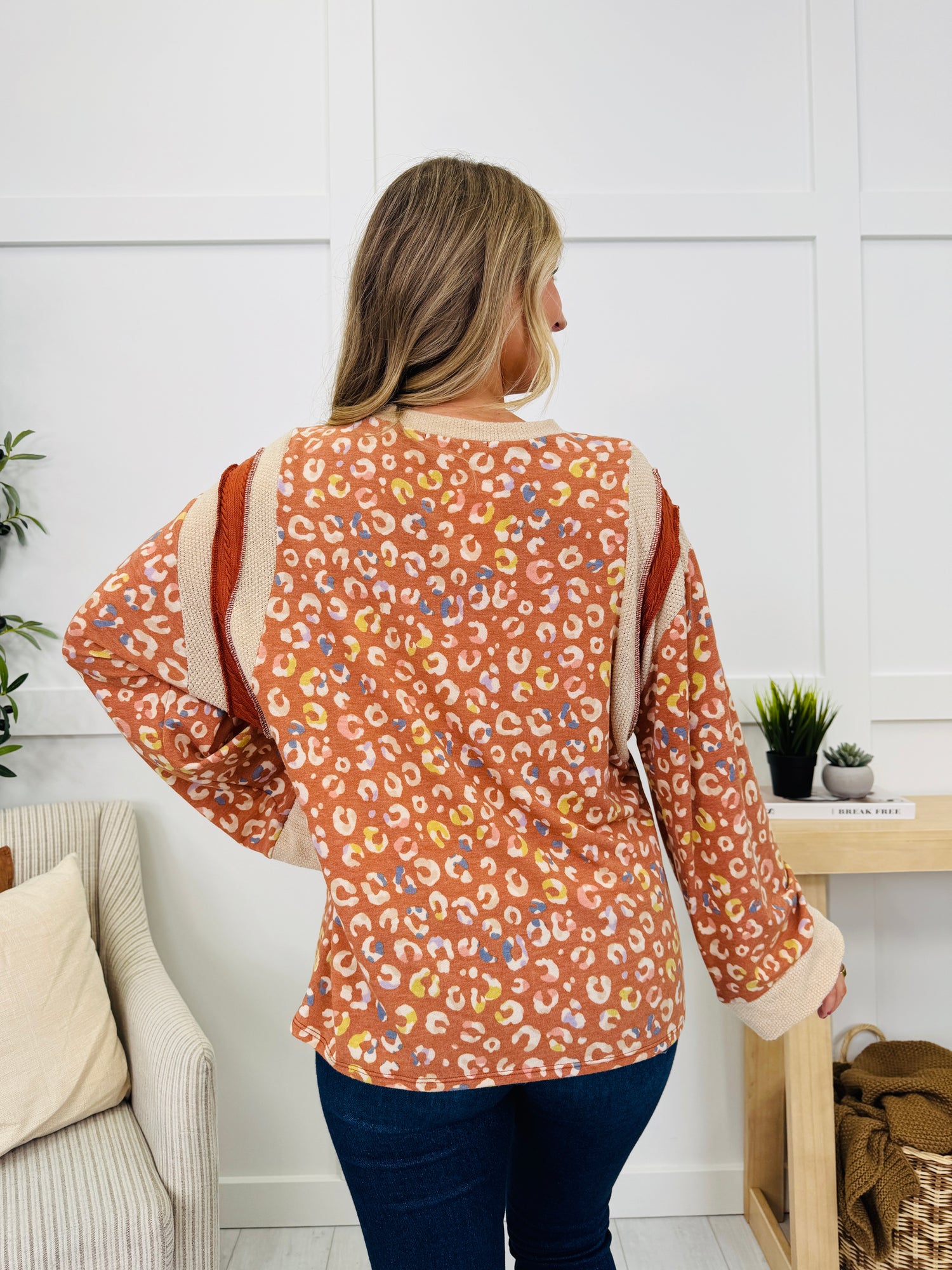 This top adds a fun pop of personality with its colorful leopard print and playful mix of warm tones. The contrasting shoulder and trim detail brings extra flair, making it stand out from your everyday long sleeve. With its relaxed, flowy fit, it’s the perfect piece for adding a touch of bold style to your casual lineup.