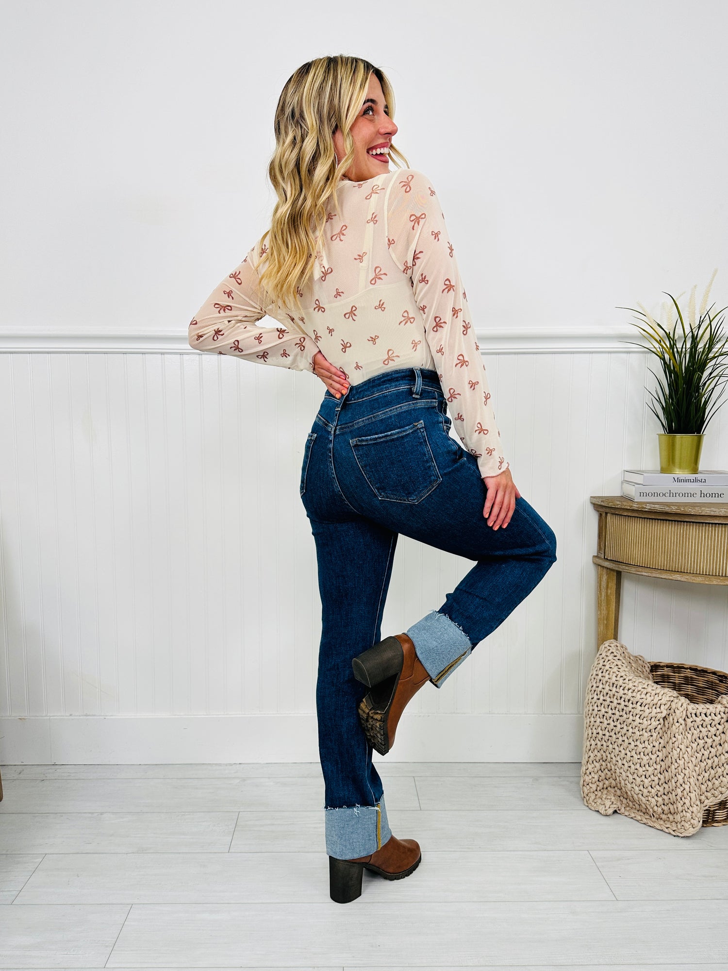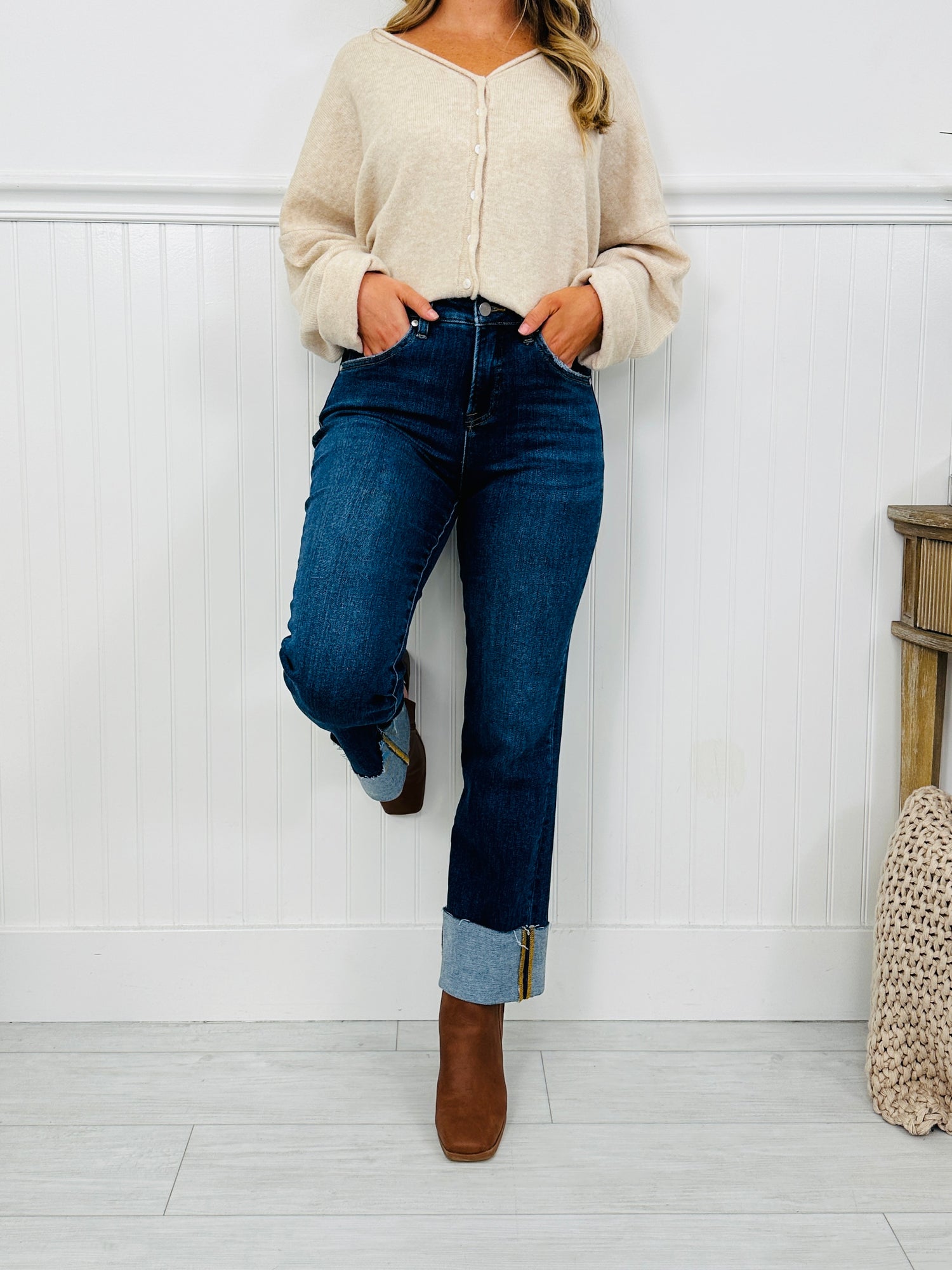 Stay cuffed and on trend this season with these new dreamy, dark wash jeans featuring a tummy control panel that is going to suck you in and slim you out in all of the right places for an awesome boost of confidence.