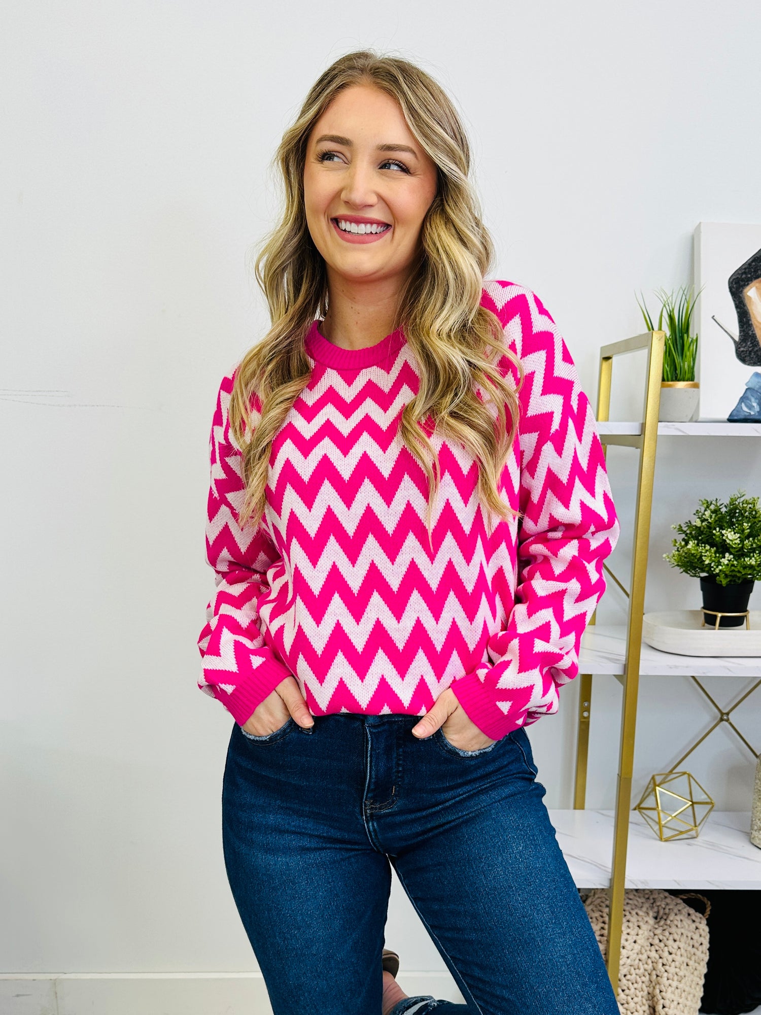 This cozy sweater combines a bold chevron pattern with a pop of vibrant pink and white for a playful yet stylish look. Its relaxed fit and soft texture ensure comfort while staying fashionable, making it a perfect choice for any casual outing. Pair it with your favorite jeans or leggings for an easygoing yet eye-catching outfit.