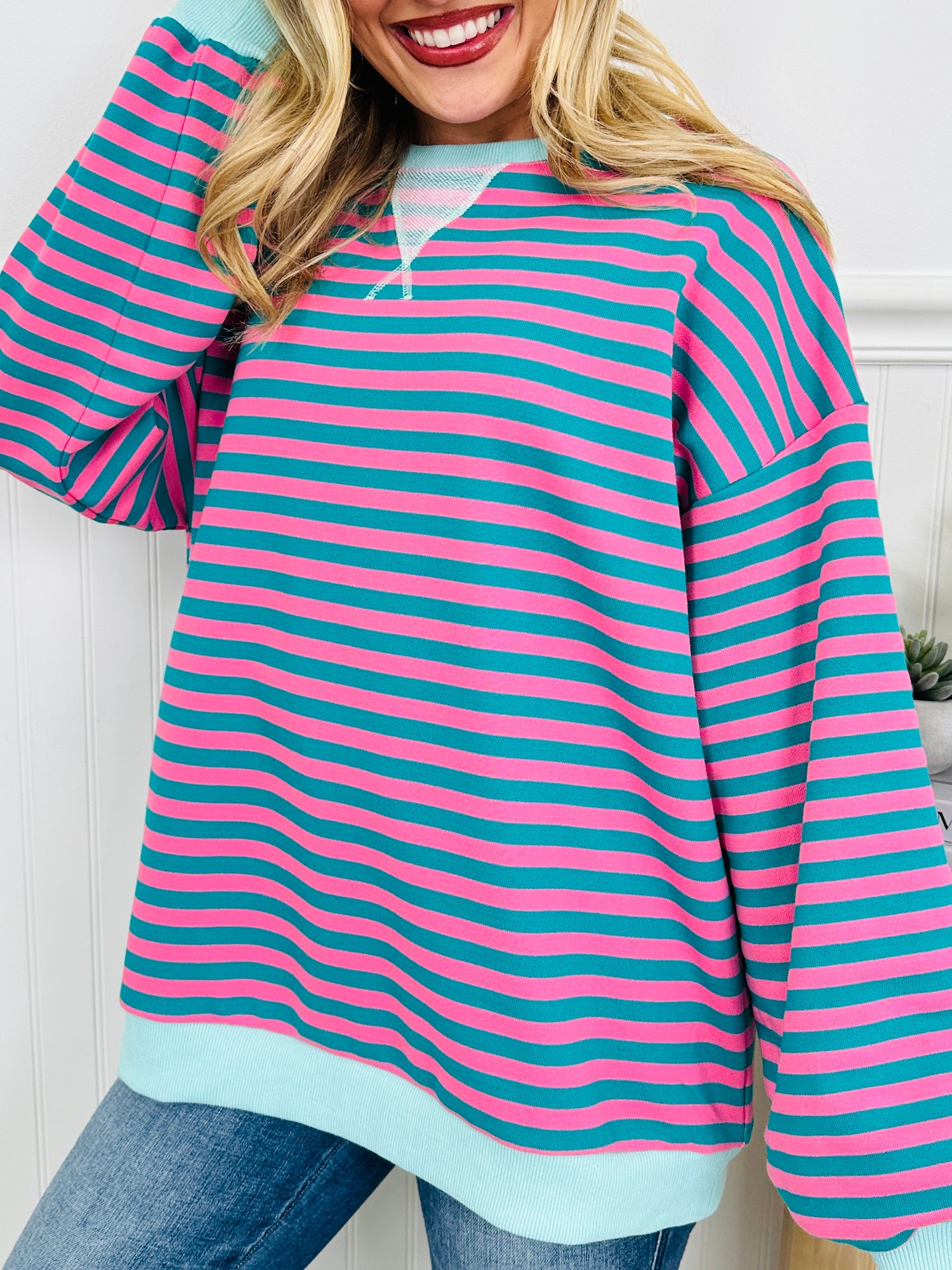 Have you heard? Stripes are on trend this spring! Bring the color and turn up the fun. This new pre-spring arrival features bold, playful stripes in vibrant colorways that instantly elevate your everyday look. Designed with a relaxed fit and soft fabric, this pullover is all about feel-good comfort with standout style.