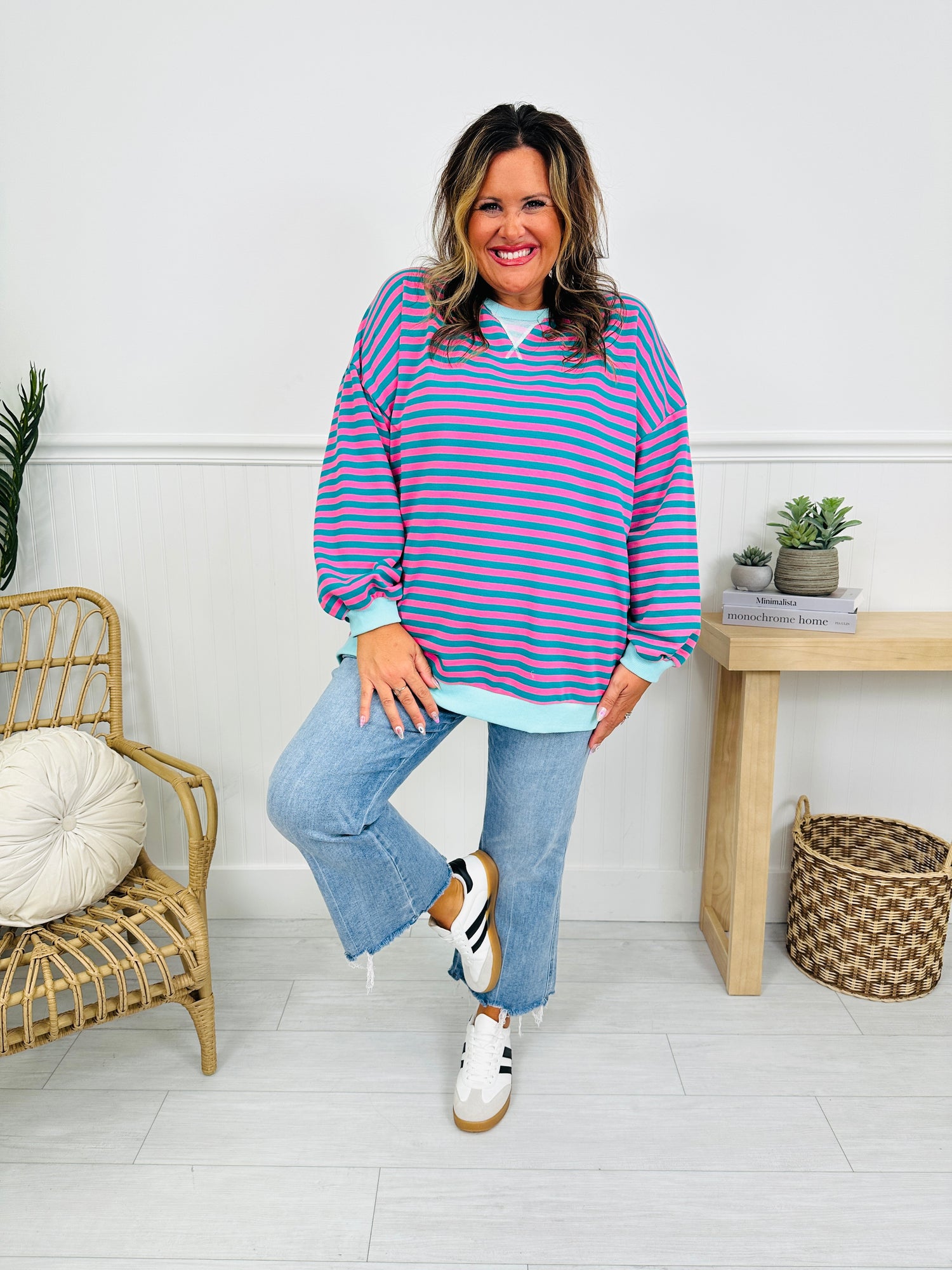This new arrival is perfect for pairing with both jeans and leggings and will be your new go-to for casual days when you still want to make a statement. Whether you’re grabbing coffee, running errands, or lounging in style, this pullover delivers all the hype—in stripe form. Bring on spring in style in this new trendy striped pullover!
