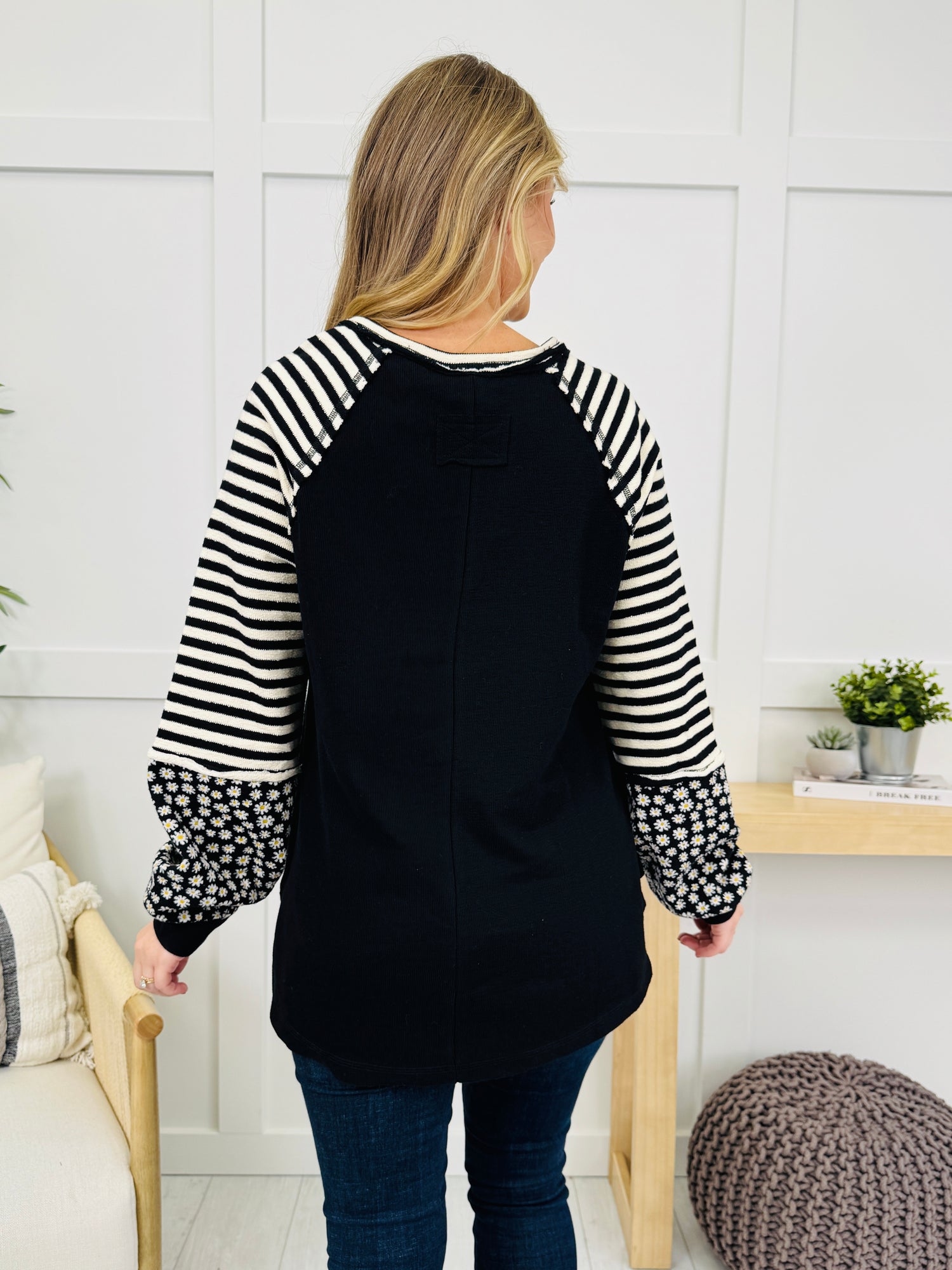 This top perfectly blends playful and chic with its mix of striped and floral sleeves that add a pop of personality. The split v neckline gives it a casual, laid-back finish, while the soft black body keeps it effortlessly easy to wear. It’s the kind of piece that makes a simple outfit look instantly styled and unique.