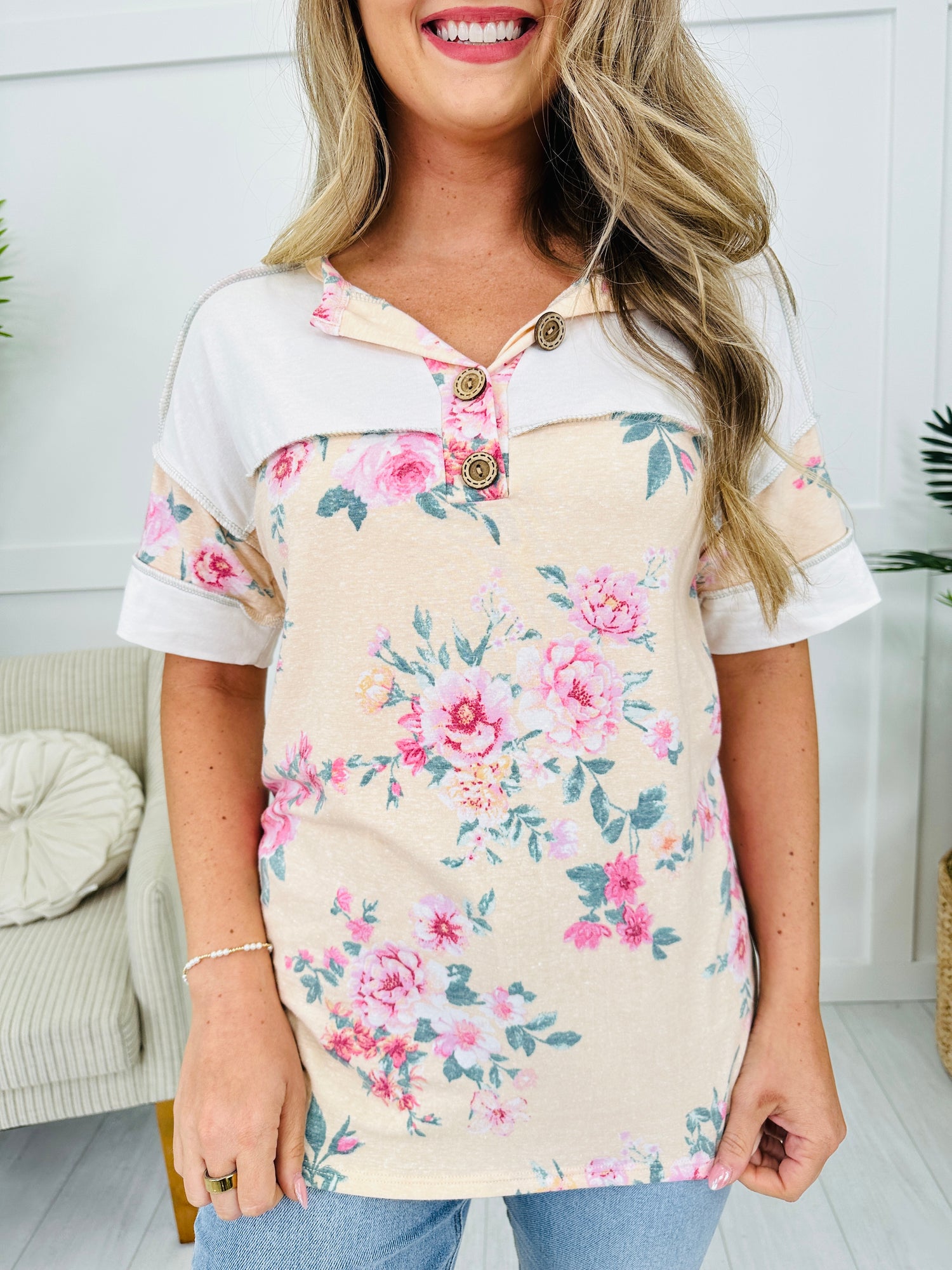 This charming top mixes soft florals with contrast paneling for the cutest everyday look. The exposed stitched accents and decorative button neckline give it a laid-back feel with standout details, while the comfy, easy fit makes it perfect for pairing with jeans or shorts. With soft neutral tones and pretty pops of pink, it’s a must-have for casual days with a girly twist.