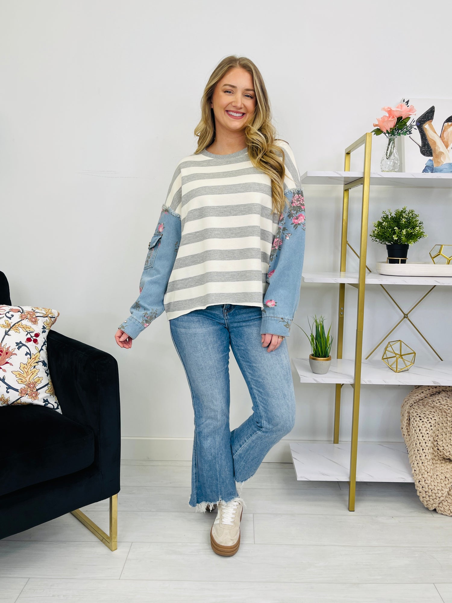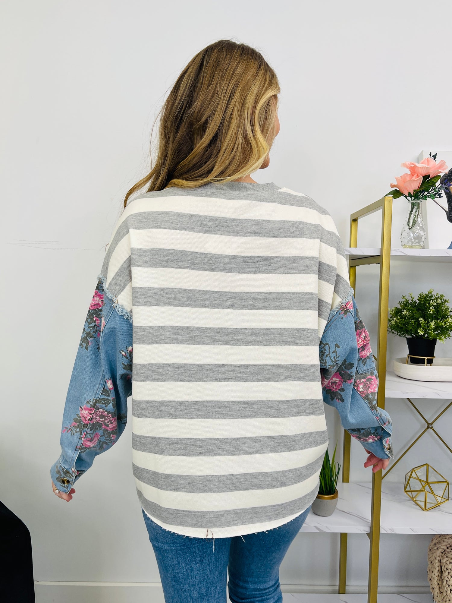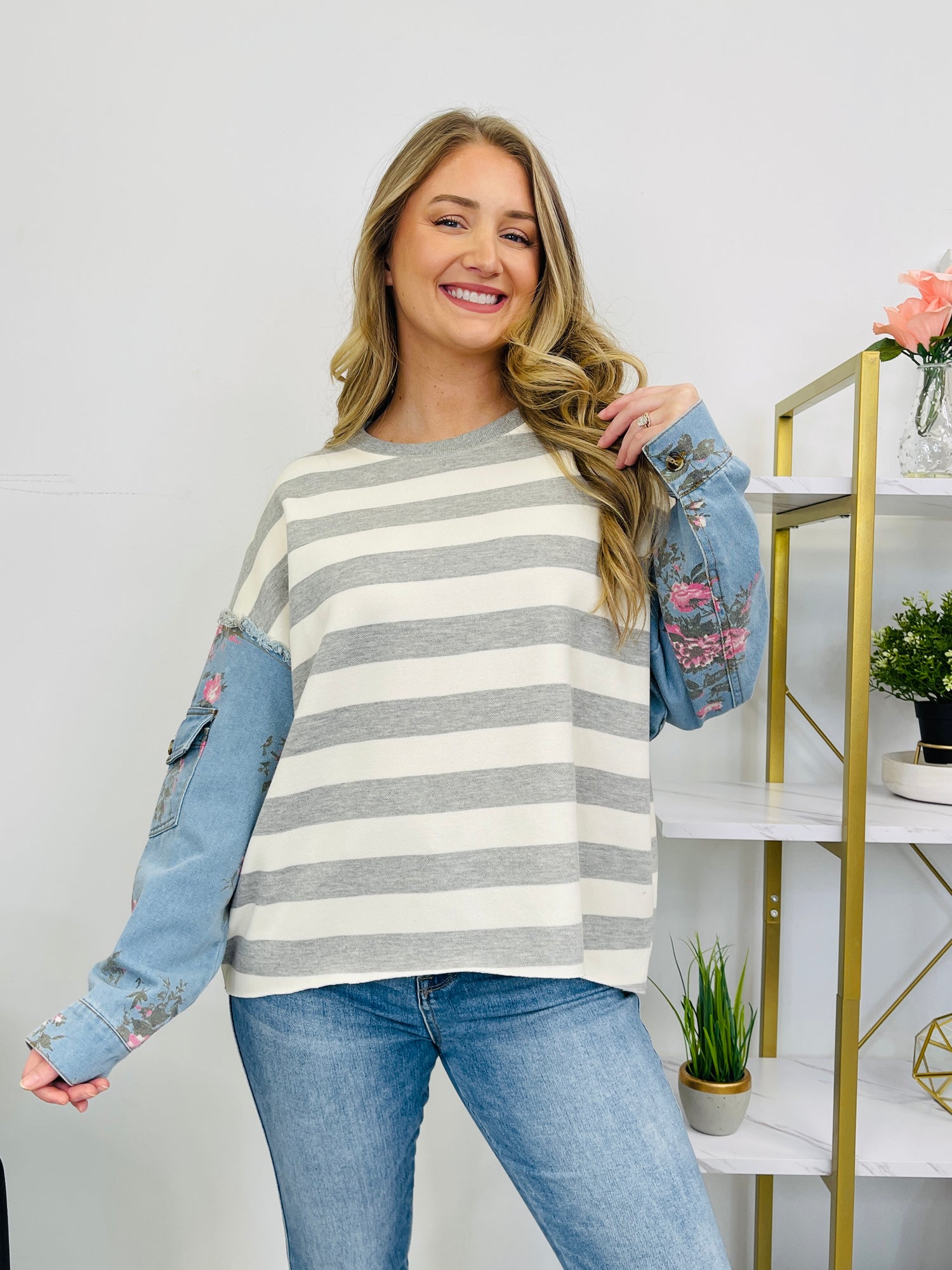 This top pairs a timeless gray-and-ivory striped front with blue denim floral sleeves for a fun, statement-making mix. The frayed shoulder trim adds a little extra texture, while the sleeve flap pocket and buttoned cuffs give it a cute, finished detail you’ll notice right away.