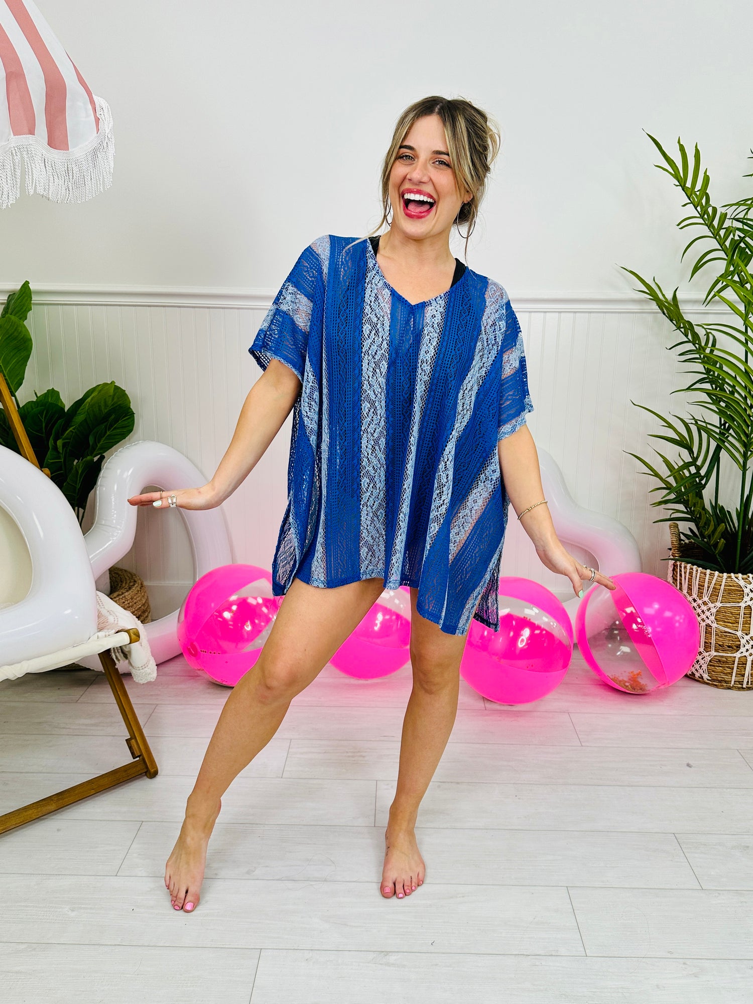 Designed with a lightweight, open-knit fabric and an airy silhouette, it drapes beautifully for a relaxed yet stylish fit. Whether you're strolling the shore or lounging by the pool, this cover-up is the perfect blend of comfort and coastal charm!
