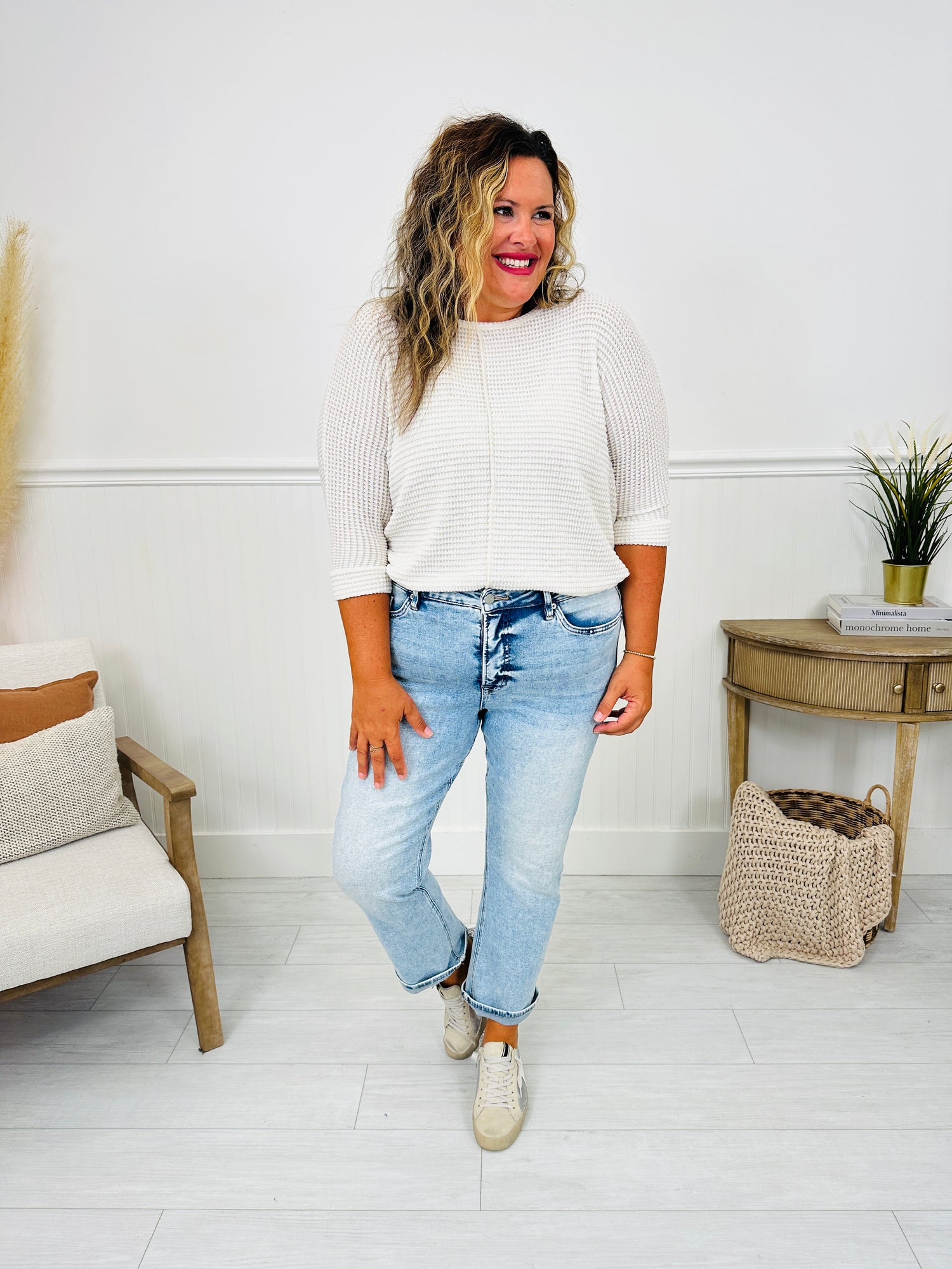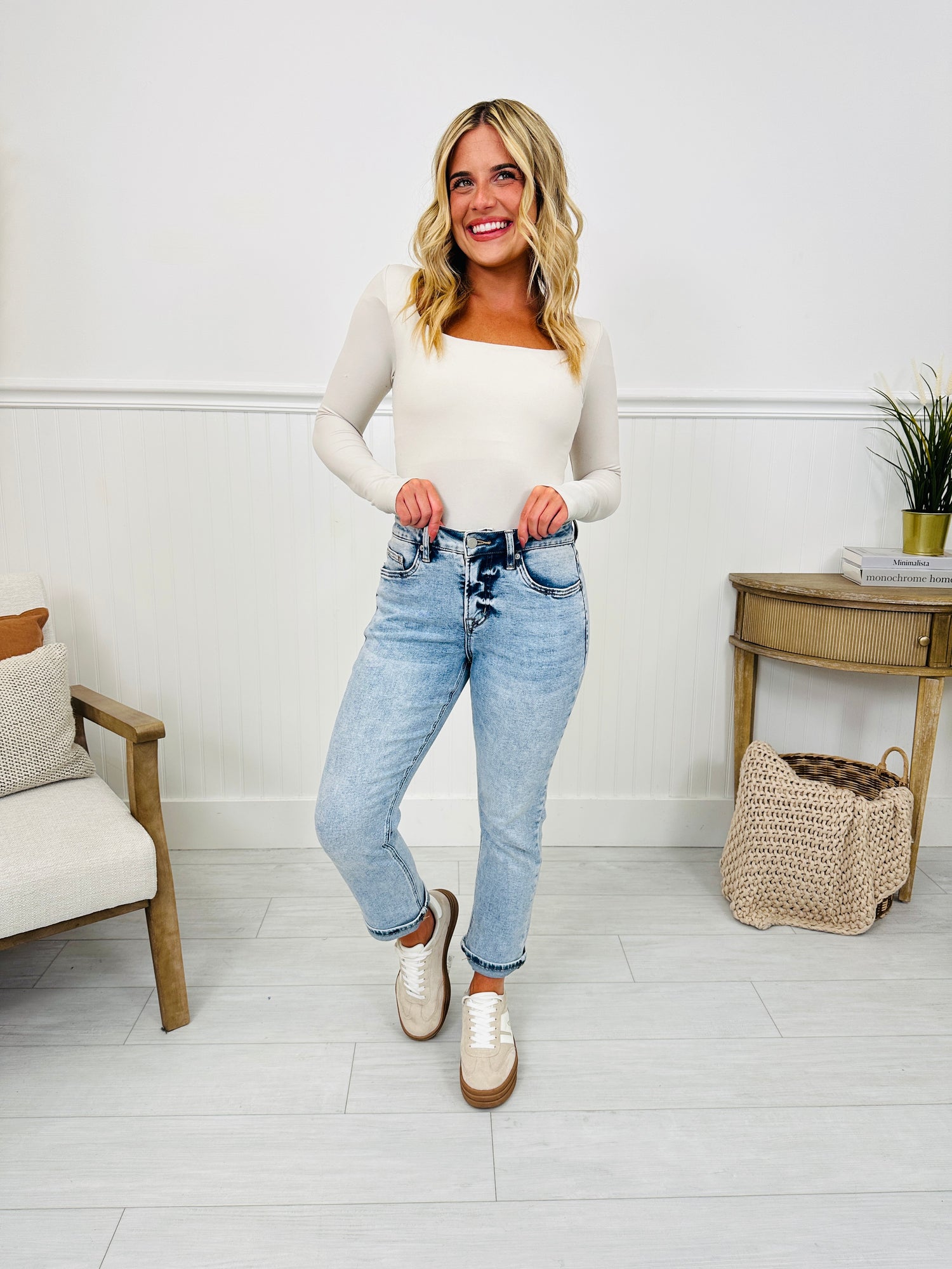 Take our advice and get these in your cart while you still can. ;) Everyone needs a good pair of sneaker jeans and these are it! These straight leg jeans feature a stretchy tummy control panel that is going to slim you out in all of the right places. They feature a flexible cuff that can be un-cuffed if you want more length. They have zero holes and are a versatile pair of jeans that can be worn from work to weekend to everywhere in between!