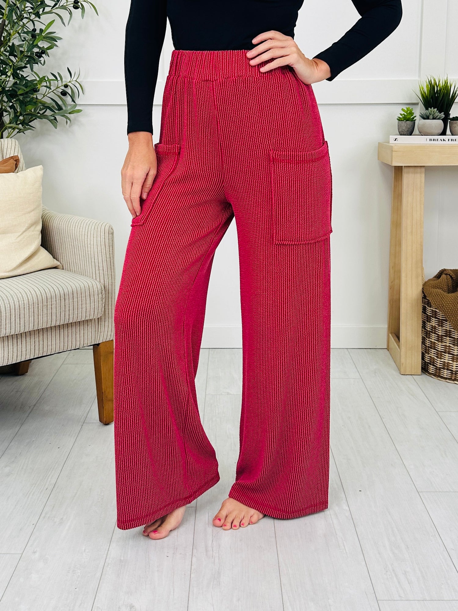 These bottoms bring effortless comfort with their wide leg fit that drapes beautifully and moves with you. The textured raised rib fabric adds a unique touch that makes them stand out, while the functional pockets keep them as practical as they are stylish. Perfect for lounging or errands with your favorite comfy top, these pants are a versatile staple you’ll reach for again and again.
