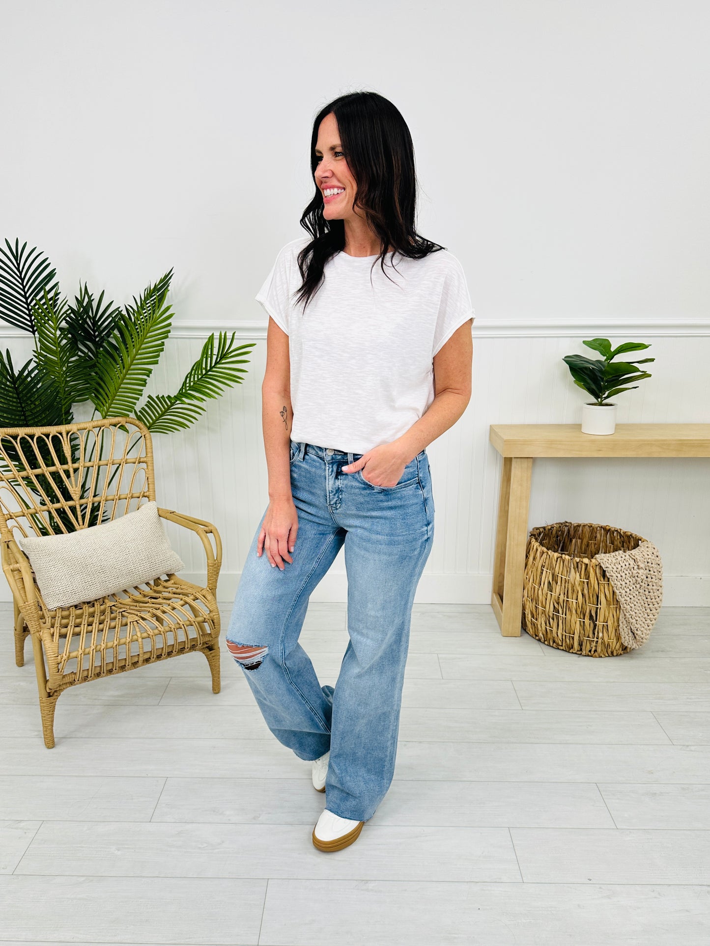 These are the perfect jeans to pair with sneakers or your favorite, summer casual sandals! We love the trendy knee distressing and the raw hem, which means women of all inseams can wear them. If you get them in and they are too long, you can simply trim them to achieve the same look you see on the models that are pictured.