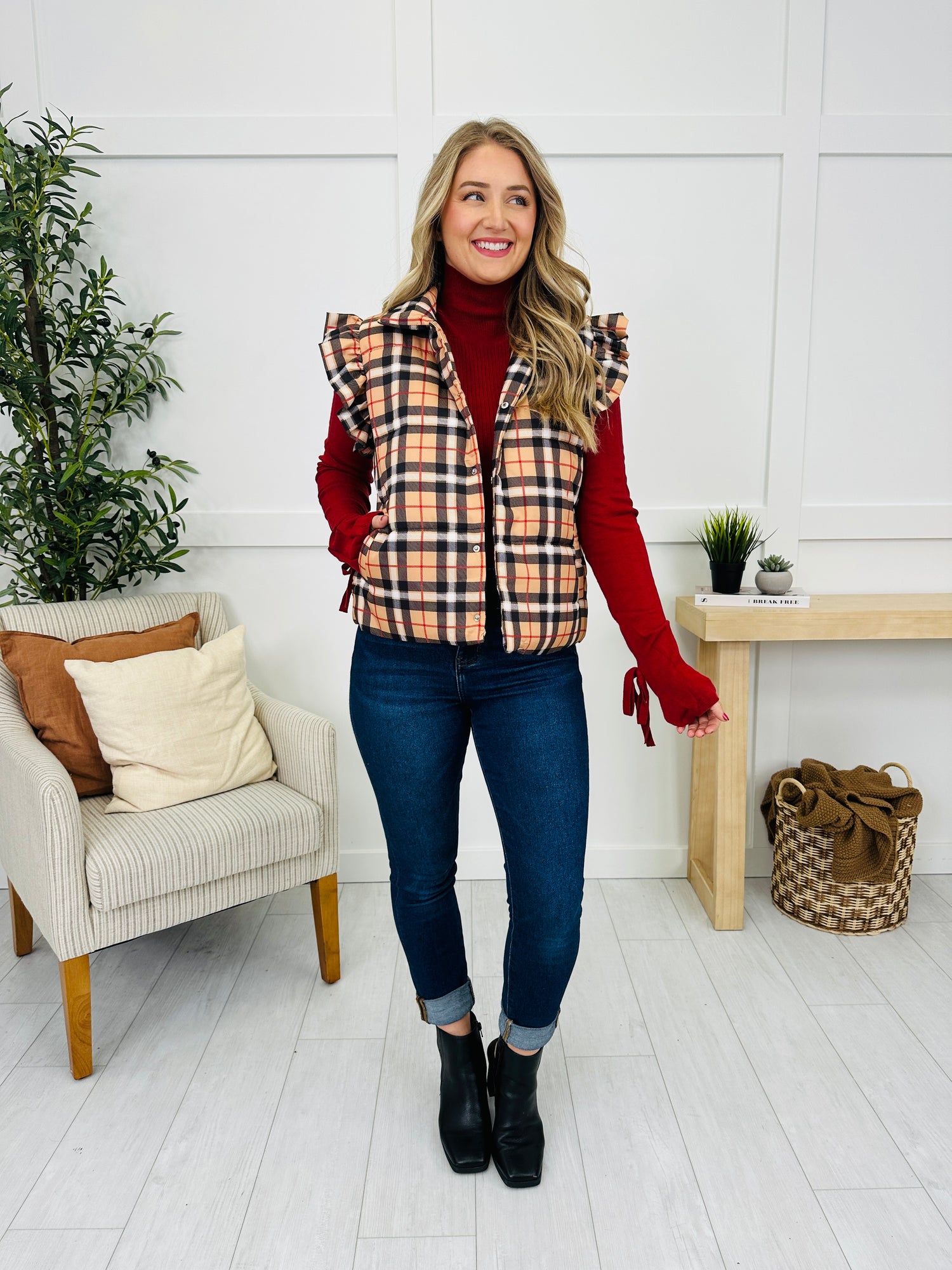 This statement vest blends timeless style with a playful twist, featuring a classic plaid print that never goes out of fashion. The ruffled shoulder detail adds a feminine and unexpected touch, while the snap-front closure keeps it easy to layer over your favorite tops and sweaters. Perfect for adding charm and personality to your fall looks, this vest is a standout piece you’ll reach for again and again.