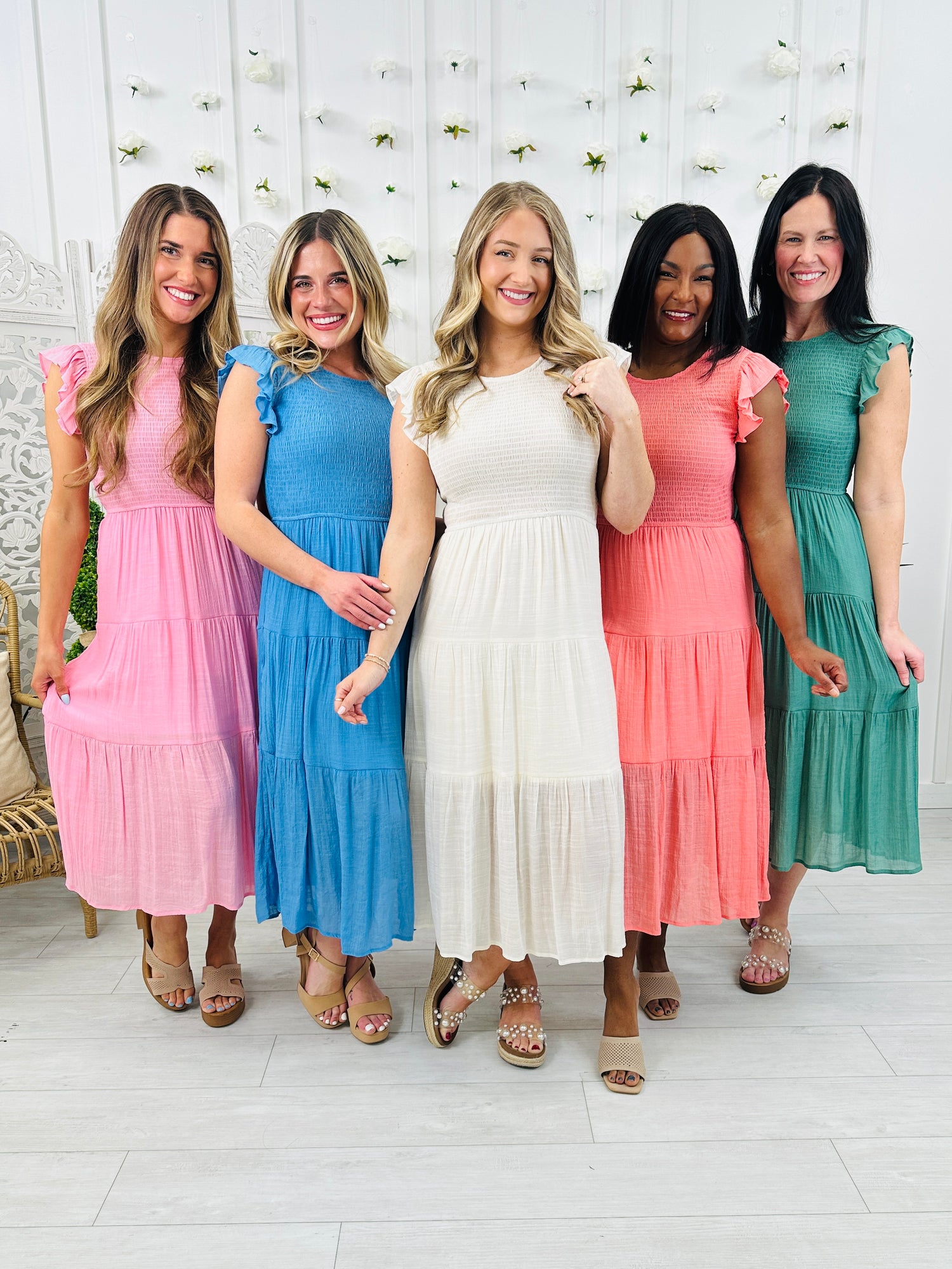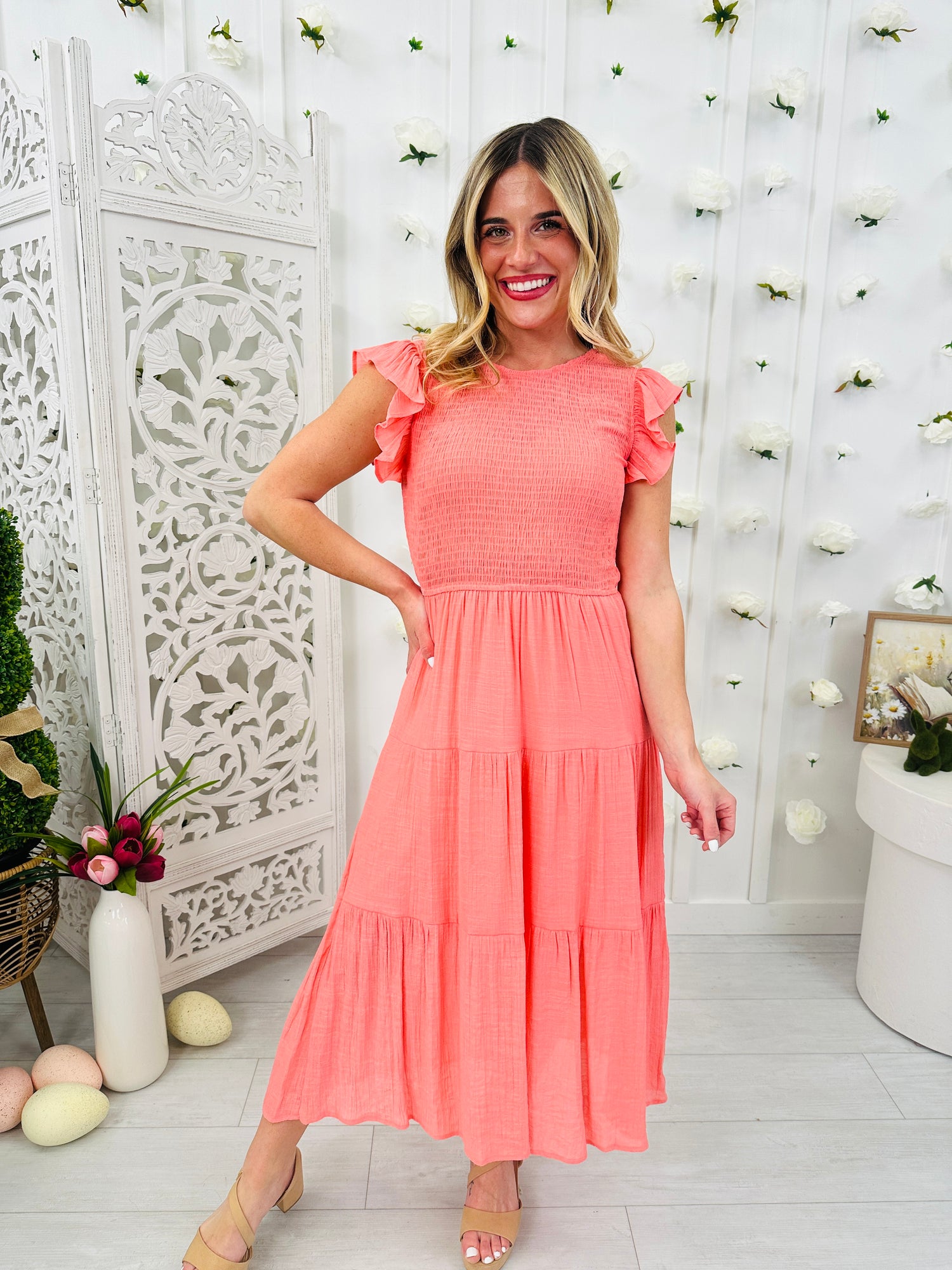 This dress is the perfect mix of flattering shape and effortless comfort. The smocked stretch bodice provides a flexible, comfortable fit while creating a beautifully contoured look through the top. Fluttery ruffled sleeves add a soft feminine touch, and the tiered flowing skirt gives the dress graceful movement with every step. Finished with a comfortable maxi length and available in several colors, this is an easy go-to for everything from casual days out to special occasions.