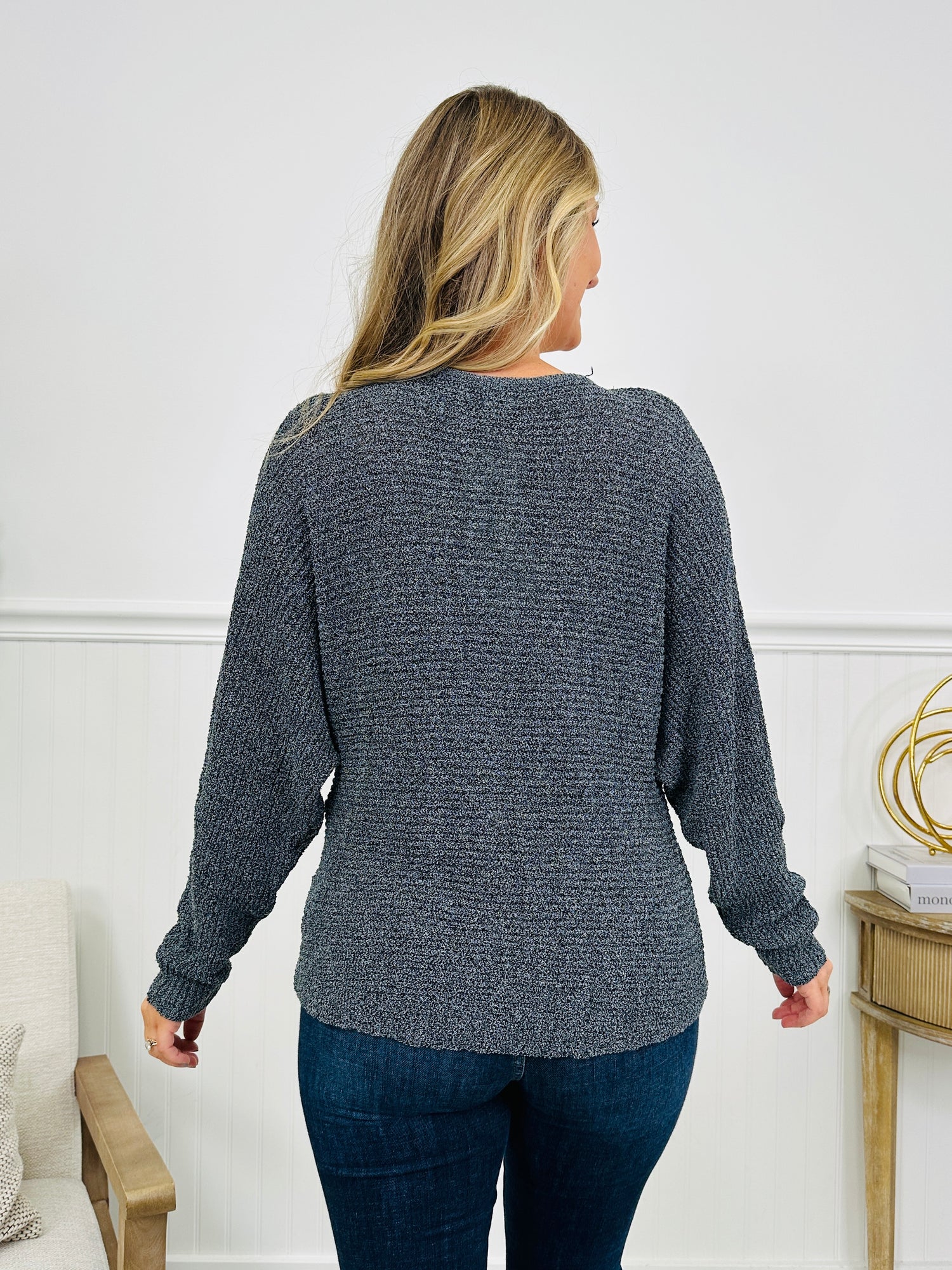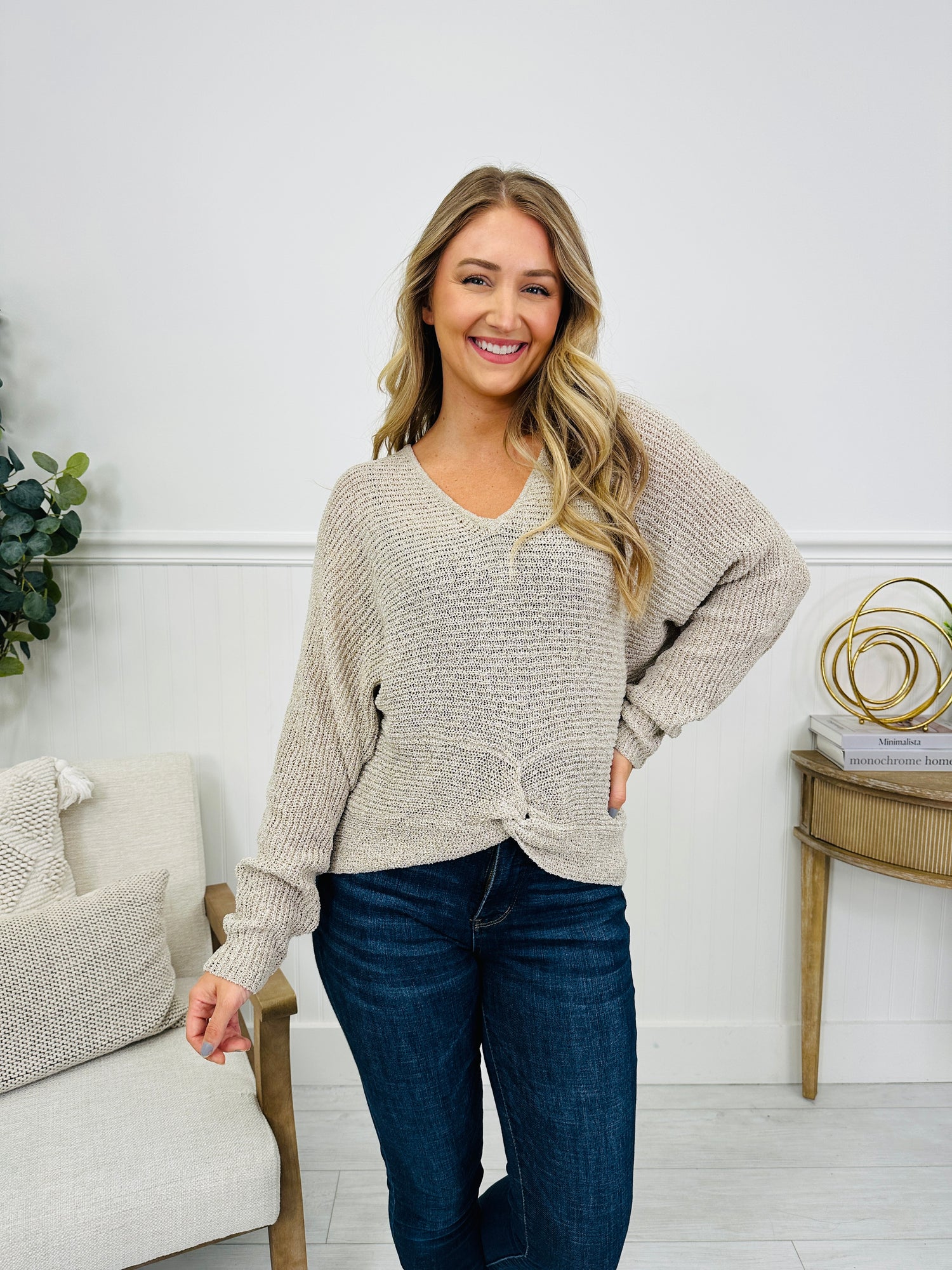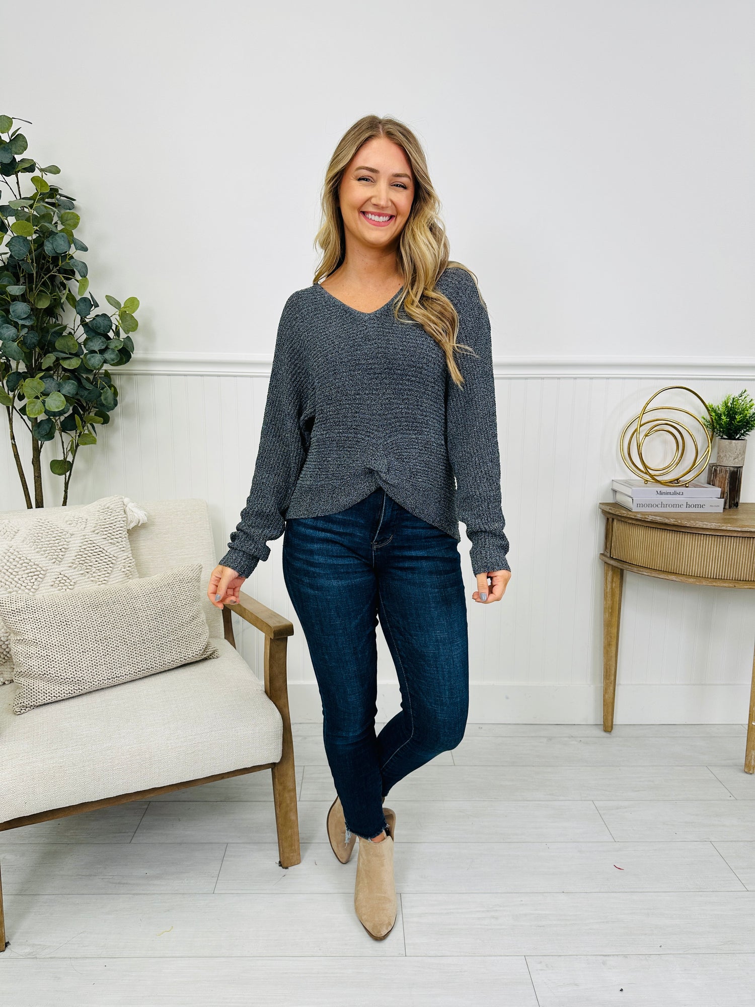 This top features a flattering V-neckline and a twist-front detail that creates a soft draped look through the front. The relaxed fit and cozy knit gives it an easy, everyday feel while still looking polished and put together. Designed for effortless styling and available in several color options, it’s a go-to piece you’ll reach for again and again with your favorite denim or casual bottoms.