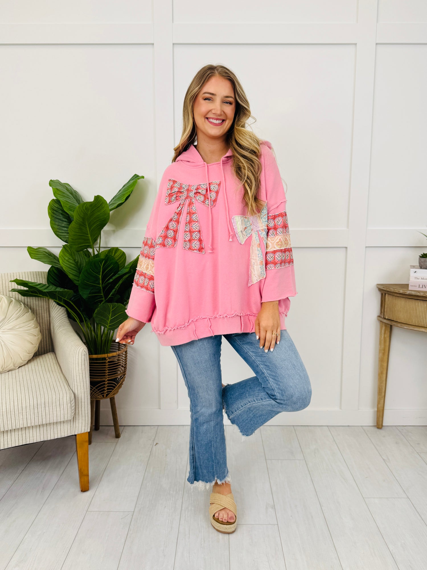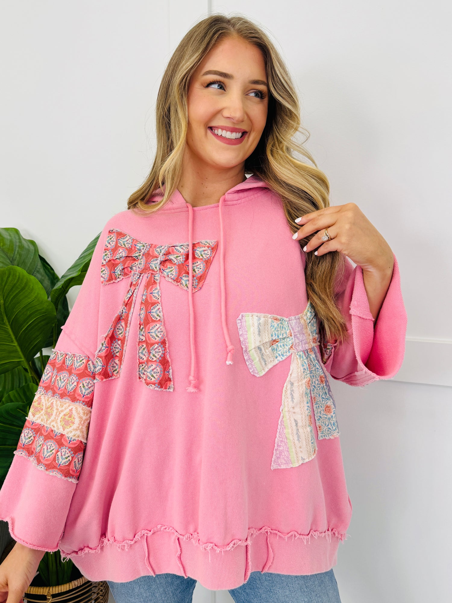 This hoodie stands out with its oversized statement bow accents and mixed-print sleeve bands that add a fun, eye-catching twist. Finished with a drawstring hood and contrast detailing along the hem, it’s an easy throw-on piece that still feels extra and styled.