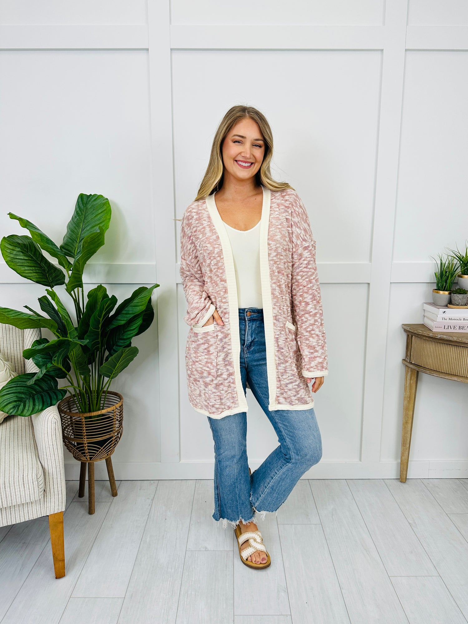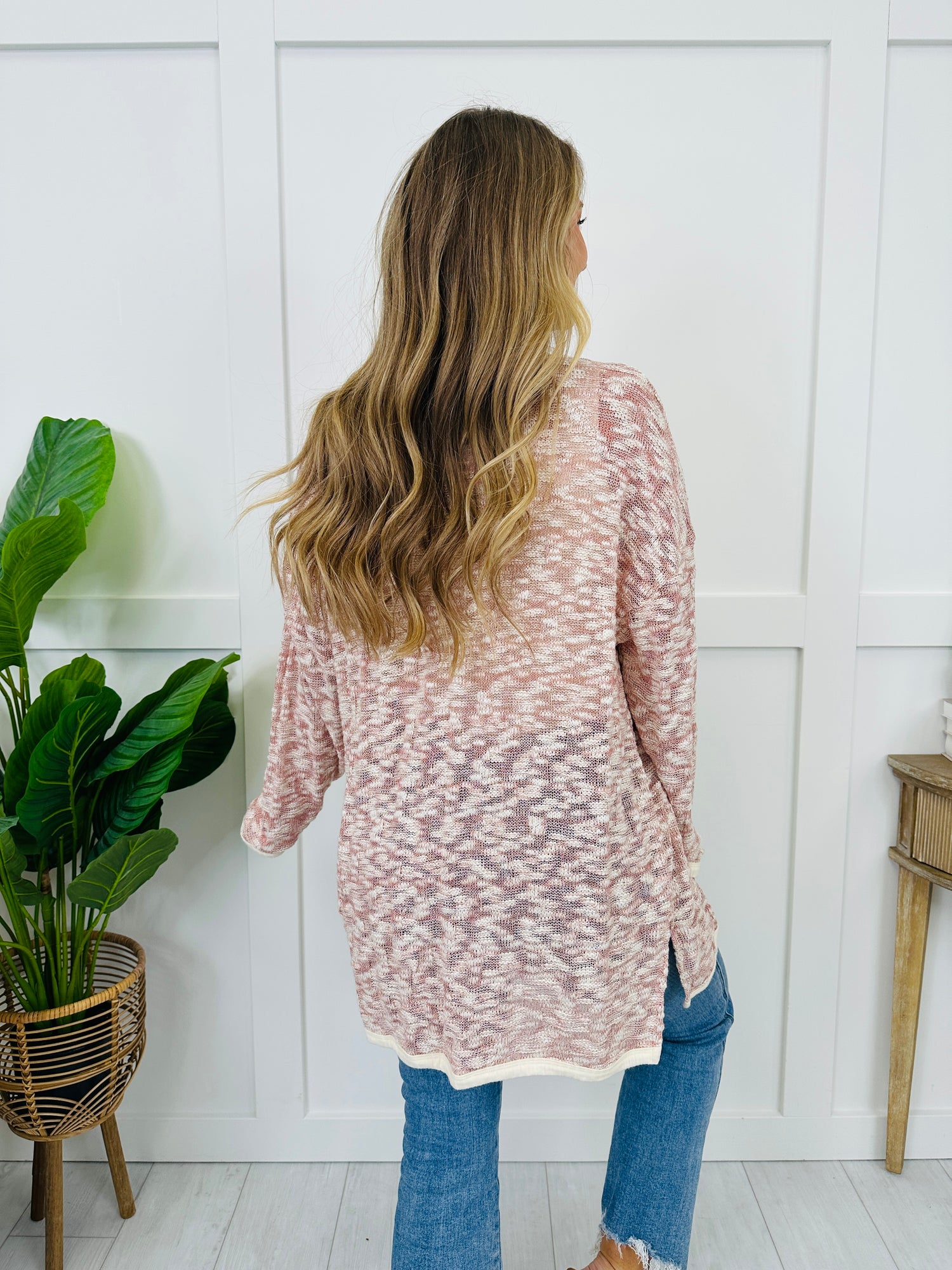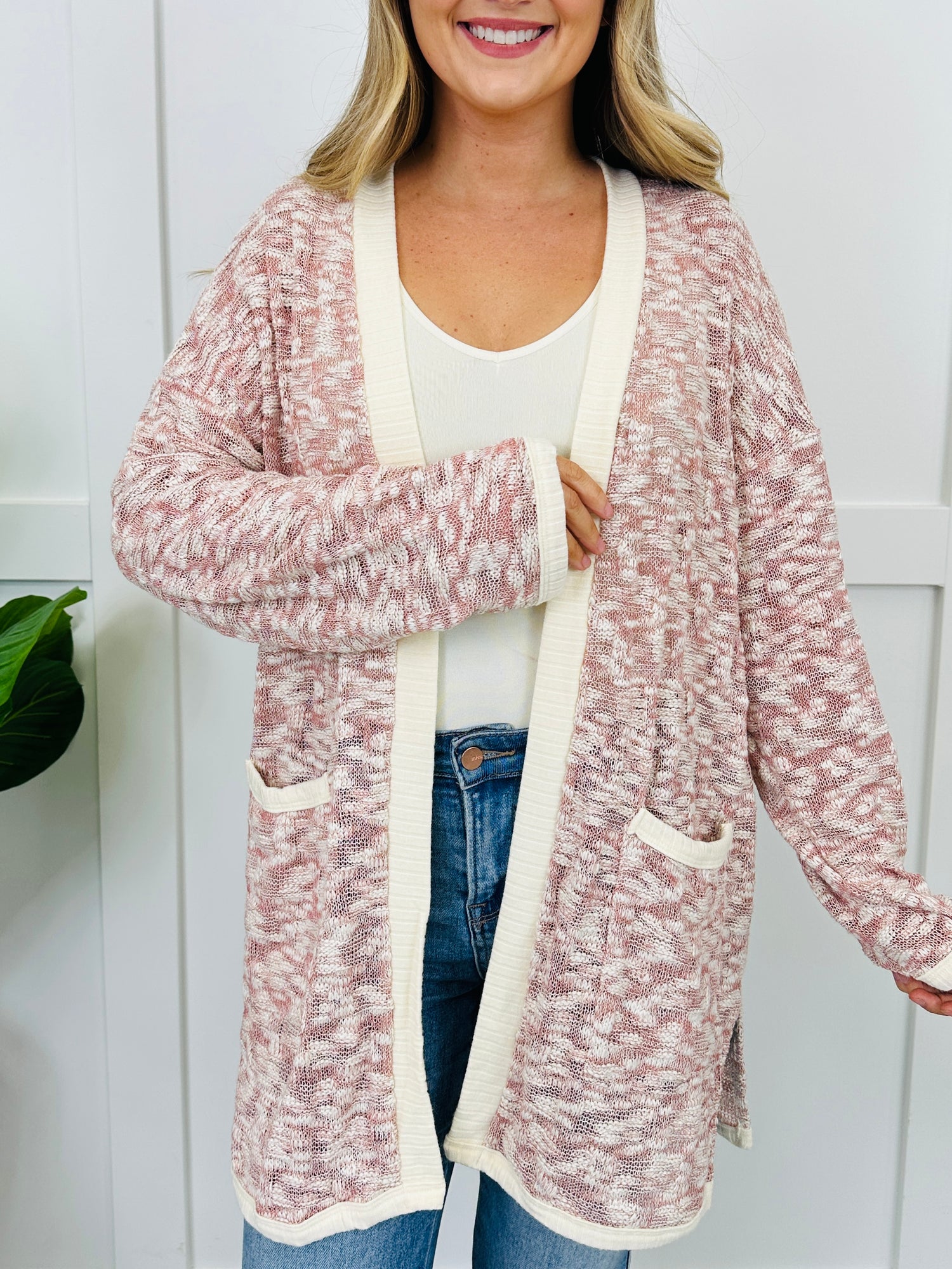 This cardigan is an easy outfit finisher with a two-tone knit texture, clean contrasting trim edges, and front pocket detail for that polished touch. The open-front design and longer length make it effortless to throw on and go, whether you’re dressing up denim or adding a cozy layer to your everyday basics.