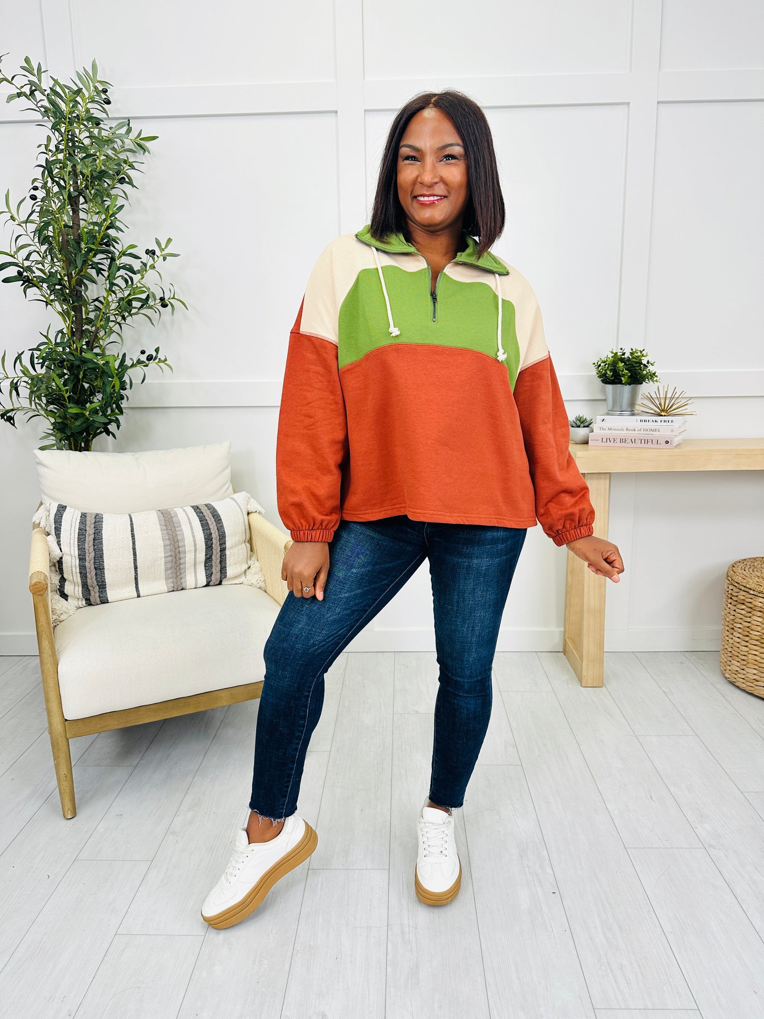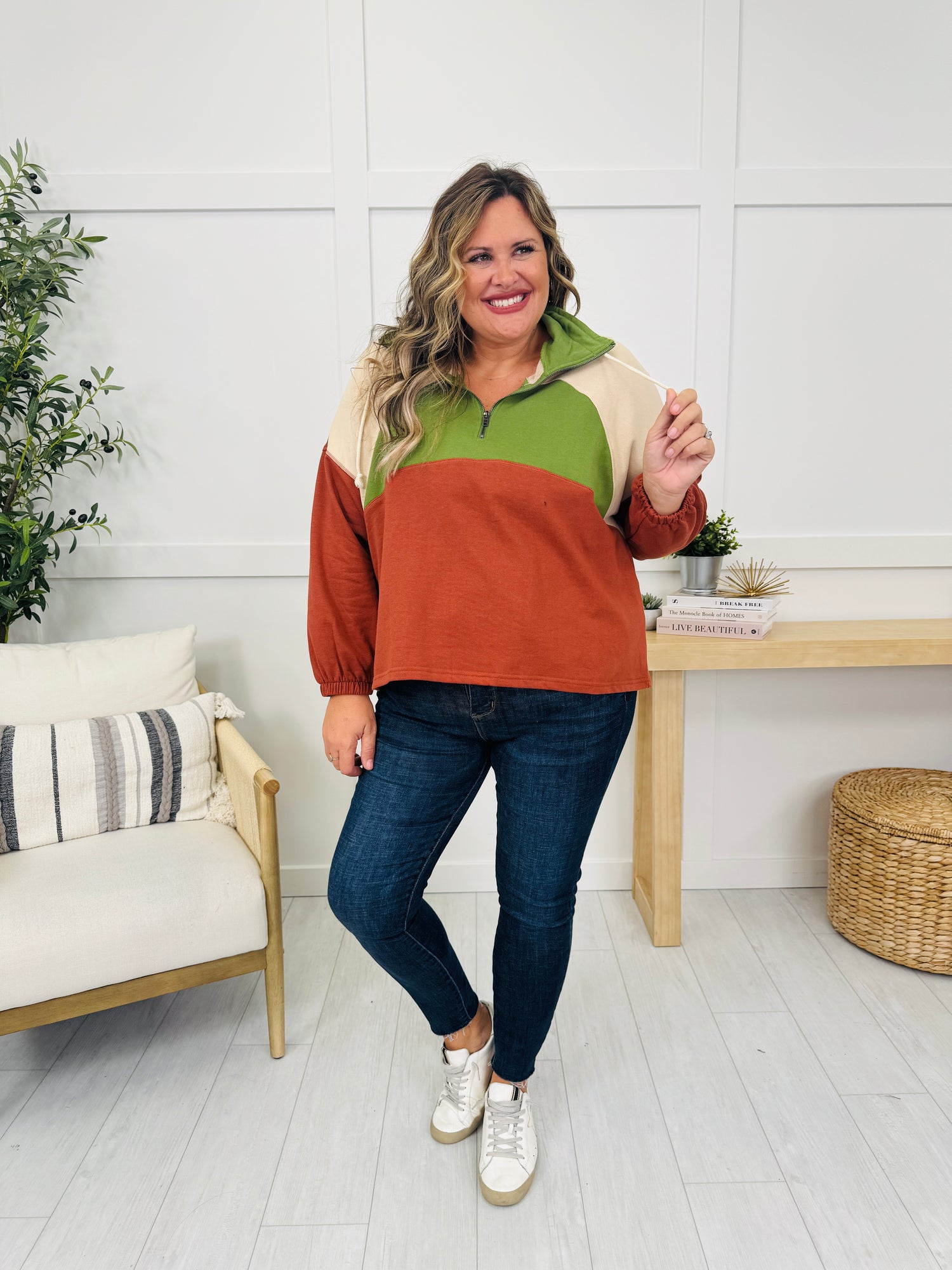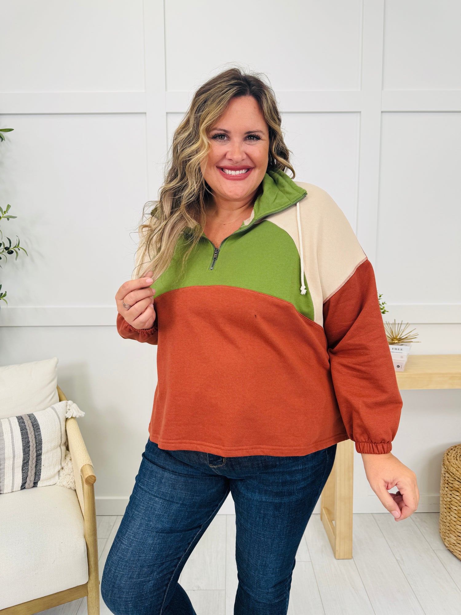This cozy color-blocked pullover is a must-have for cooler days, featuring a chic blend of earthy tones in green, beige, and rust. The half-zip collar adds versatility for temperature control, while the relaxed fit ensures comfort and ease throughout the day. With a casual yet stylish design, this top is perfect for pairing with jeans or leggings for a laid-back look.