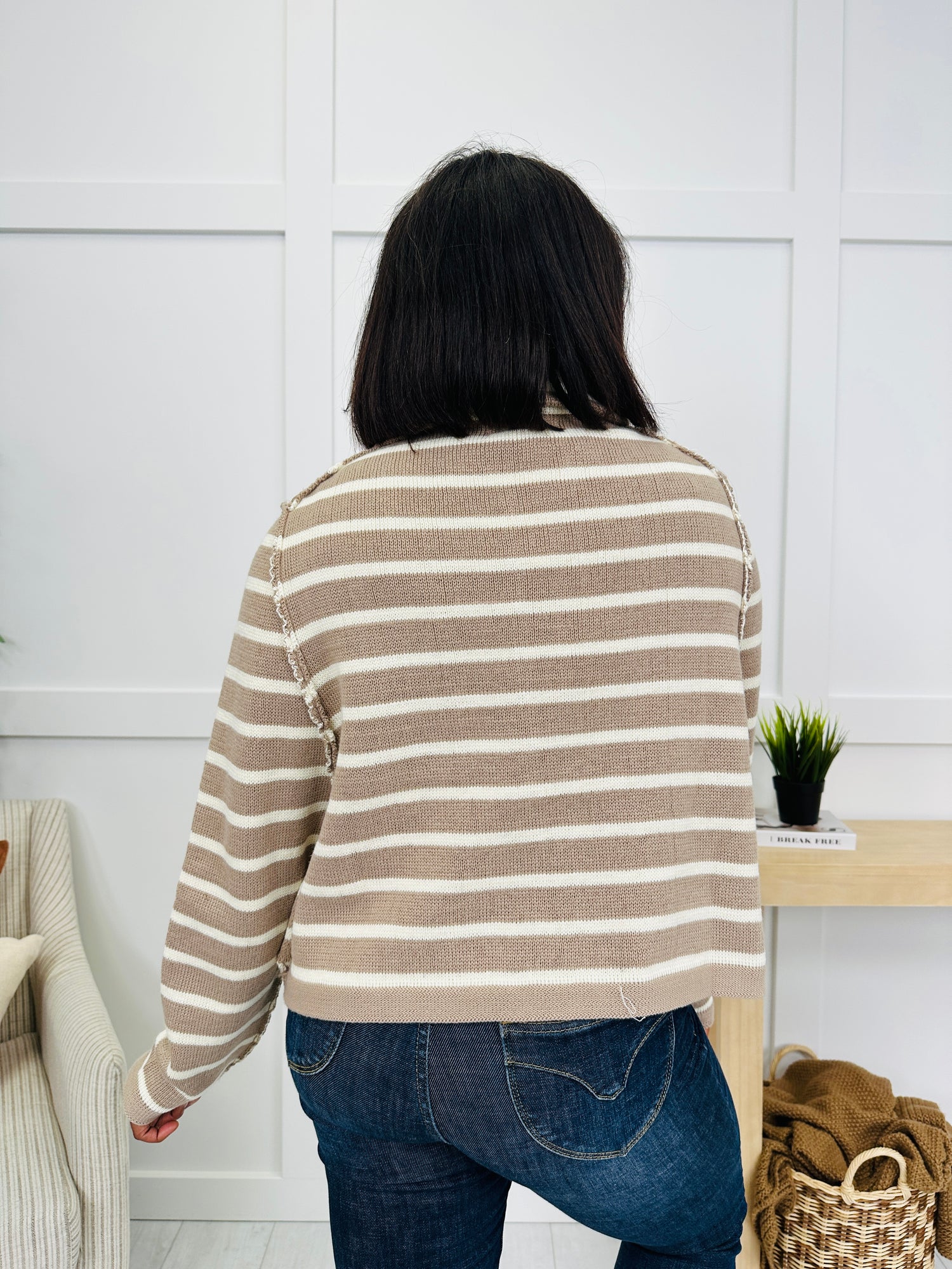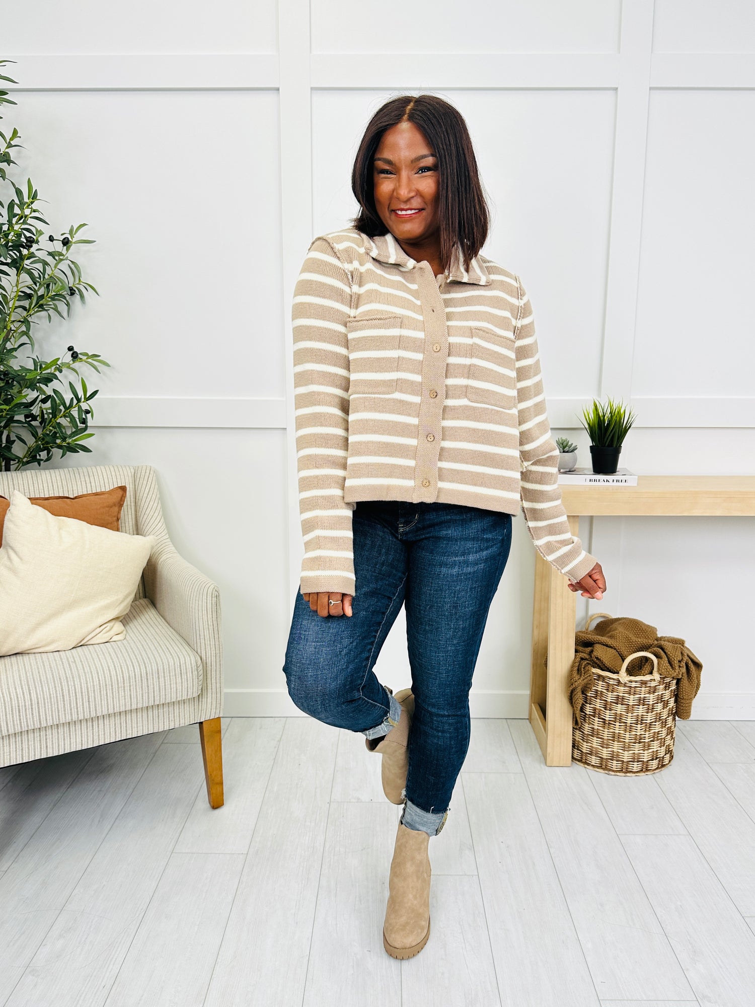 This striped cardigan brings a cozy yet structured feel to your look. The button-front closure and collared neckline give it a polished touch, while the soft knit fabric and neutral stripes make it easy to style for any season. Finished with front patch pockets and lightly stitched seams, it’s a charming mix of casual comfort and effortless sophistication.