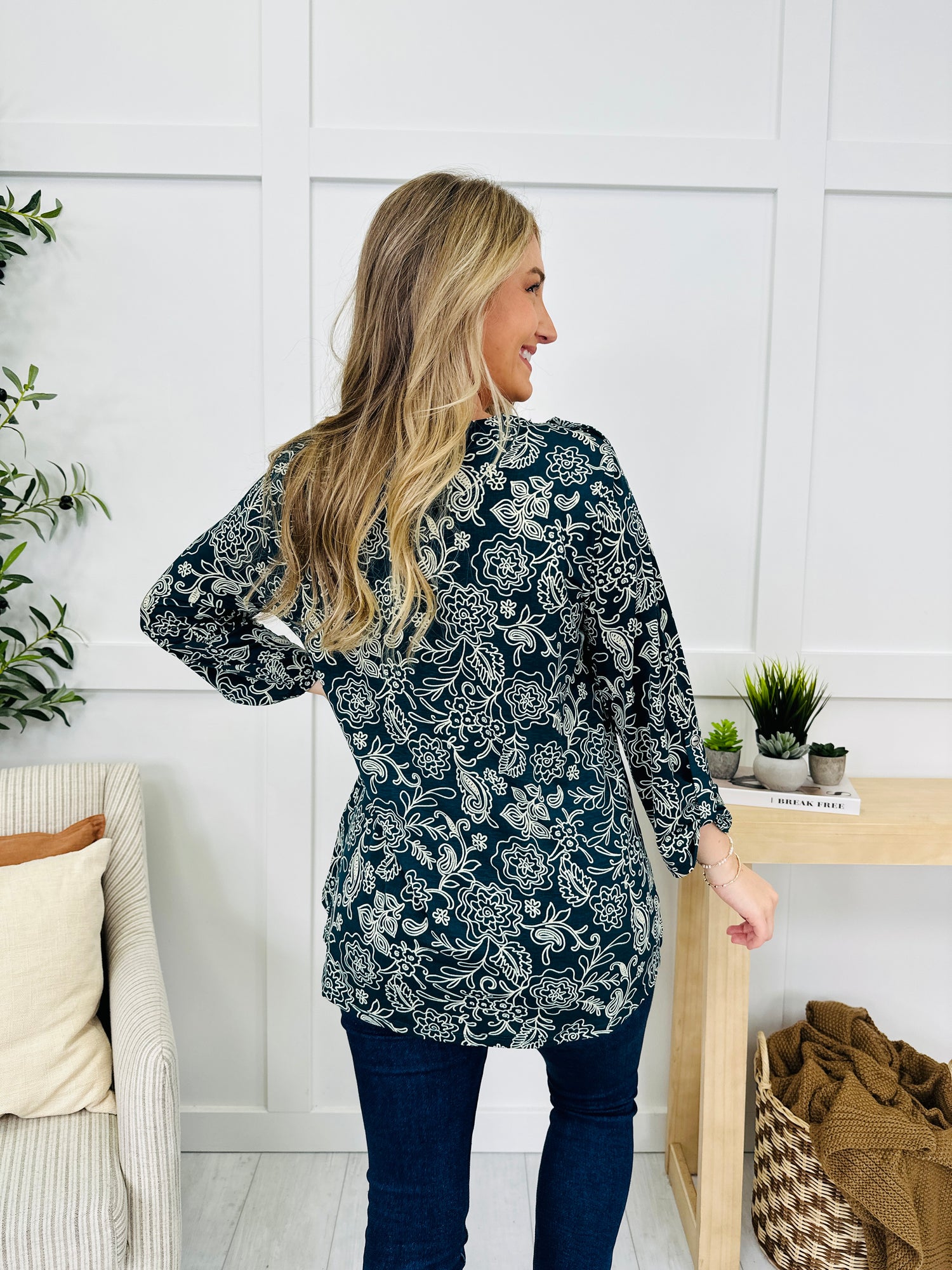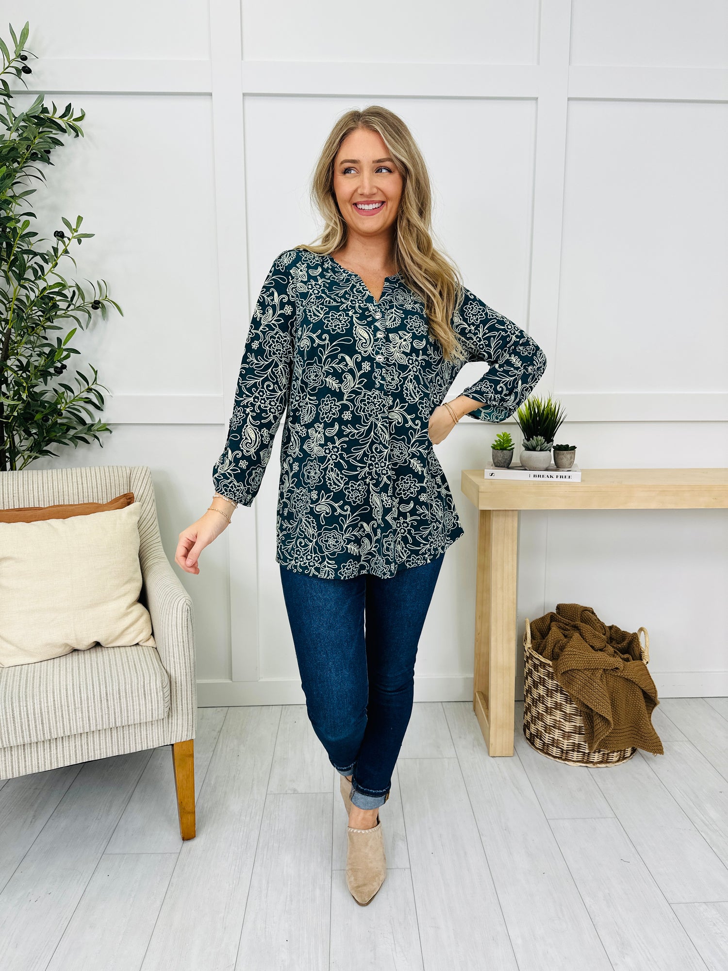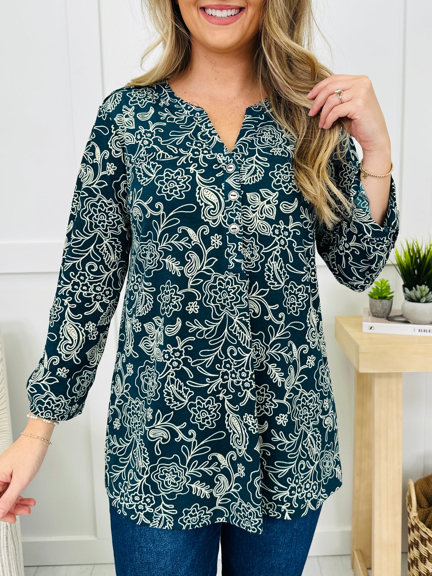 A bold, line-drawn floral pattern pops against the deep teal background, giving this top a fresh, standout look. The notched neckline with a short button placket adds a touch of polish, while the relaxed sleeves and easy tunic length keep it effortless for everyday wear. Finished with a gently curved hem for a flattering, throw-on-and-go silhouette.