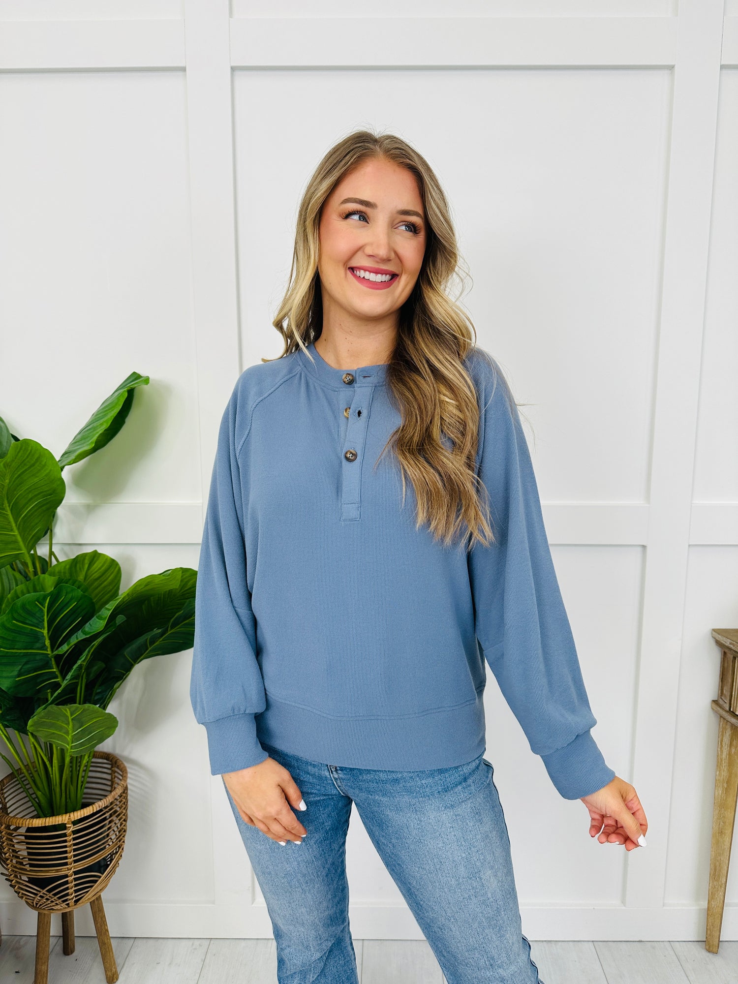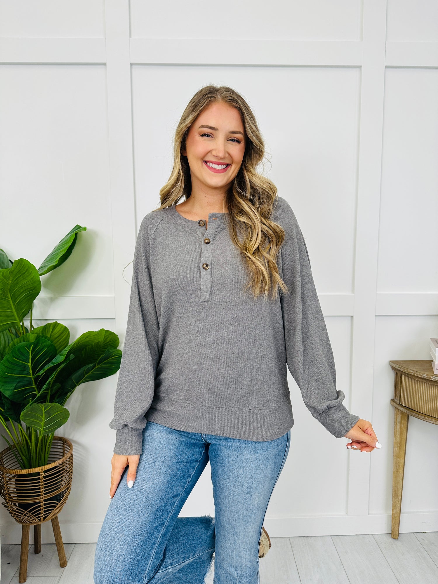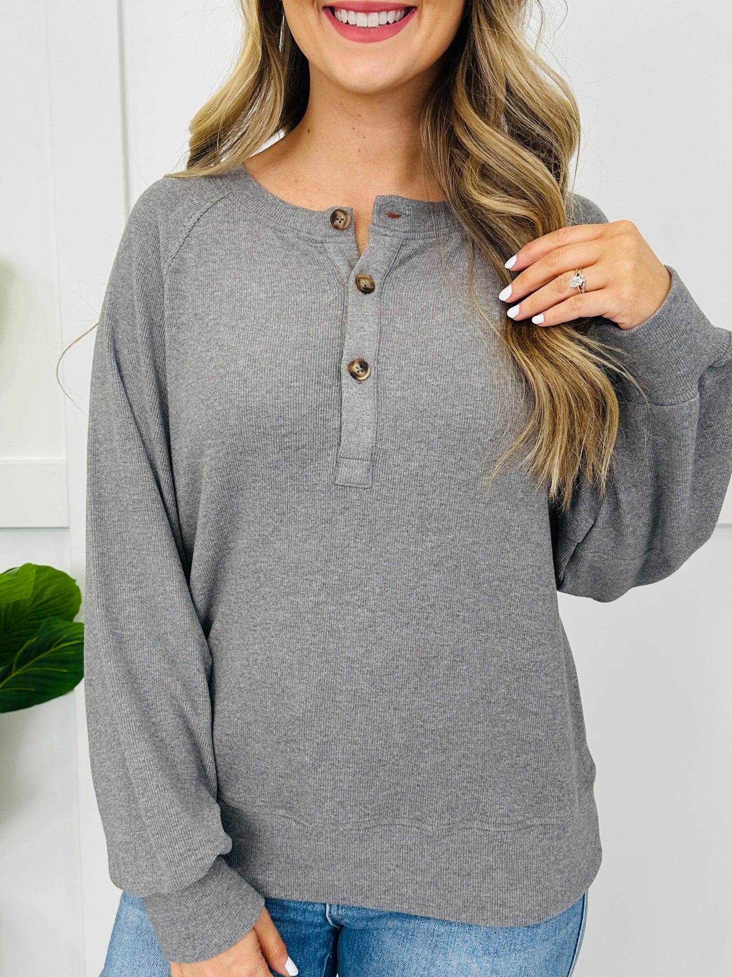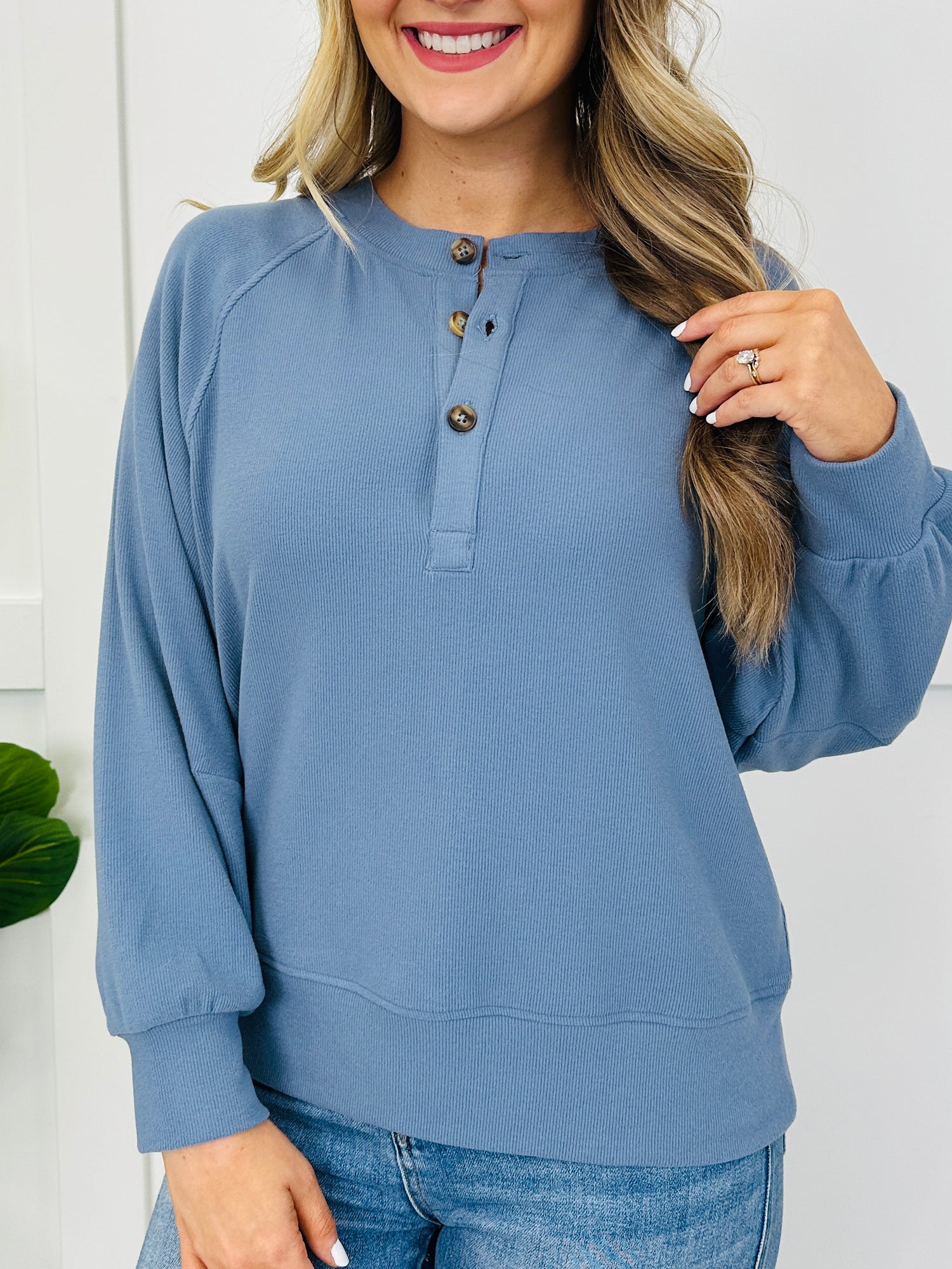 This easy-to-style top stands out with a henley button placket, clean raglan seam detail, and a polished cuffed hem finish that gives it a put-together look. The subtle allover texture keeps it from feeling basic, and since it comes in several colors, it’s an effortless go-to for dressing up denim or keeping it simple with leggings.