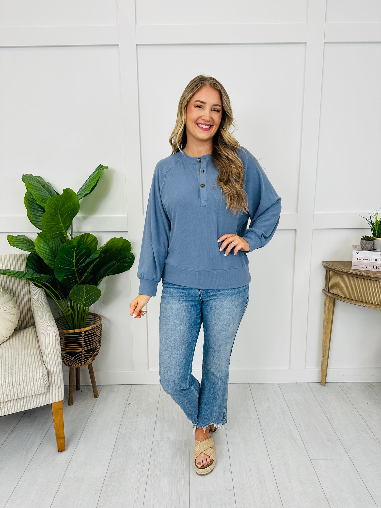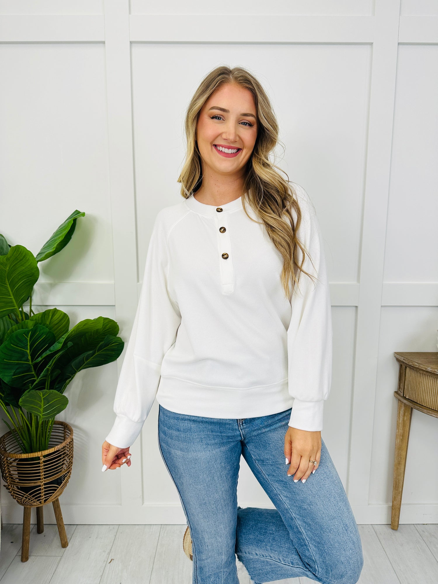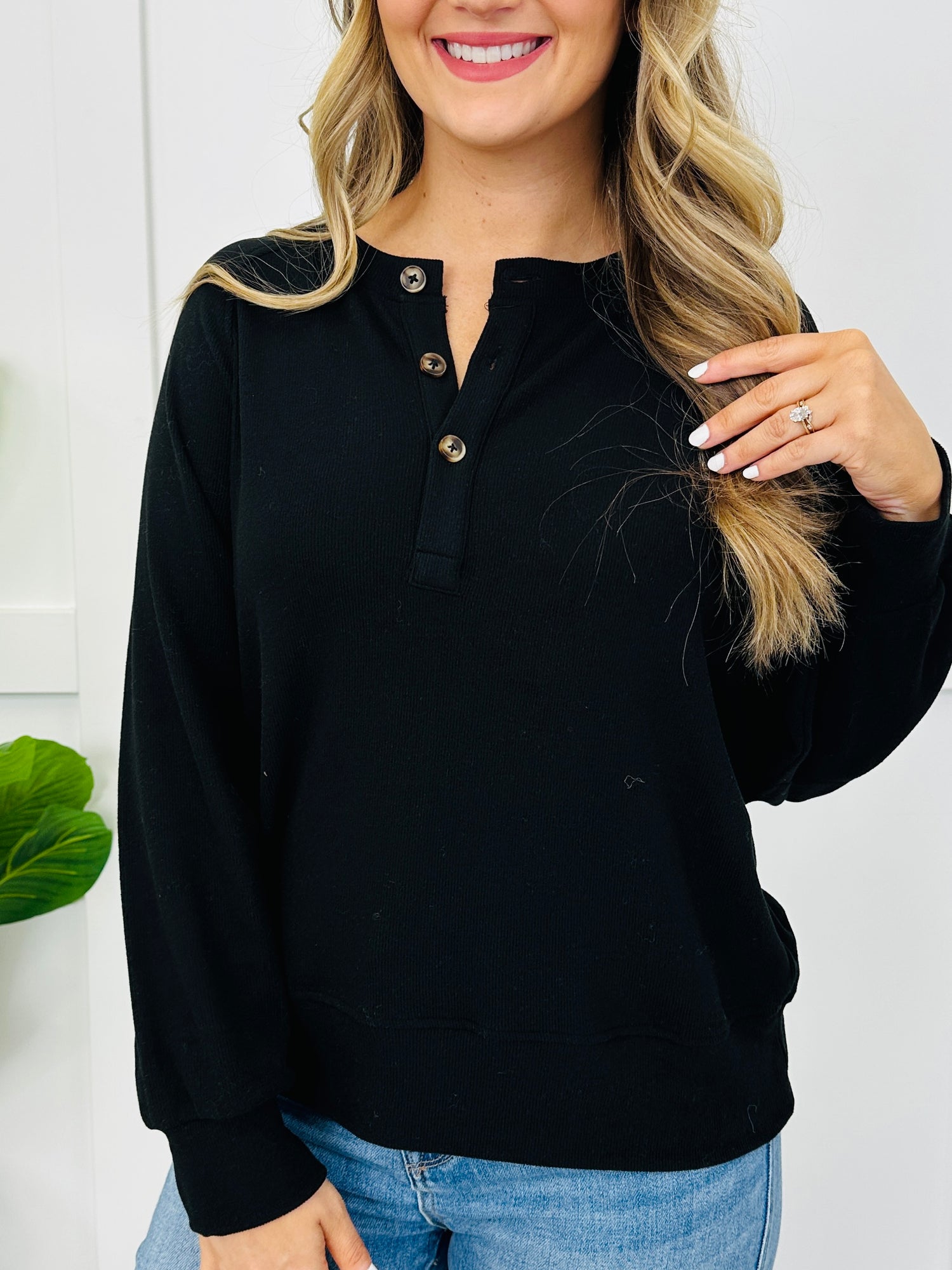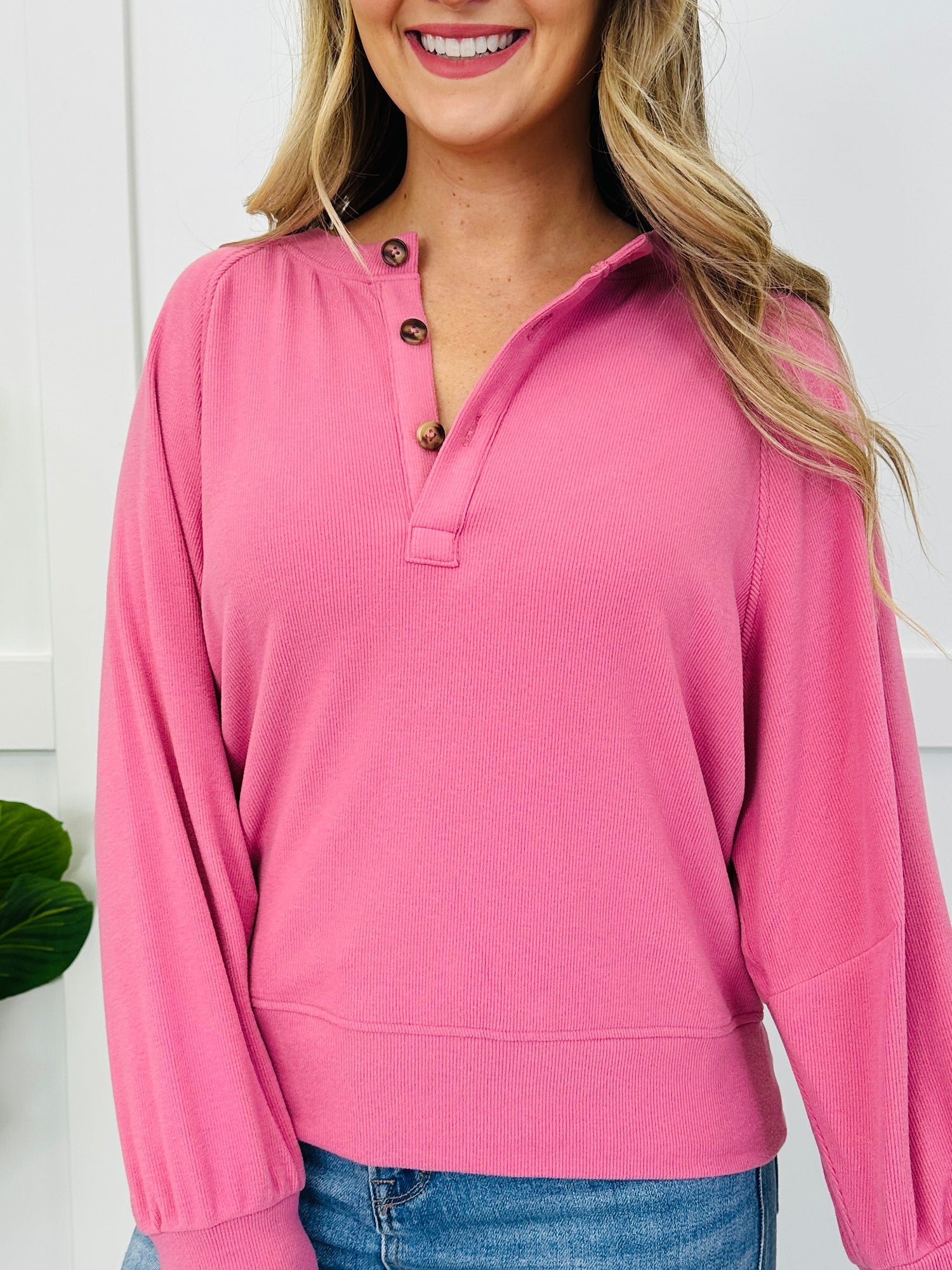 This easy-to-style top stands out with a henley button placket, clean raglan seam detail, and a polished cuffed hem finish that gives it a put-together look. The subtle allover texture keeps it from feeling basic, and since it comes in several colors, it’s an effortless go-to for dressing up denim or keeping it simple with leggings.