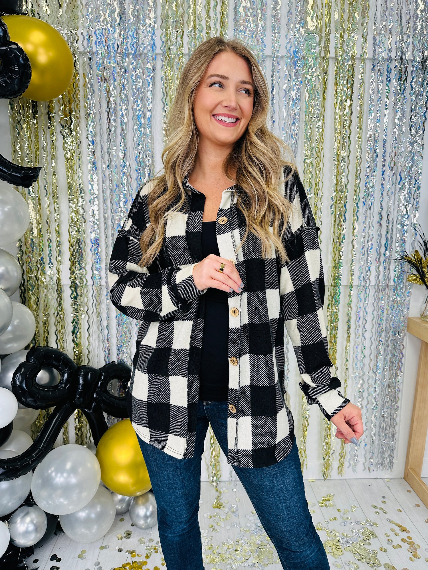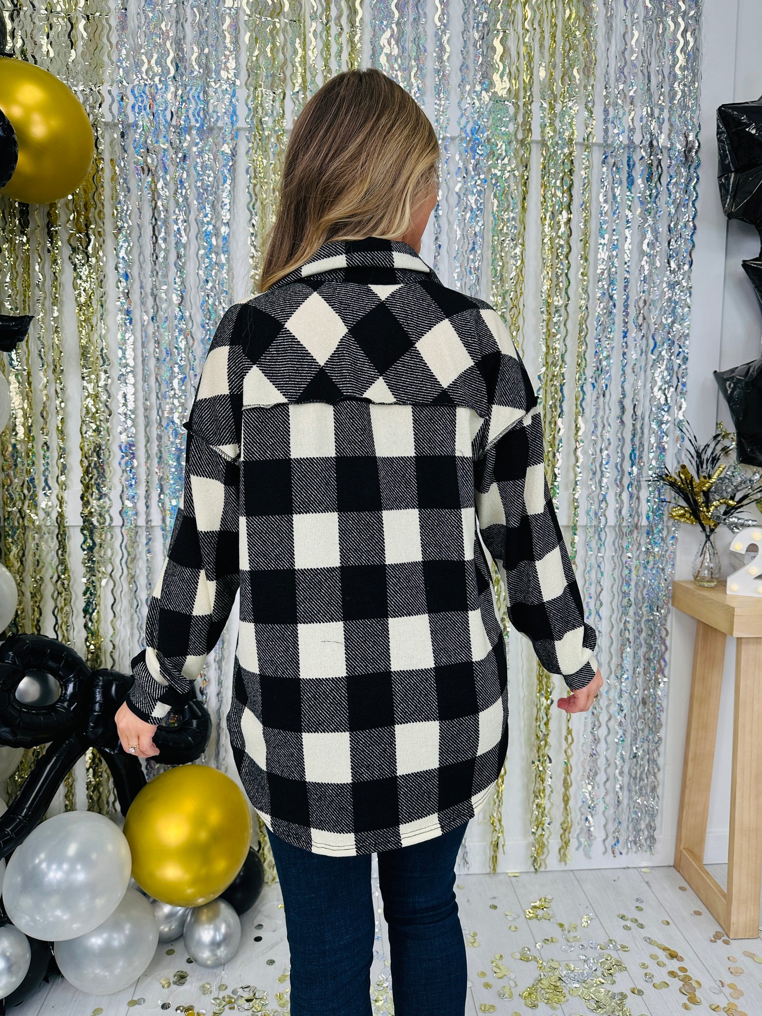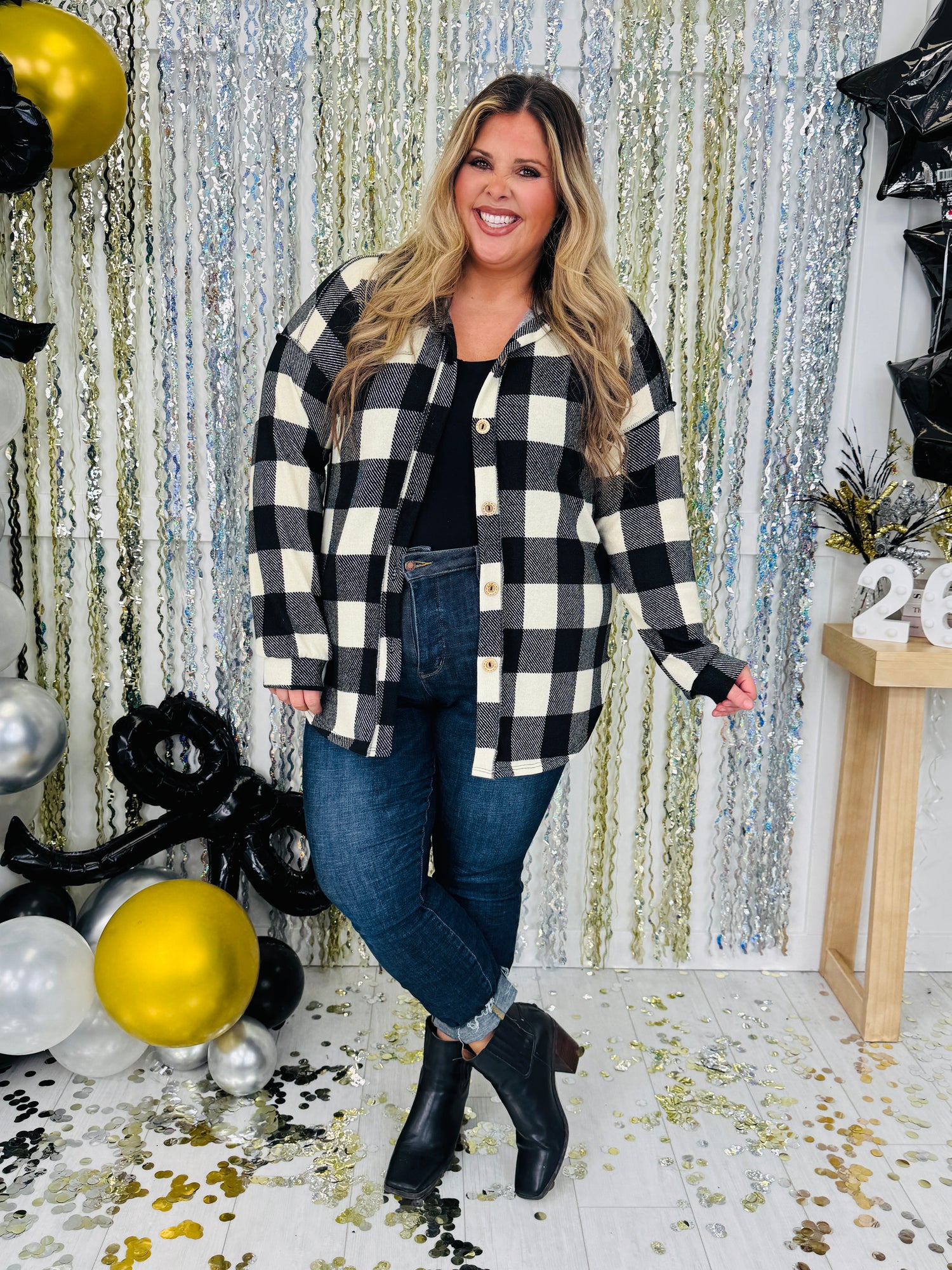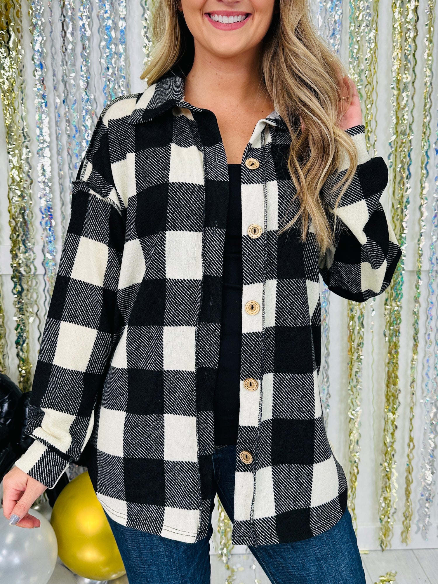 This classic buffalo check shacket brings that effortless, throw-on-and-go vibe with its bold pattern and soft high quality material. The button-up front keeps things casual and versatile, making it a piece you can wear open over a tank or buttoned for a comfy, put-together look. Finished with a cozy-cute longer length, it’s the kind of everyday favorite you’ll reach for again and again.