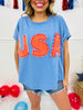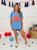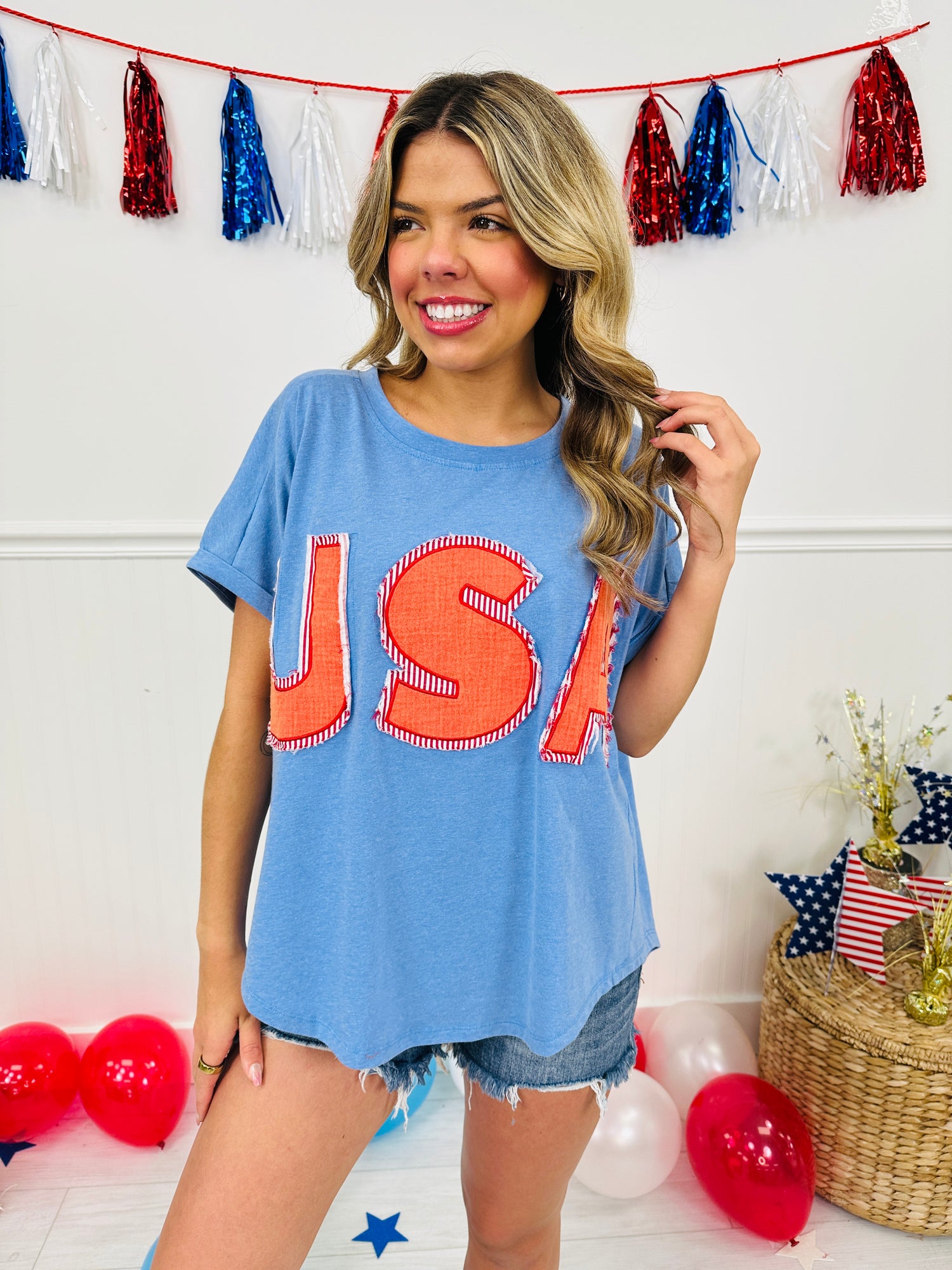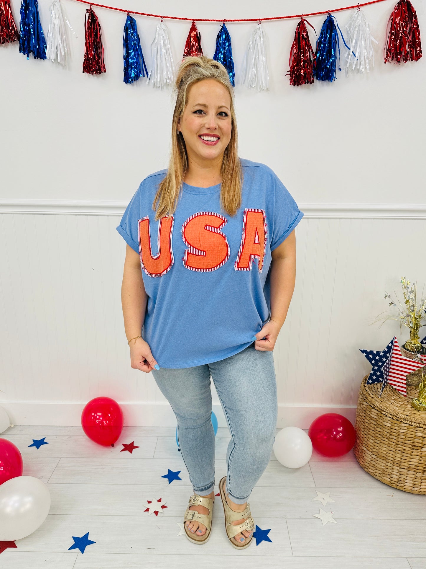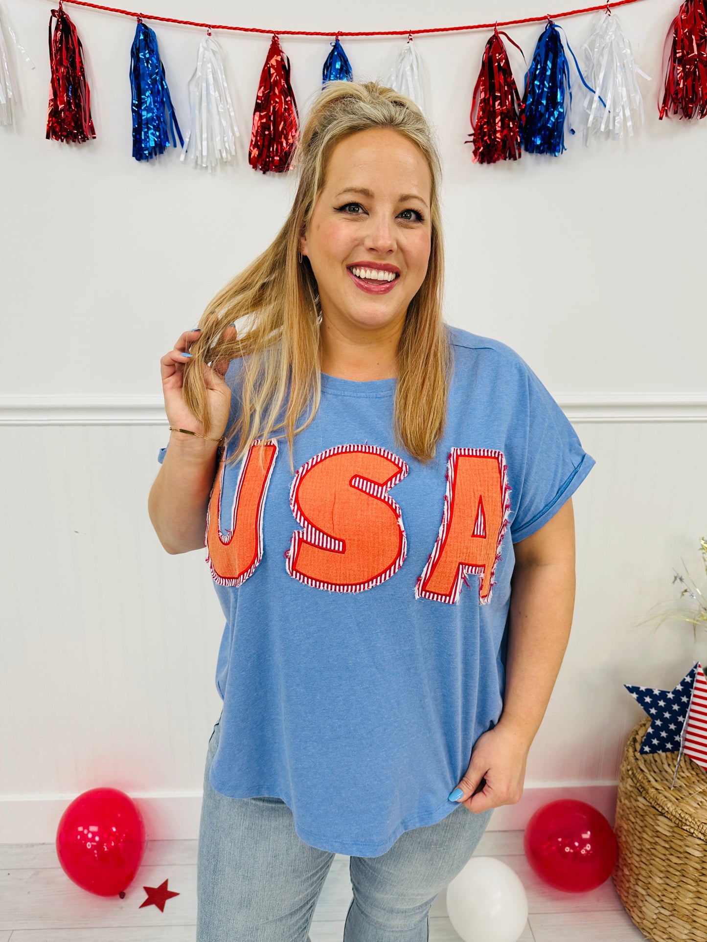 This festive USA tee is full of spirited charm with its bold raw-edge appliqué letters outlined in a red-and-white stripe that adds just the right amount of playful flair. The cuffed sleeves and roomy silhouette make it the ultimate grab-and-go piece for your summer festivities—think parades, BBQs, and everything in between. With its comfortable feel and standout design, this top delivers all the patriotic vibes with zero effort.