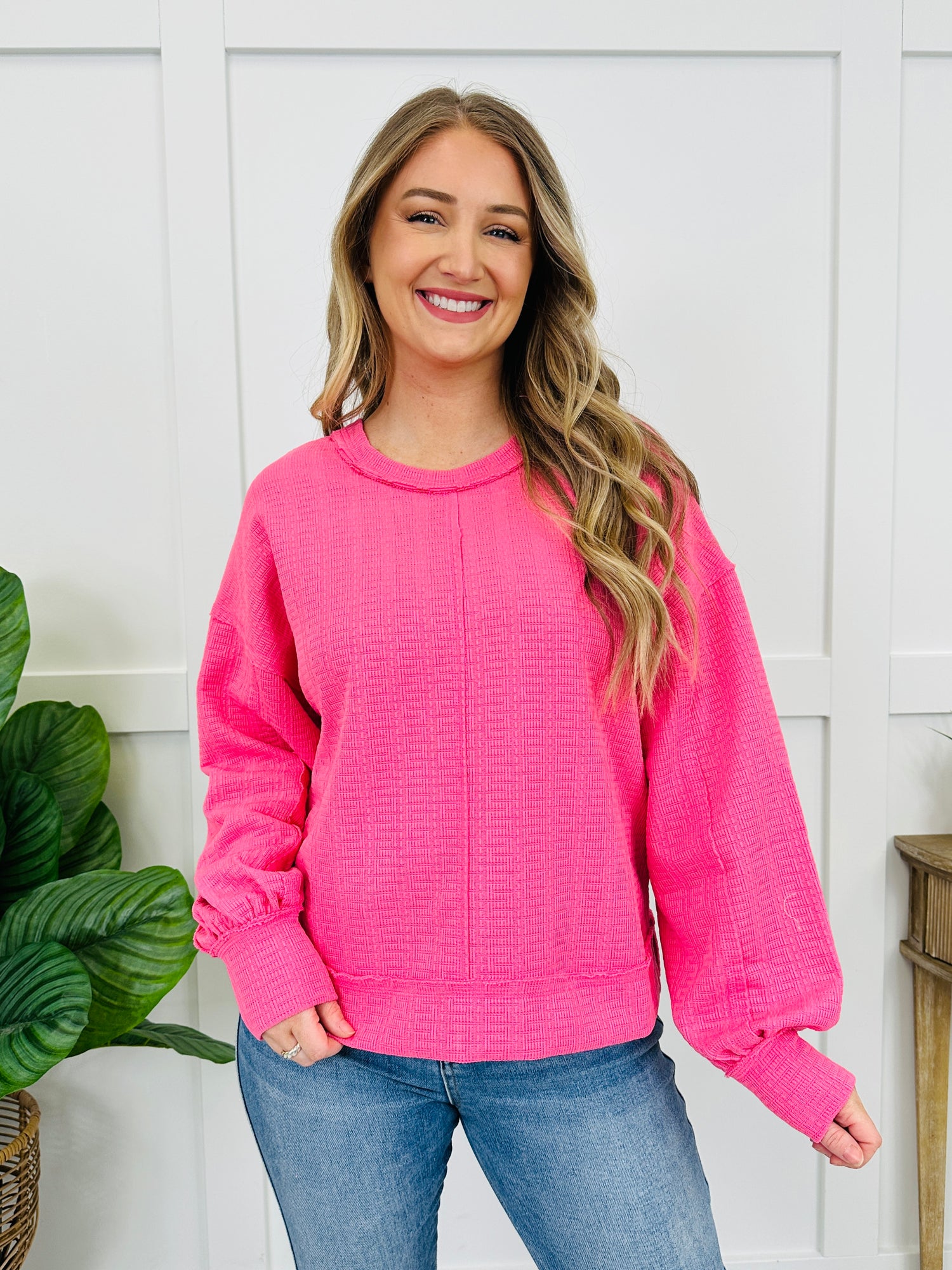 This easy top stands out with its textured knit pattern and the exposed seam detail that runs down the front for a little extra something. The blousy lantern sleeves add a soft, feminine shape, finished with comfy cuffed wrists that keep the look polished and effortless. It’s the kind of throw-on-and-go piece that feels elevated with denim but still looks just as cute with your everyday bottoms.