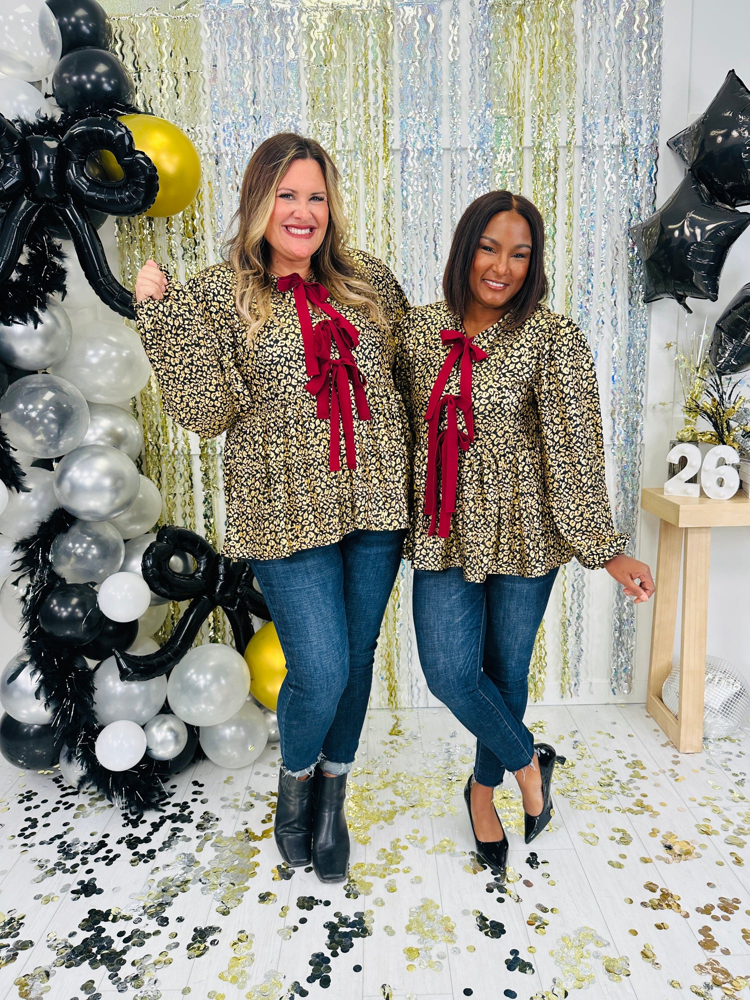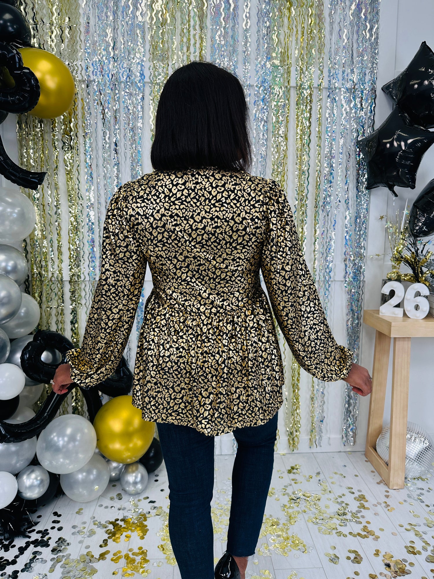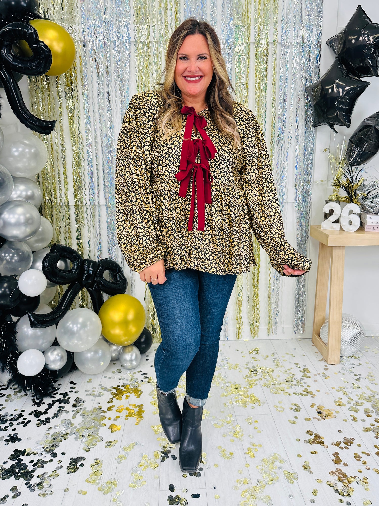 This eye-catching blouse features a bold and shimmery leopard print pattern that adds a fun, trendy touch to your wardrobe. The contrast bow tie detail at the neckline creates a playful yet sophisticated look, while the puffed sleeves offer a flattering, feminine silhouette. Perfect for pairing with jeans or trousers, this top effortlessly combines style and comfort, making it a versatile addition to both casual and dressy outfits.