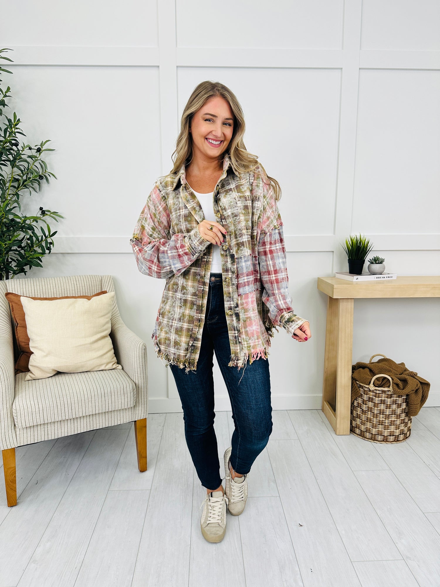 This top is all about effortless charm with its patchwork plaid design that brings together a mix of classic patterns in earthy tones. The button front detail adds a timeless touch, while the frayed hem finish gives it a laid-back edge that sets it apart. Whether worn open over a tank or buttoned up on its own, this piece is a versatile style you’ll reach for again and again.