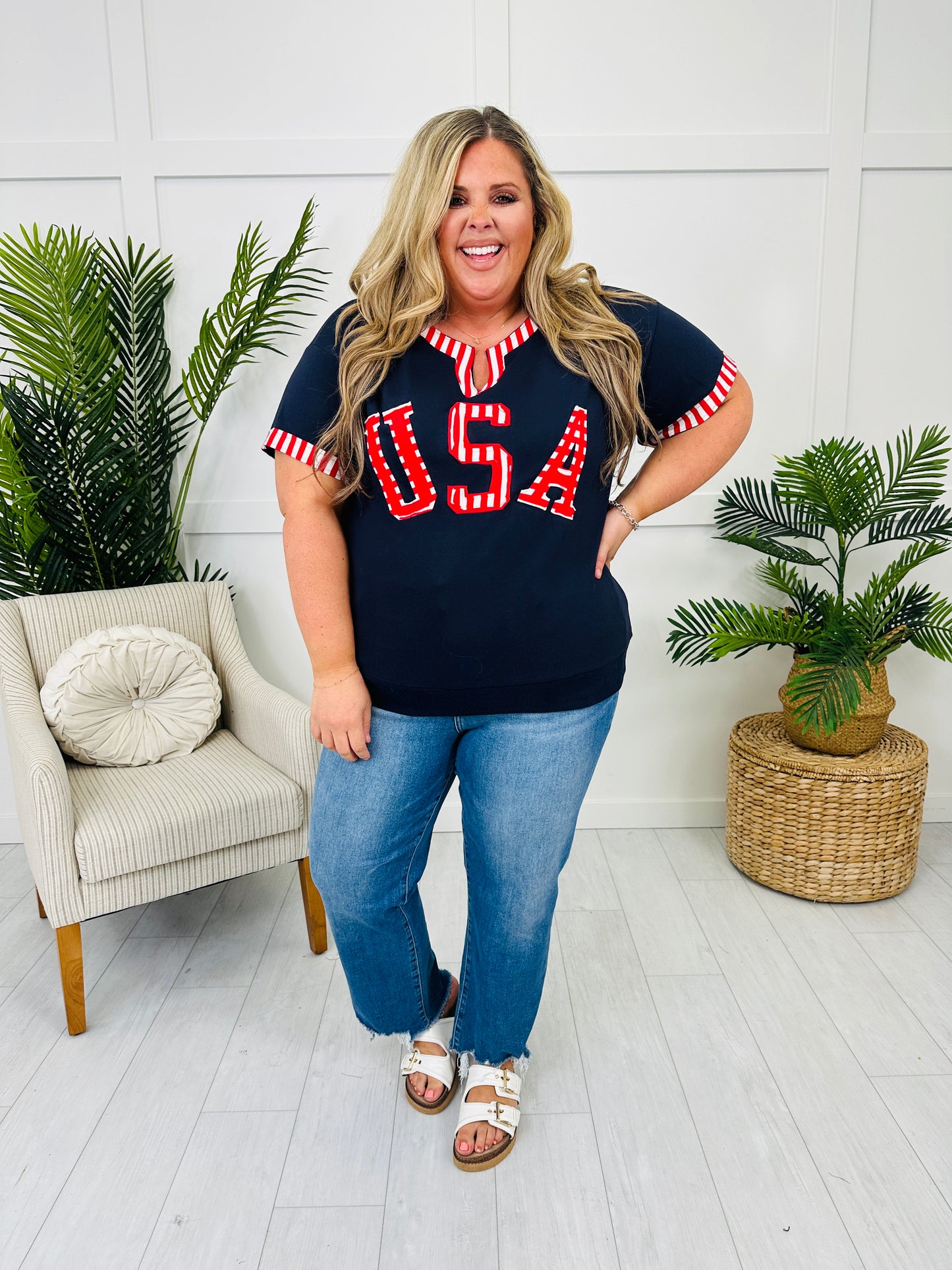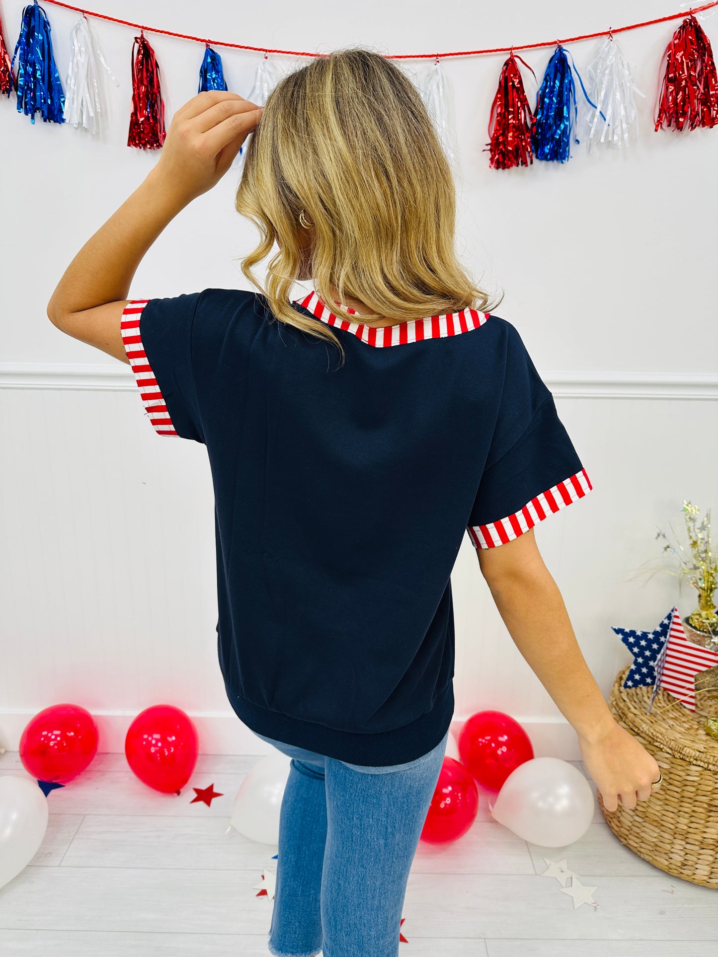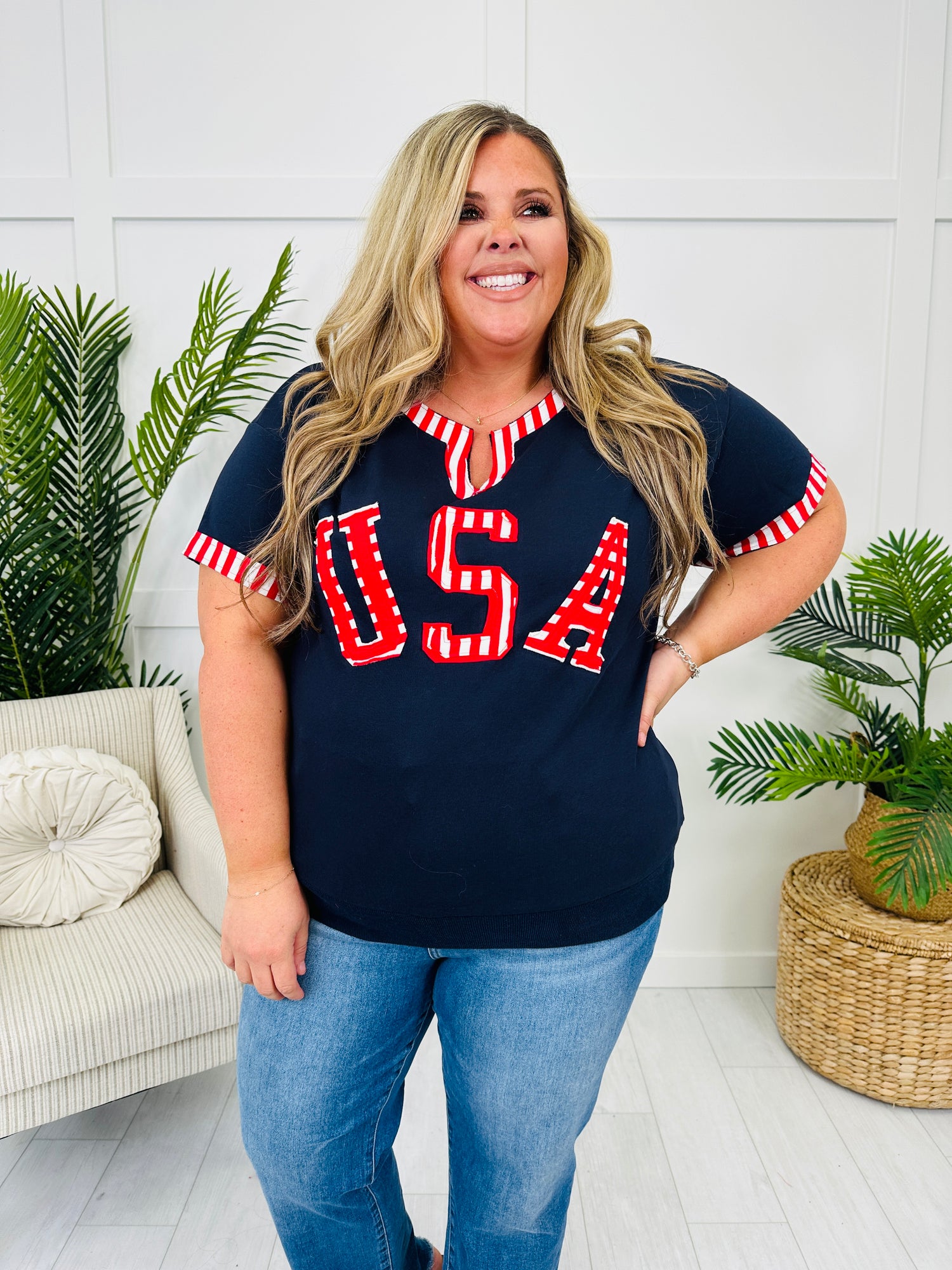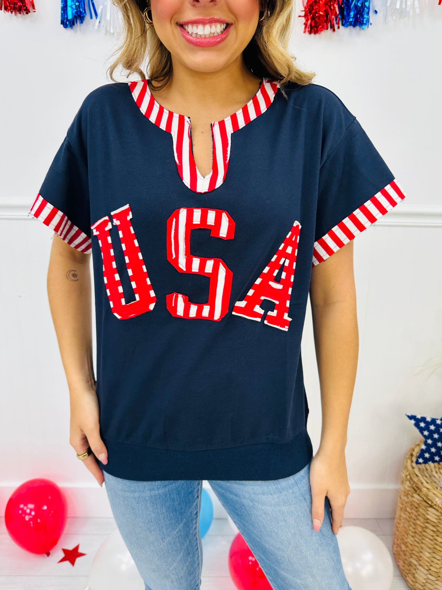 Patriotism never looked so cute! This festive top features bold striped trim at the sleeves and neckline, along with varsity-inspired USA lettering that pops with playful charm. The relaxed fit and notched neckline make it an easygoing staple you'll love styling for barbecues, parades, and everything in between.