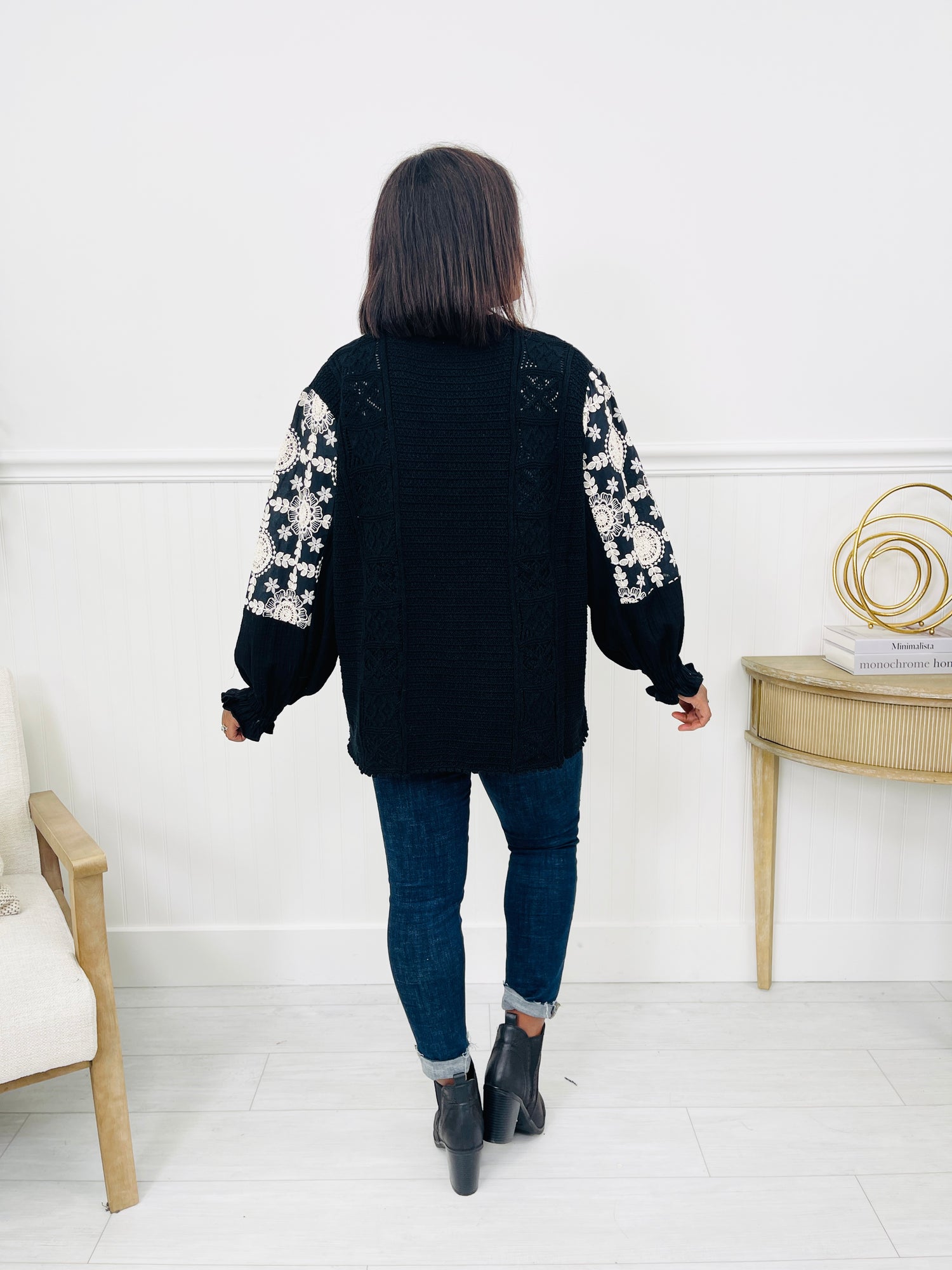This charming cardigan features intricate boho-inspired crochet details along the front, complemented by beautifully embroidered sleeves. The relaxed fit and puffed sleeve cuffs offer a comfortable and stylish look, while the button-down front adds an extra touch of versatility. Perfect for layering over your favorite outfits, this piece combines both casual comfort and striking design.