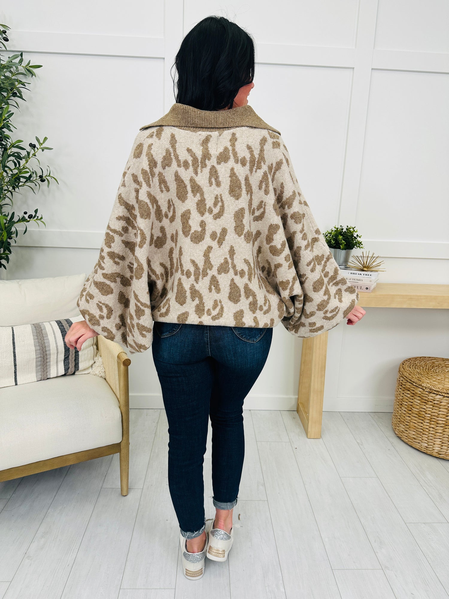 This cozy sweater features a trendy leopard print pattern in neutral tones, making it a versatile addition to your wardrobe. With its relaxed fit and textured knit fabric, it provides ultimate comfort while keeping you stylish. The split V-neckline and balloon sleeves add a touch of detail to this chic, casual piece, perfect for pairing with your favorite jeans for an easy, go-to look.
