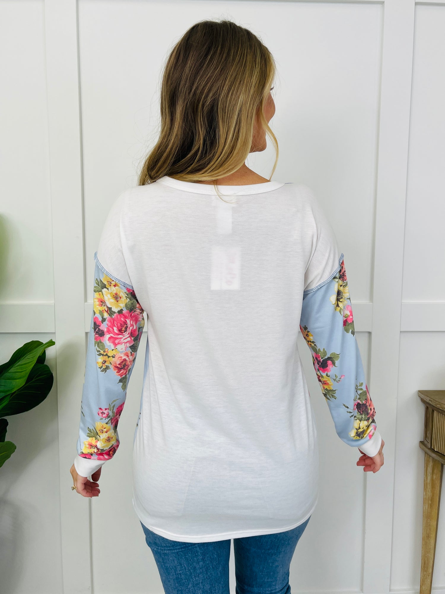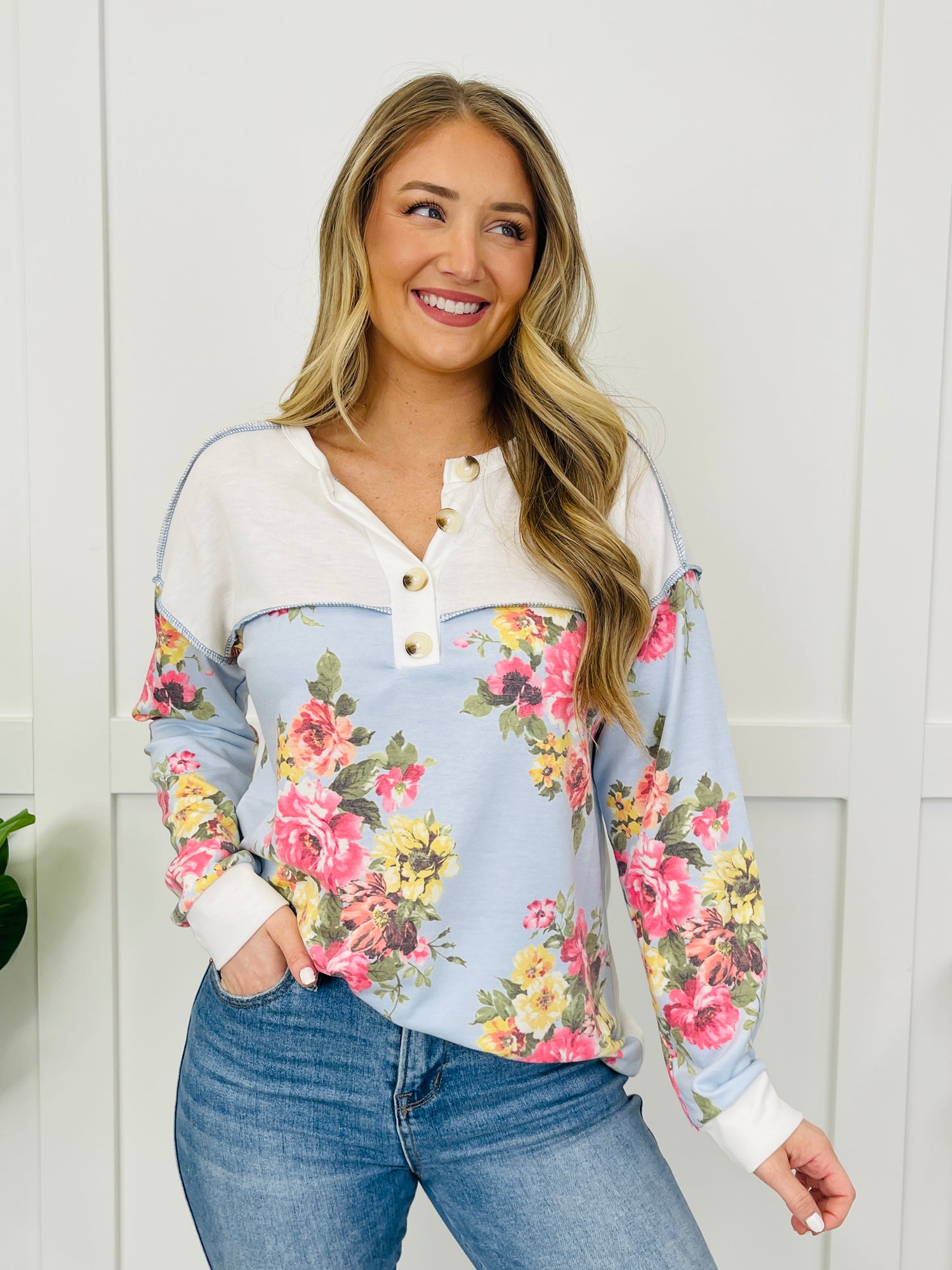 This dreamy long sleeve top is as charming as it is comfy! With its sky blue floral base, ivory buttoned neckline, and contrast stitching details, it’s full of thoughtful touches that stand out. The soft fabric and flattering fit make it a go-to pick for adding a playful, feminine flair to your everyday wardrobe.