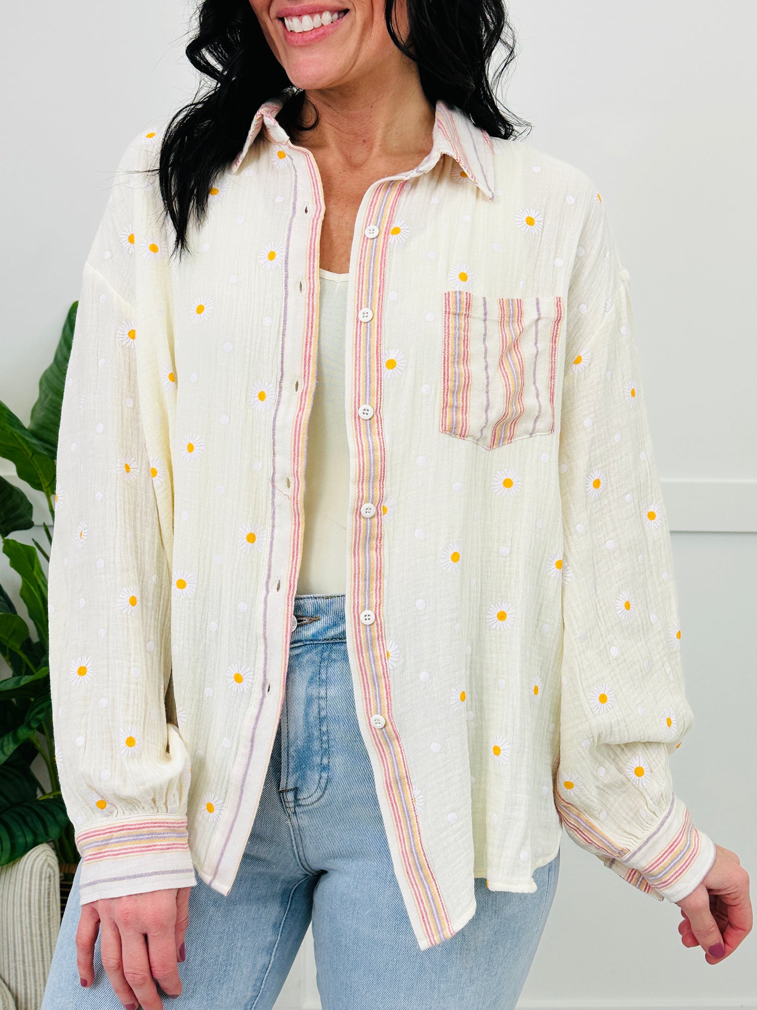 This button-front top features a playful daisy-and-dot print that makes any outfit feel instantly more fun. The striped contrasting trim along the collar, placket, and cuffs adds a cute mixed-pattern touch, while the chest pocket detail finishes the look with an easy, everyday feel. Wear it buttoned up or open over a simple tank for effortless styling.