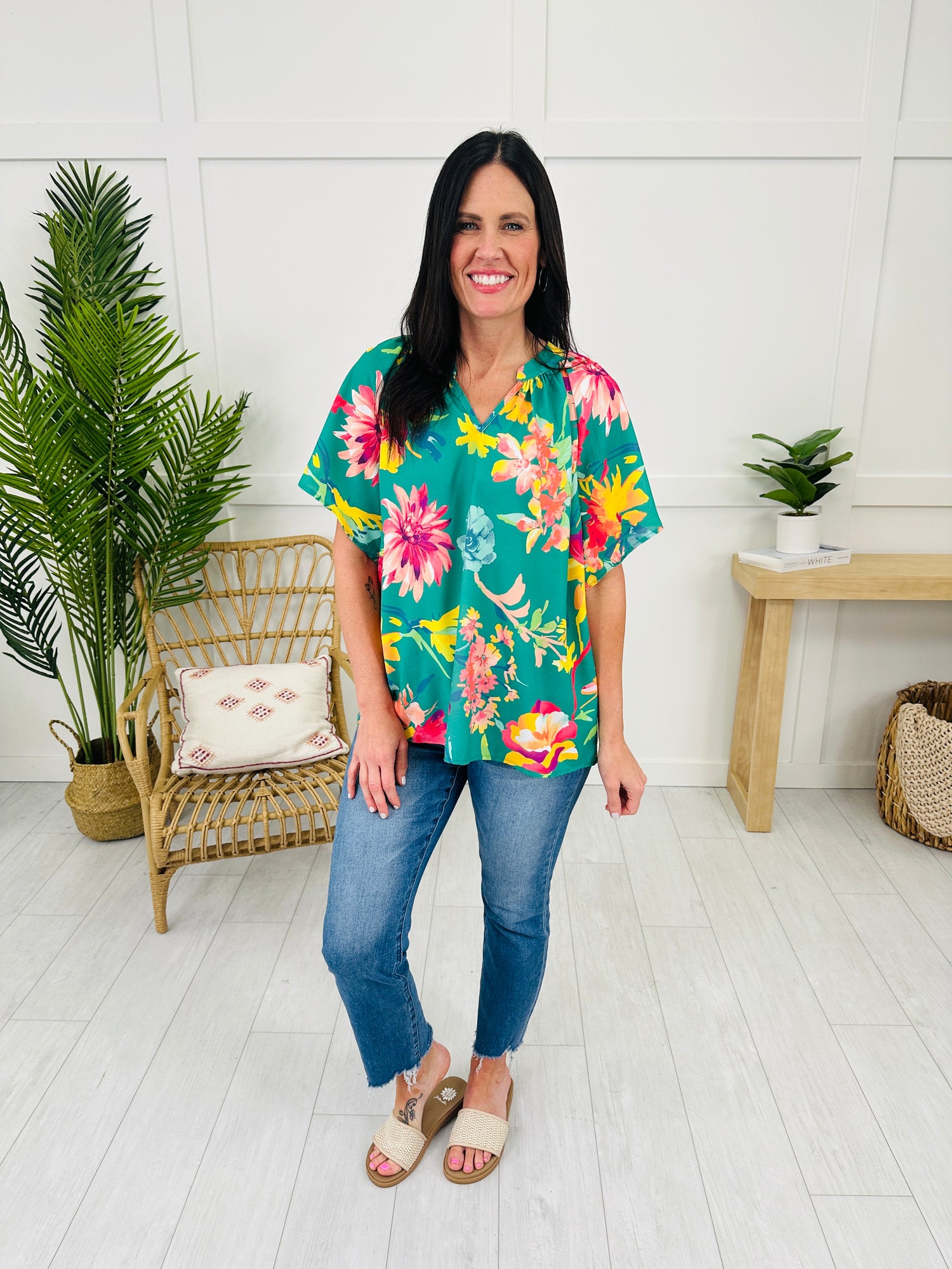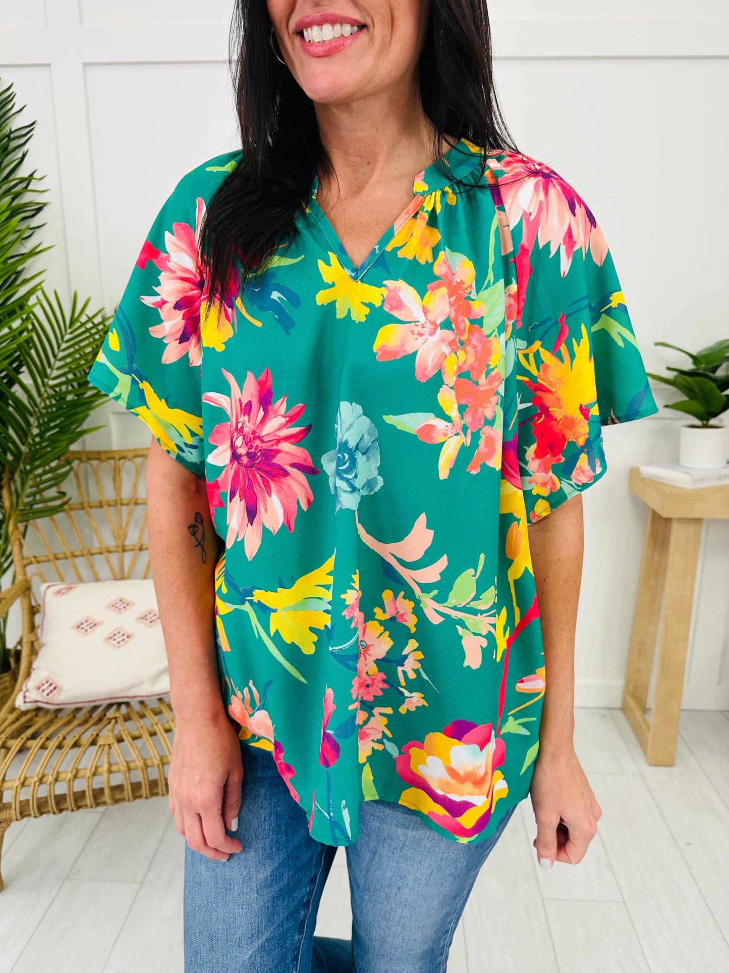 This colorful floral top features a bold, eye-catching print that instantly brightens up any outfit. The flattering v-neck design adds a touch of sophistication, while the flowy, relaxed fit ensures comfort and ease throughout the day. Perfect for pairing with your favorite jeans or skirts, this top is a must-have for adding a playful yet polished look to your wardrobe.